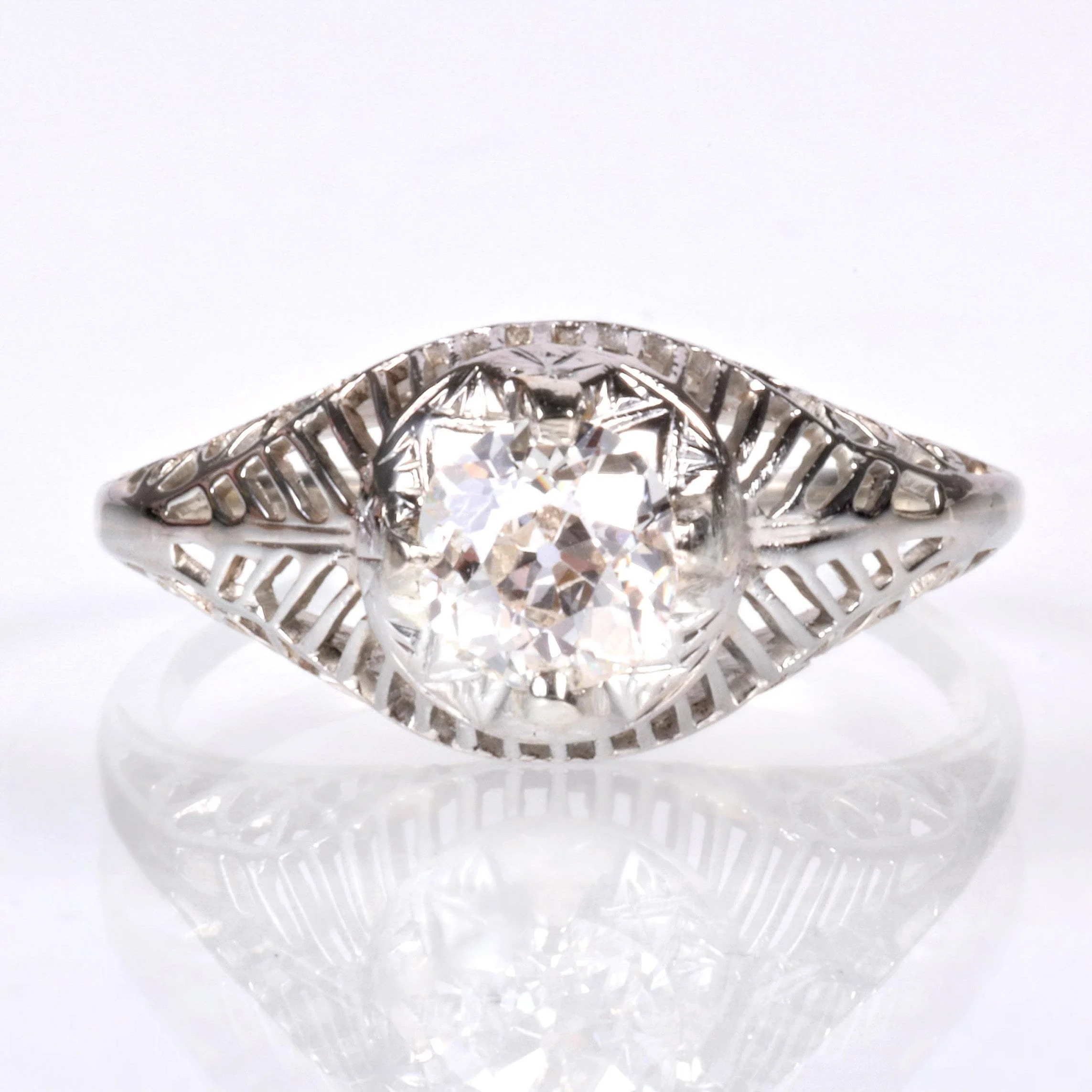 Antique Engagement Ring - Antique 18k White Gold Edwardian Filigree Engagement Ring 1910's 18k White Gold European Cut Diamond =.56ct VS2/H Ring Size 5.75 (sizable) Ring measures approximately 8.5mm at center, back of band is 1.2mm wide.