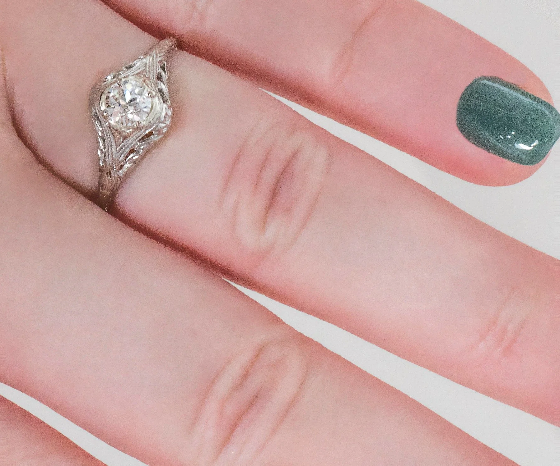Do you have an affinity for the era of flappers, the Titanic, and Christmas time? Yes you say? Then you will love this gorgeous antique diamond ring. Crafted in brilliant 18k white gold, it has a sweet engraving date of "12-25-24" Christmas day! The charming diamond is a European cut surrounded by a soft filigree floral motif.