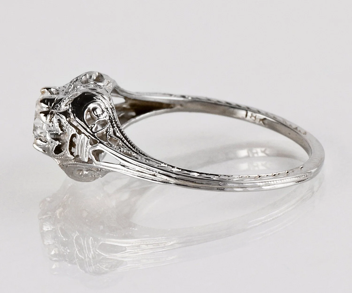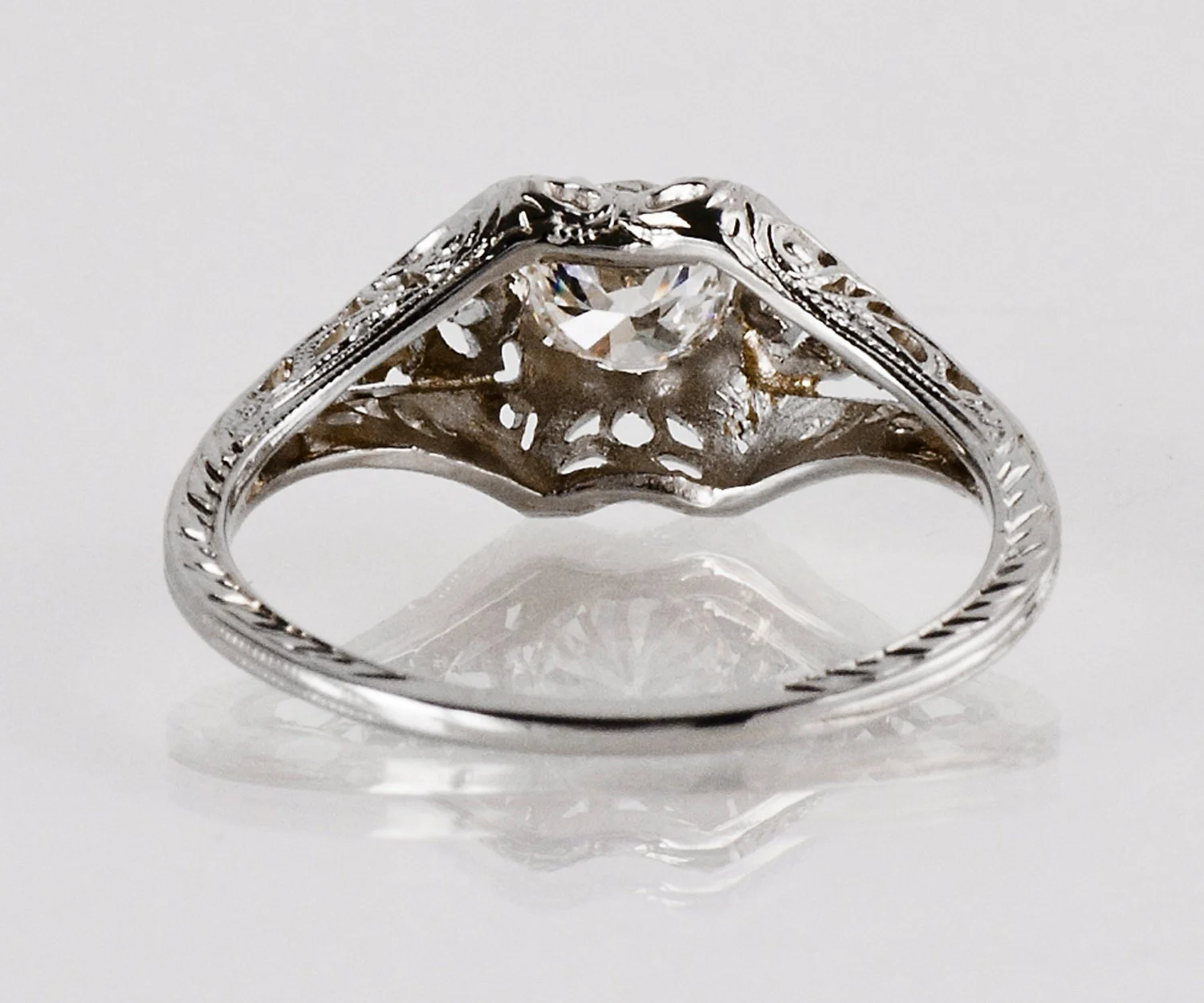 Antique 18K White Gold Filigree Diamond Engagement Ring 18K White Gold Etched Band 1 European Cut Center Diamond =.45ct VVS2/H Ring Size 6-5/8 (ring is sizable) Ring measures approximately 8.2mm at center, band is 1.2mm.