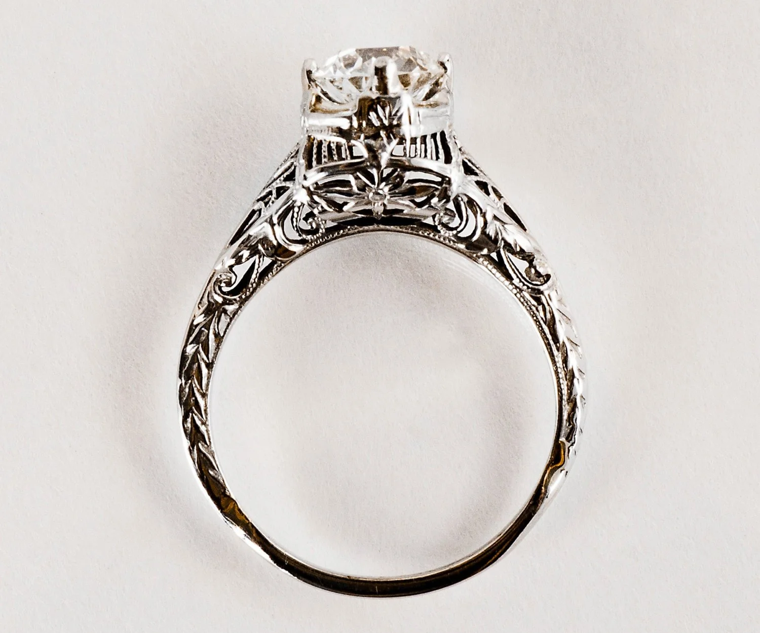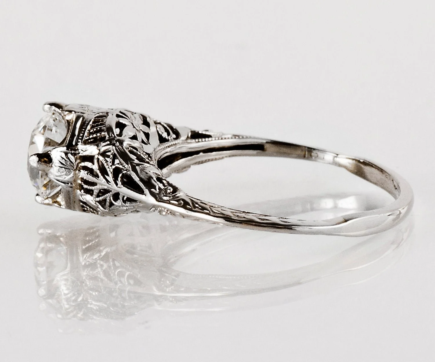 Beautiful intricate wire work and delicate open design describes this captivating antique 18k white gold diamond engagement ring perfectly. At the center sits a lovely European cut diamond at over a carat. This sweet ring is eye-catching from every angle, with no shortage of crisp engraved design and fine filigree galore. Absolutely stunning from every single angle.