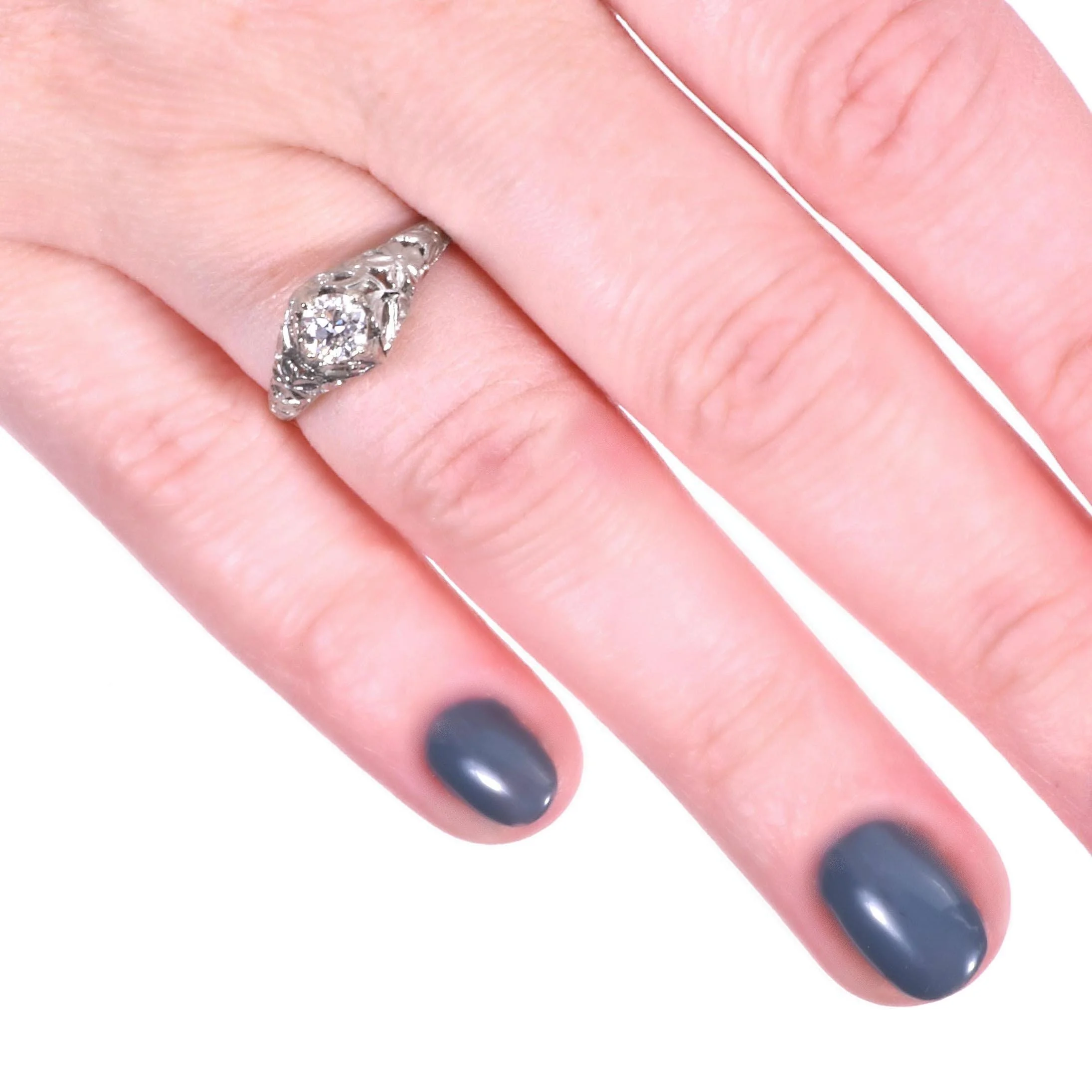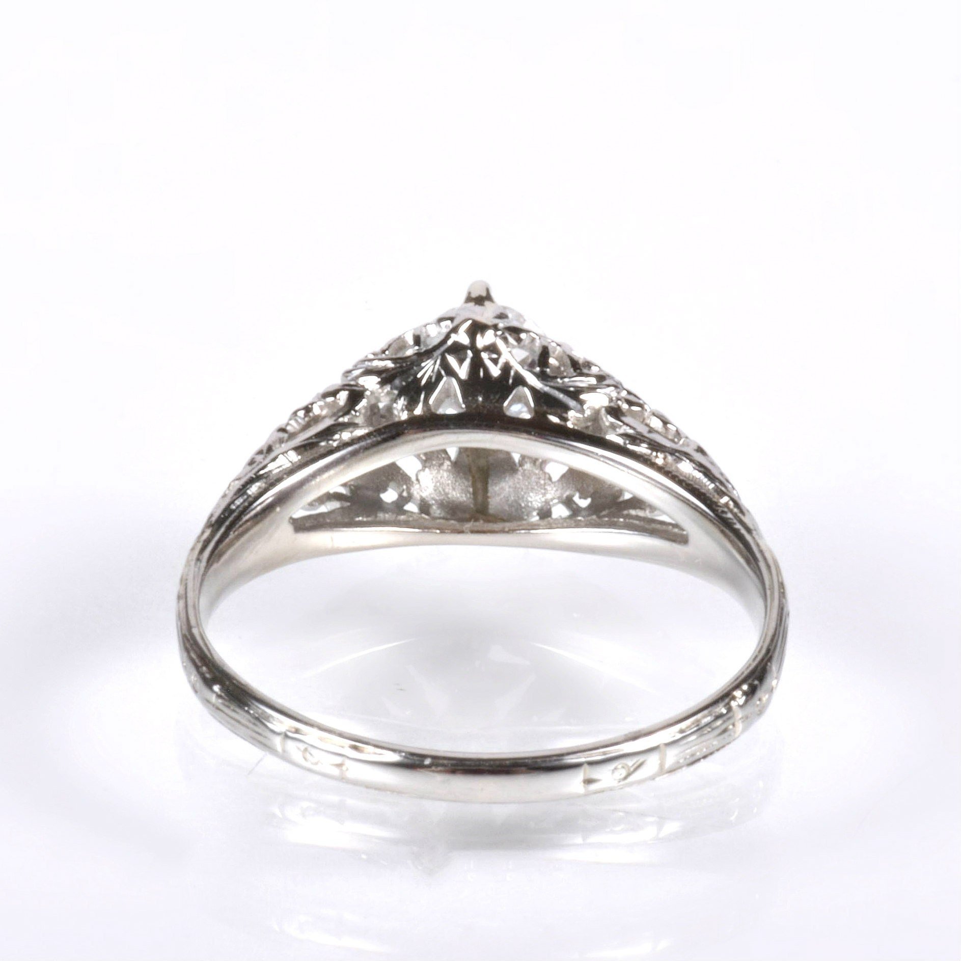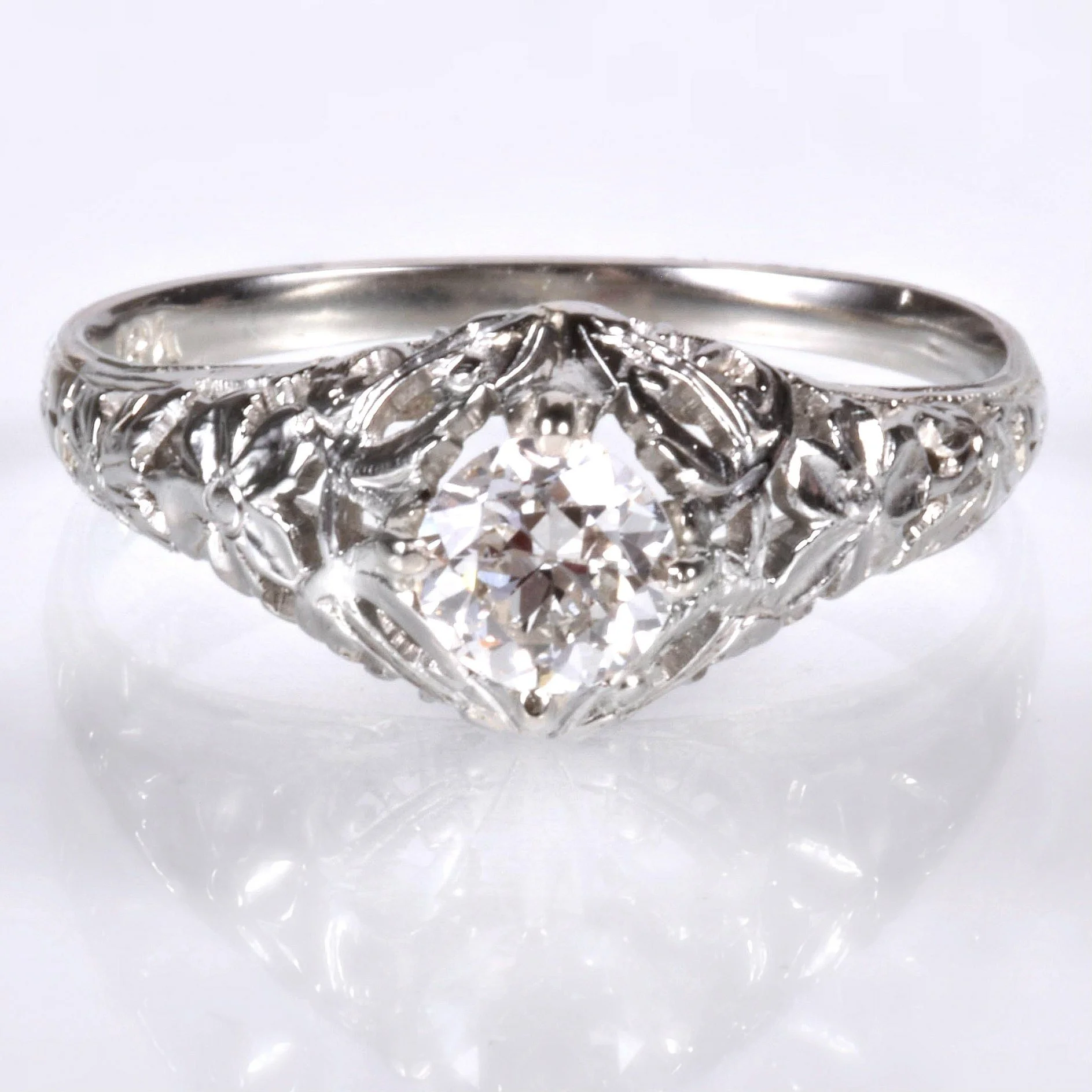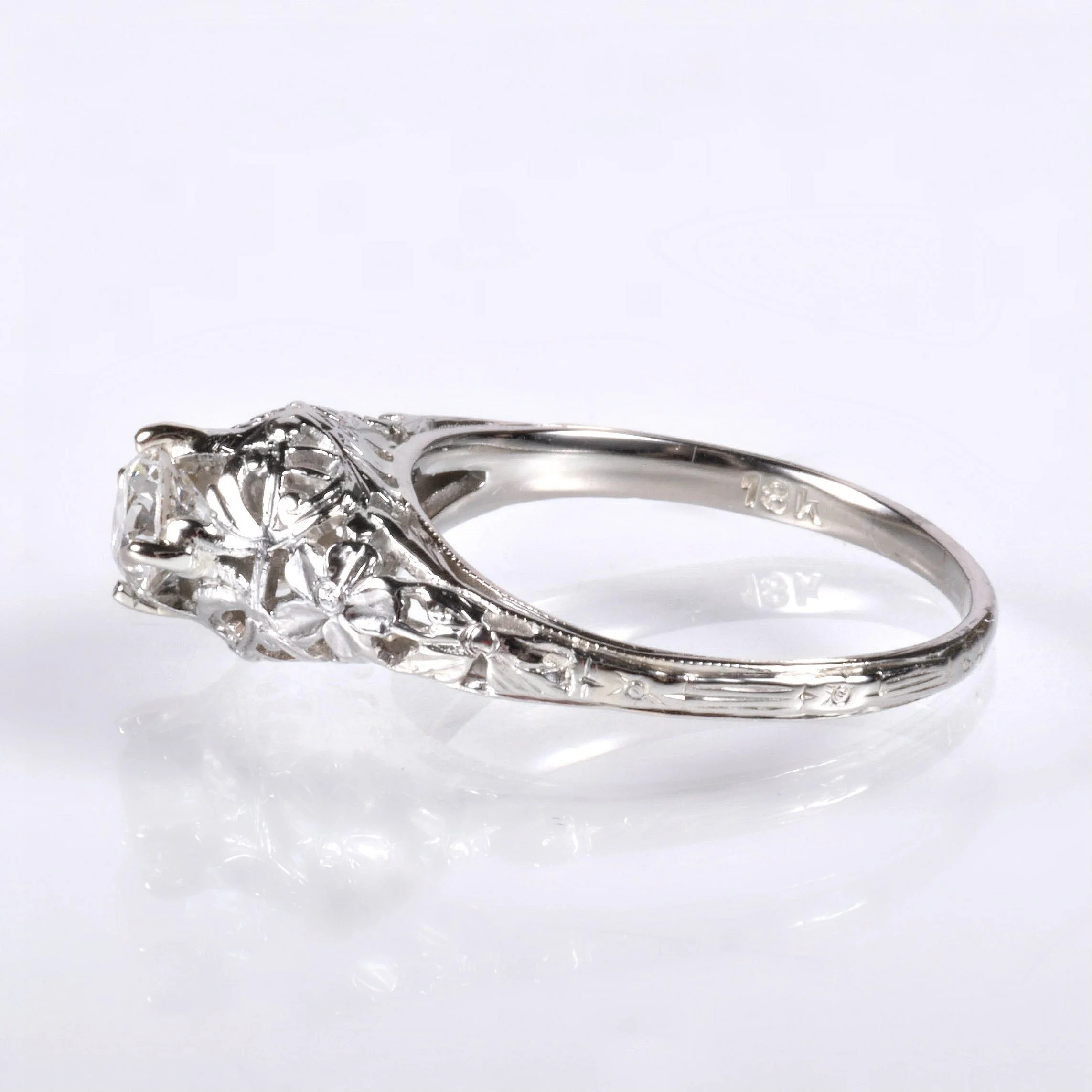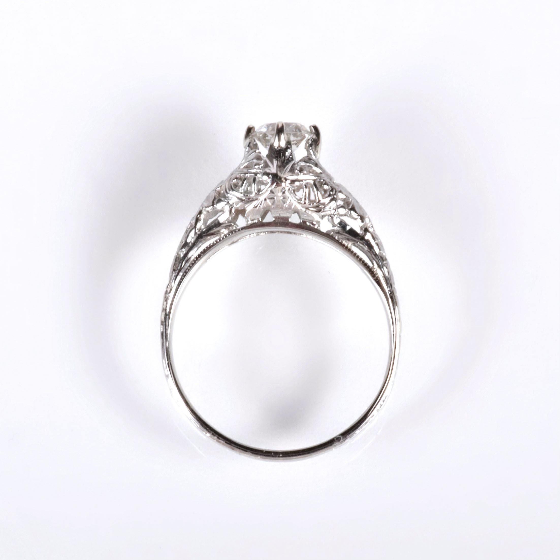 Antique Engagement Ring - Antique 18k White Gold Floral Design Diamond Engagement Ring 18k White Gold European Cut Diamond =.41ct SI1/G Ring Size 6 (sizable) Ring measures approximately 7.8mm at center, back of band is 1.7mm wide.