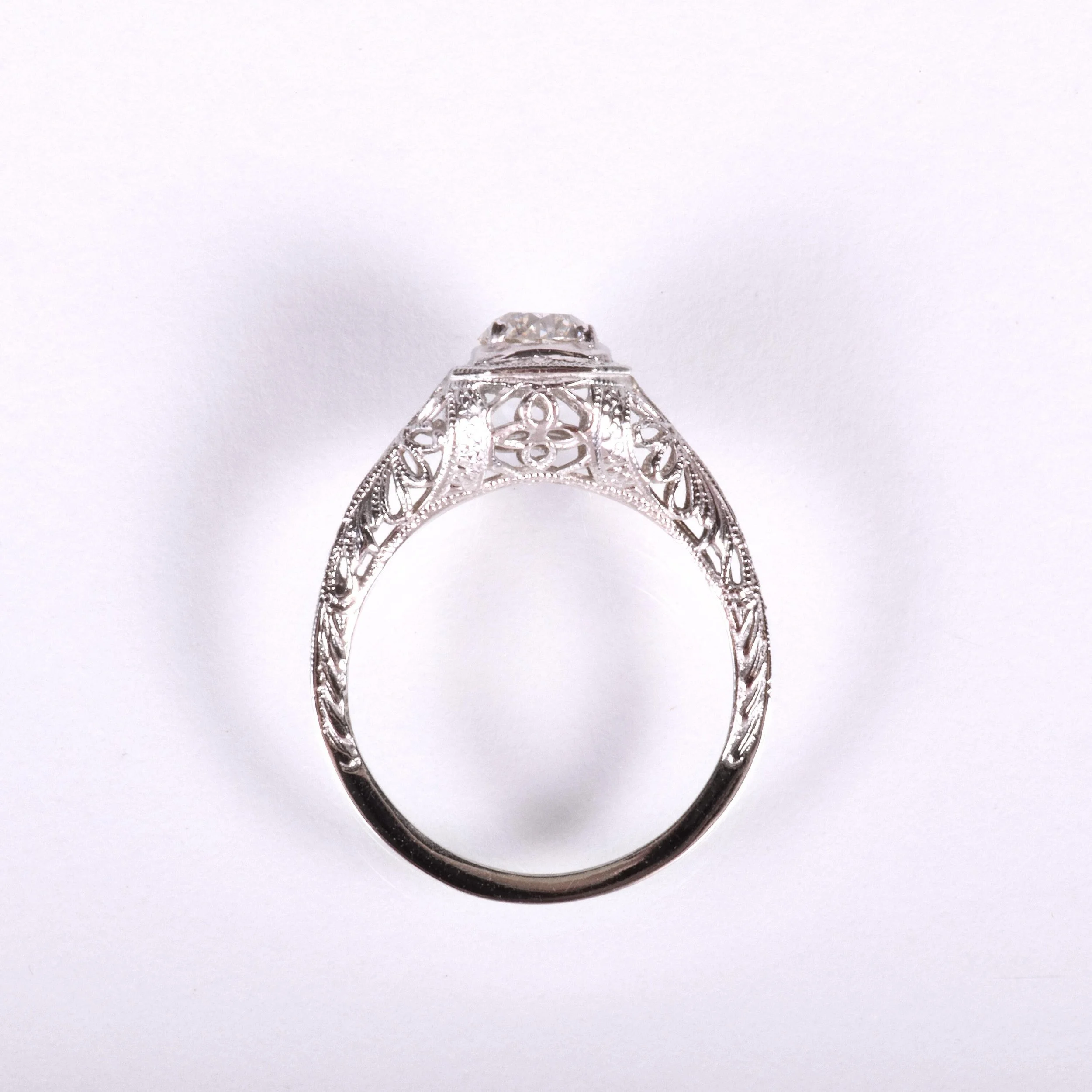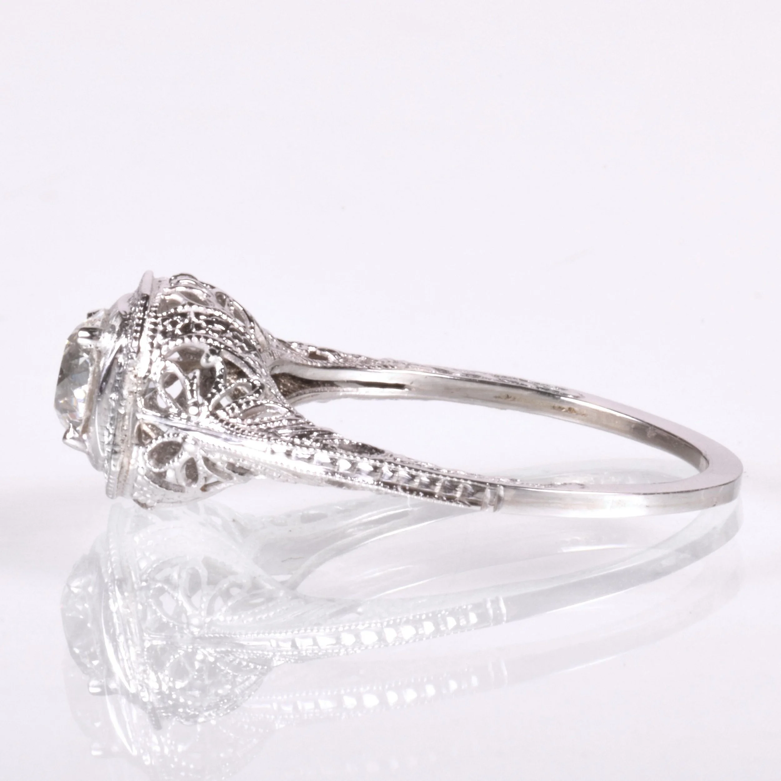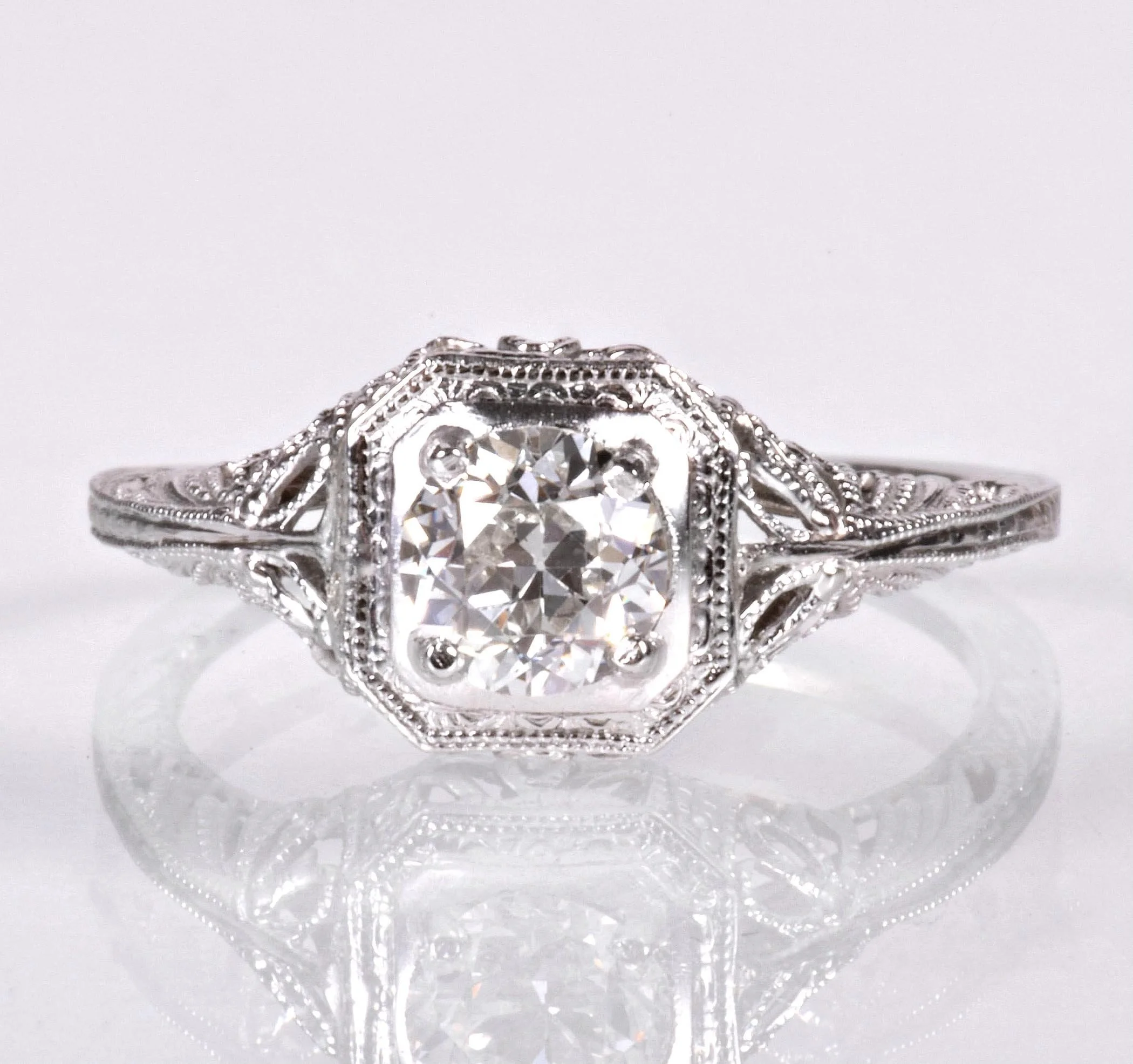 Antique Engagement Ring - Antique 18k White Gold Floral Filigree Engagement Ring Circa late 1910's 18k White Gold European Cut Diamond =.60ct VS2/H (GIA Certed) Ring Size 6 (sizable) Ring measures approximately 8.3mm at center. Back of band measures 1mm wide with a 1.5mm rise.