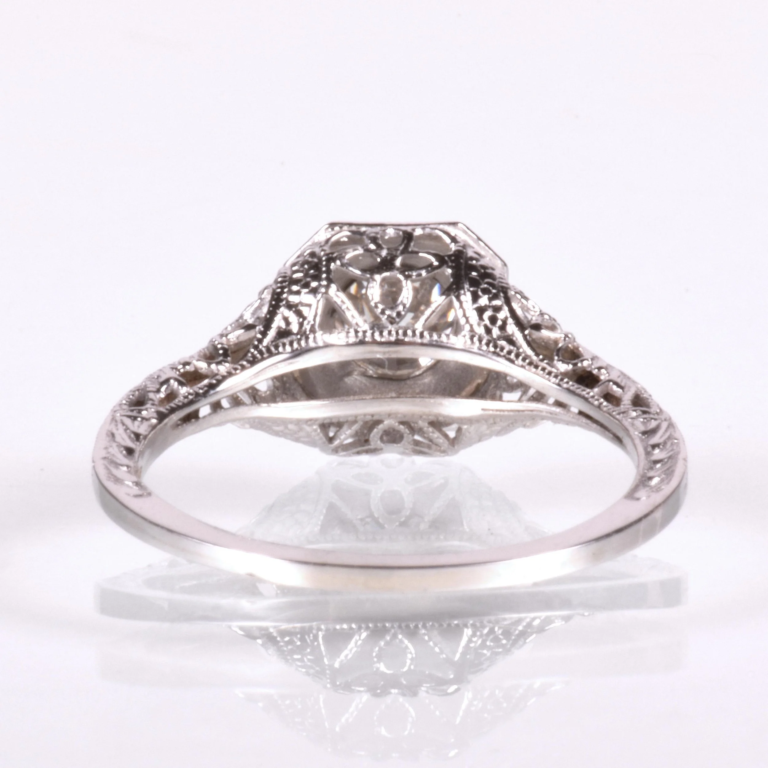 Antique Engagement Ring - Antique 18k White Gold Floral Filigree Engagement Ring Circa late 1910's 18k White Gold European Cut Diamond =.60ct VS2/H (GIA Certed) Ring Size 6 (sizable) Ring measures approximately 8.3mm at center. Back of band measures 1mm wide with a 1.5mm rise.