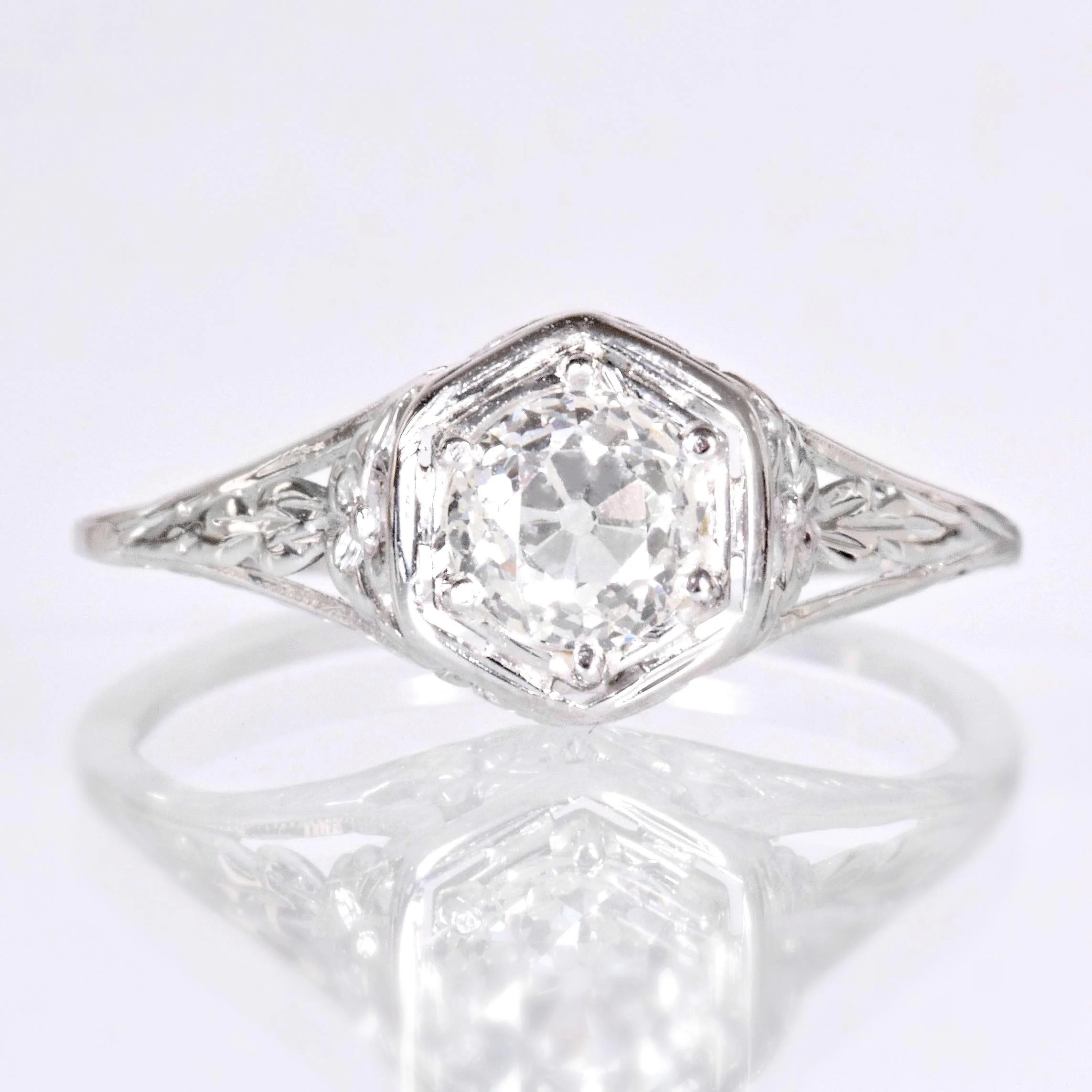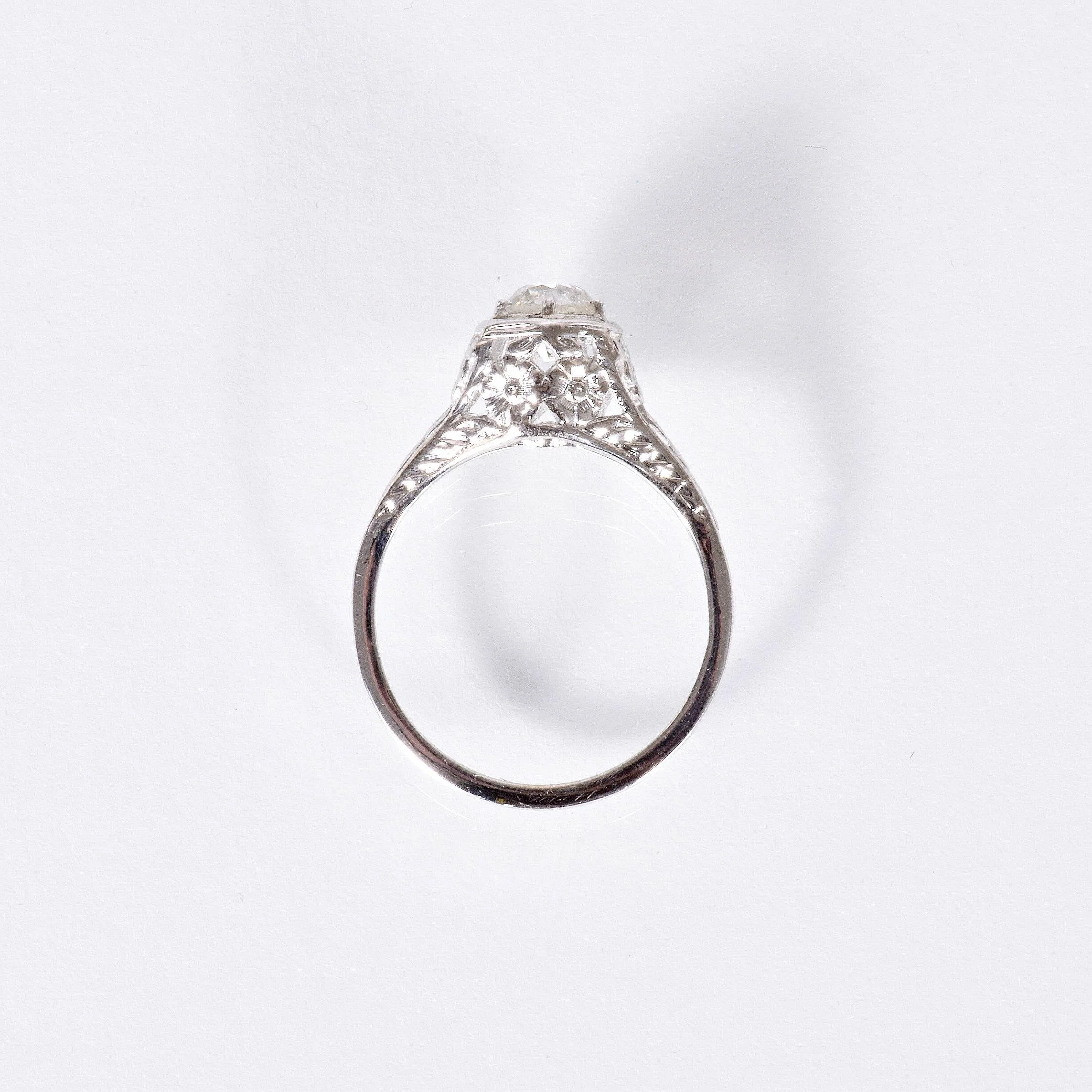 Antique Engagement Ring - Antique 18k White Gold Floral Motif Diamond Ring Circa 1920's 18k White Gold European Cut Diamond =.61ct SI1/H Ring Size 5.5 (sizable) Ring measures approximately 7.9mm wide at center. Back of band is .8mm wide with a 1.3mm rise.