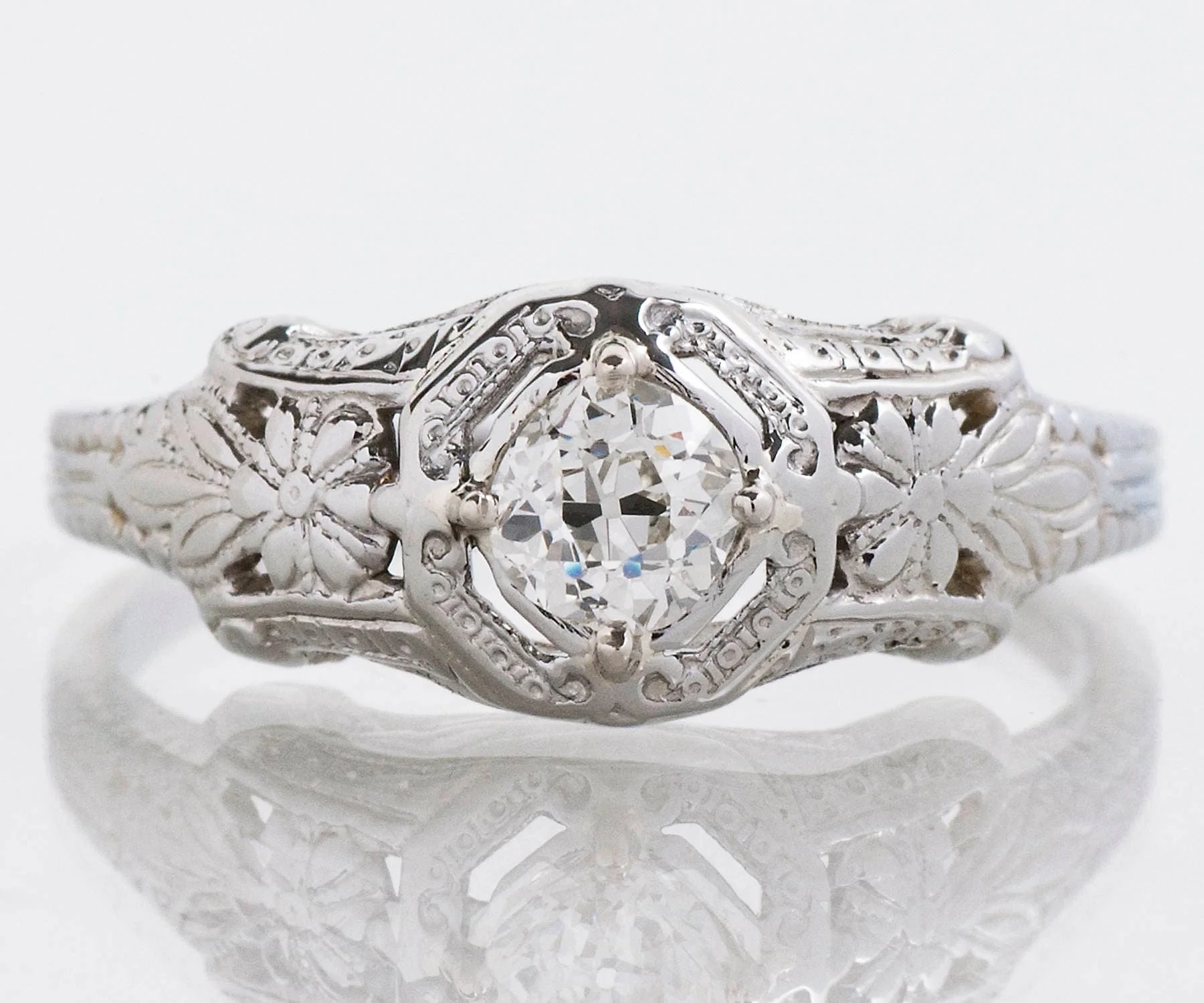 Antique Engagement Ring - Antique 18k White Gold Flower Design Diamond Engagement Ring 18k White Gold European Cut Center Diamond =.38ct VS1/G Ring Size 7.75 (ring is sizable) Ring measures approximately 7.9mm wide at center, back of band is 1.8mm wide.