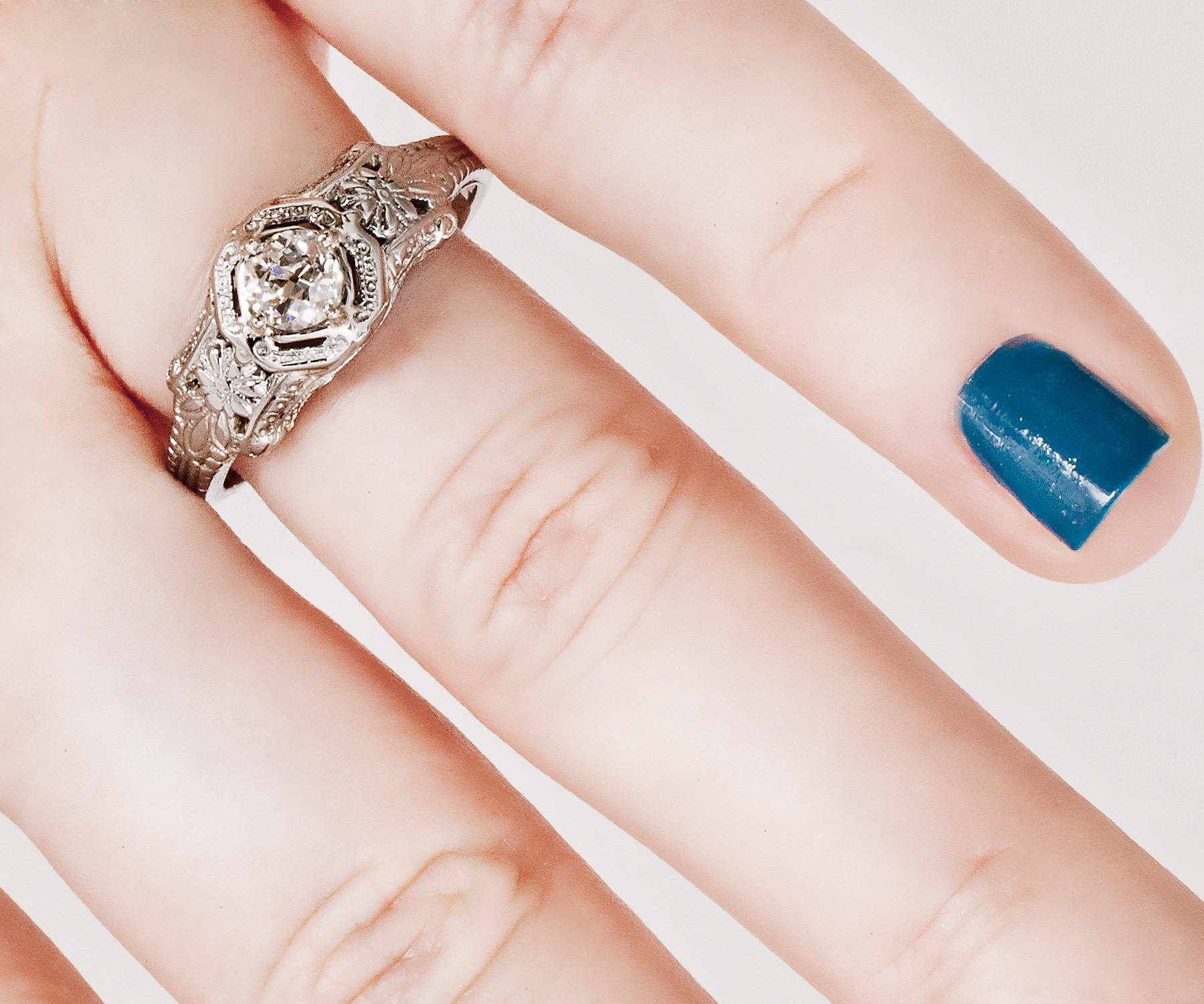 With so much detail encompassing this antique 18 k white gold diamond engagement ring, it's hard to know where to begin. This little treasure is denser than most and can easily stand alone without a band accompanying it. Very feminine details, including tiny blossoms which certainly bring the charm out in this beauty from the 1920's!