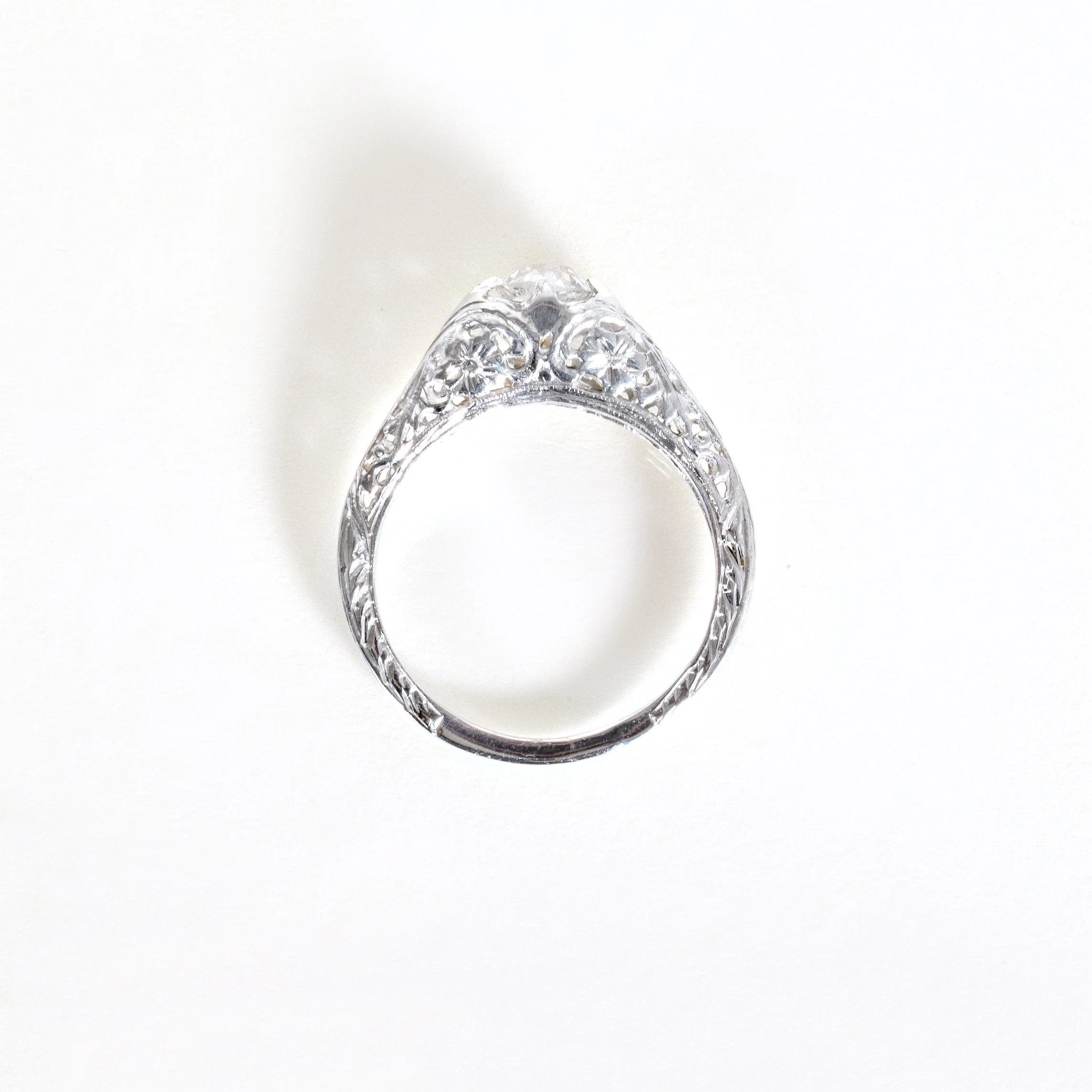 The charm of choosing a mine-cut diamond for your engagement ring is the fact that the facets were hand cut and the diamond was shaped by a very skilled craftsman. Because of this, you will see some asymmetry, adding to the uniqueness of these diamonds, making each of them one-of-a-kind. This 18k white gold engagement ring boasts a stunning just above 1/2 carat icy white old mine-cut diamond at the center. The setting is truly sublime, with crisp, flowery engraving all around!