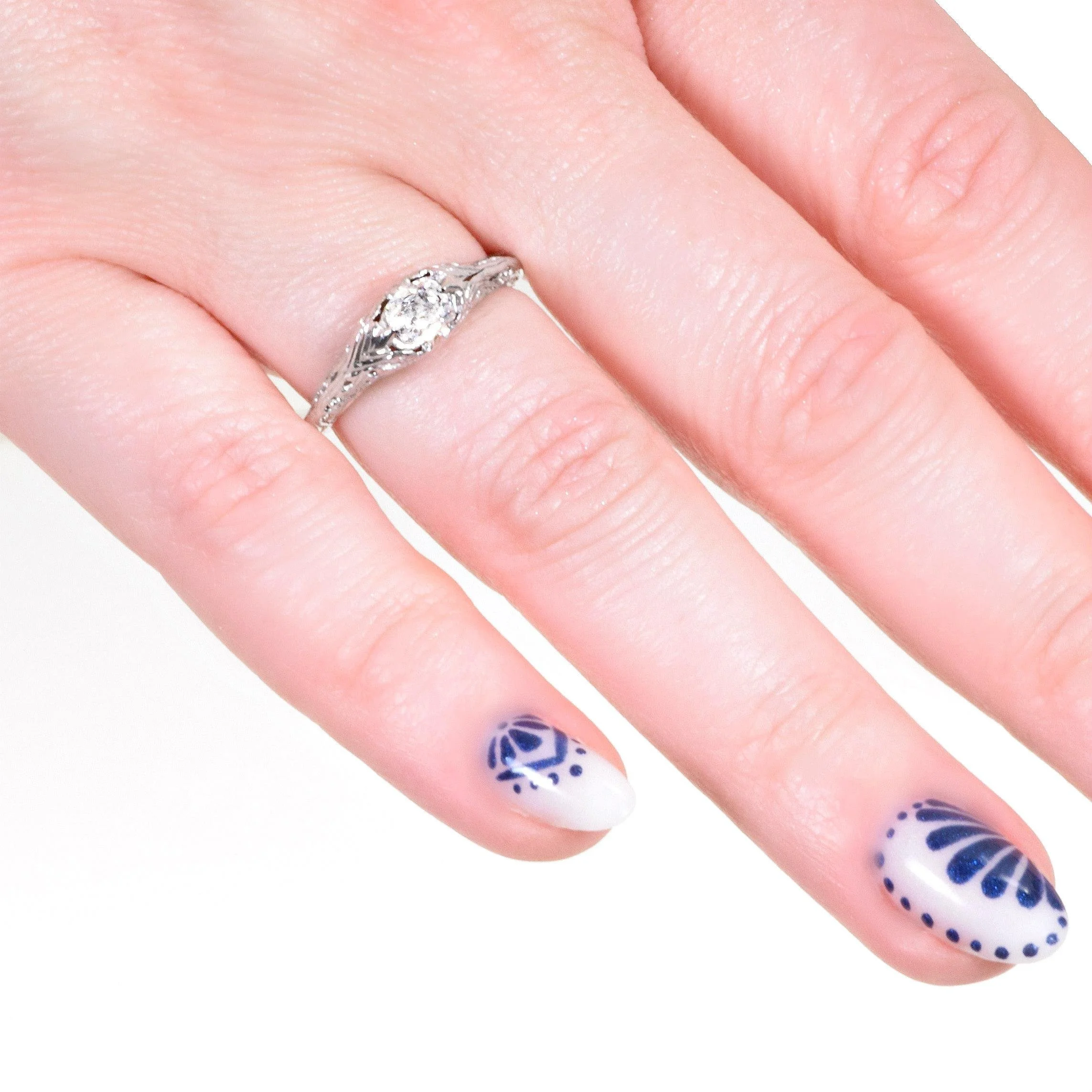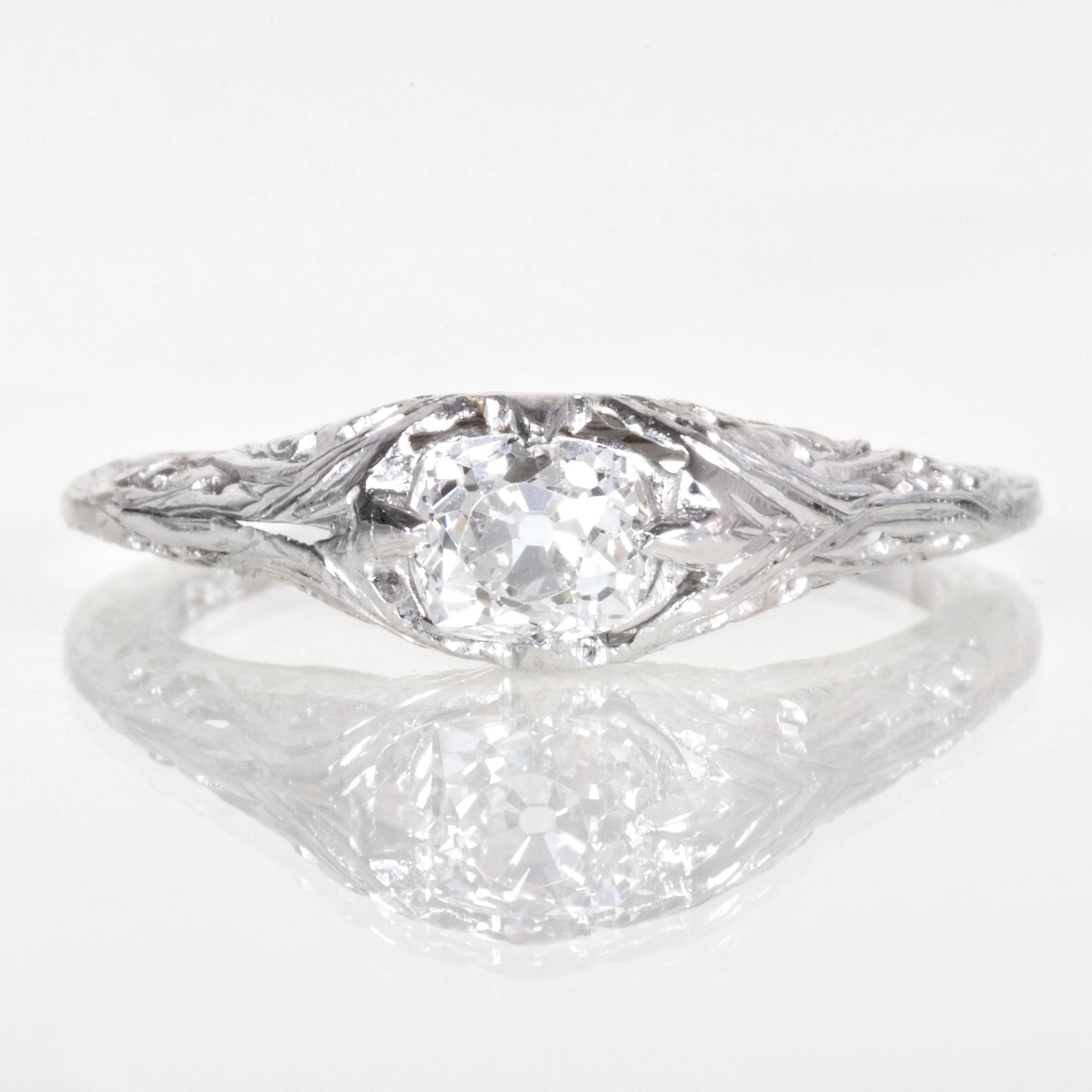 The charm of choosing a mine-cut diamond for your engagement ring is the fact that the facets were hand cut and the diamond was shaped by a very skilled craftsman. Because of this, you will see some asymmetry, adding to the uniqueness of these diamonds, making each of them one-of-a-kind. This 18k white gold engagement ring boasts a stunning just above 1/2 carat icy white old mine-cut diamond at the center. The setting is truly sublime, with crisp, flowery engraving all around!