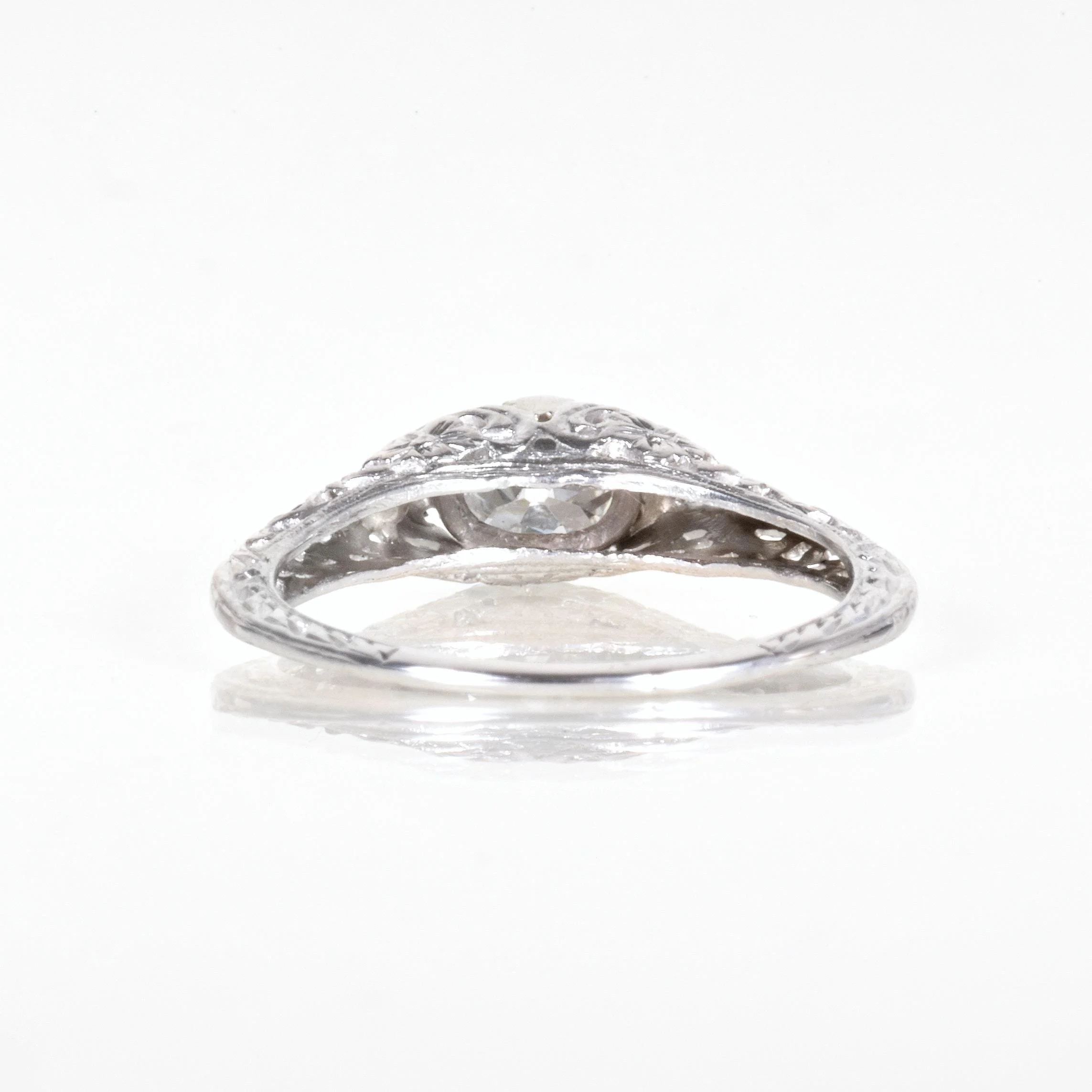 Antique Engagement Ring- Antique 18k White Gold Mine Cut Diamond Filigree Ring 1910's 18k White Gold Old Mine Cut Diamond =.53ct VS/F Ring Size 5.75 (sizable) Ring measures approximately 5.59mm wide at center. Back of band measures 1.4mm wide in one direction and .9mm in the other.