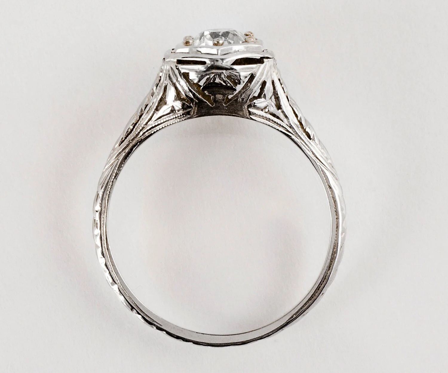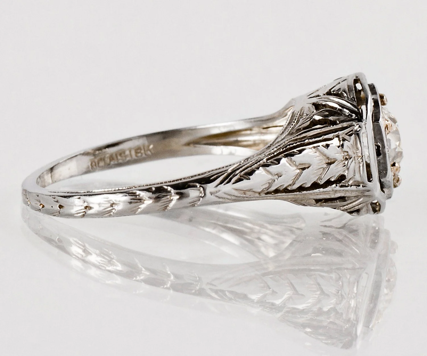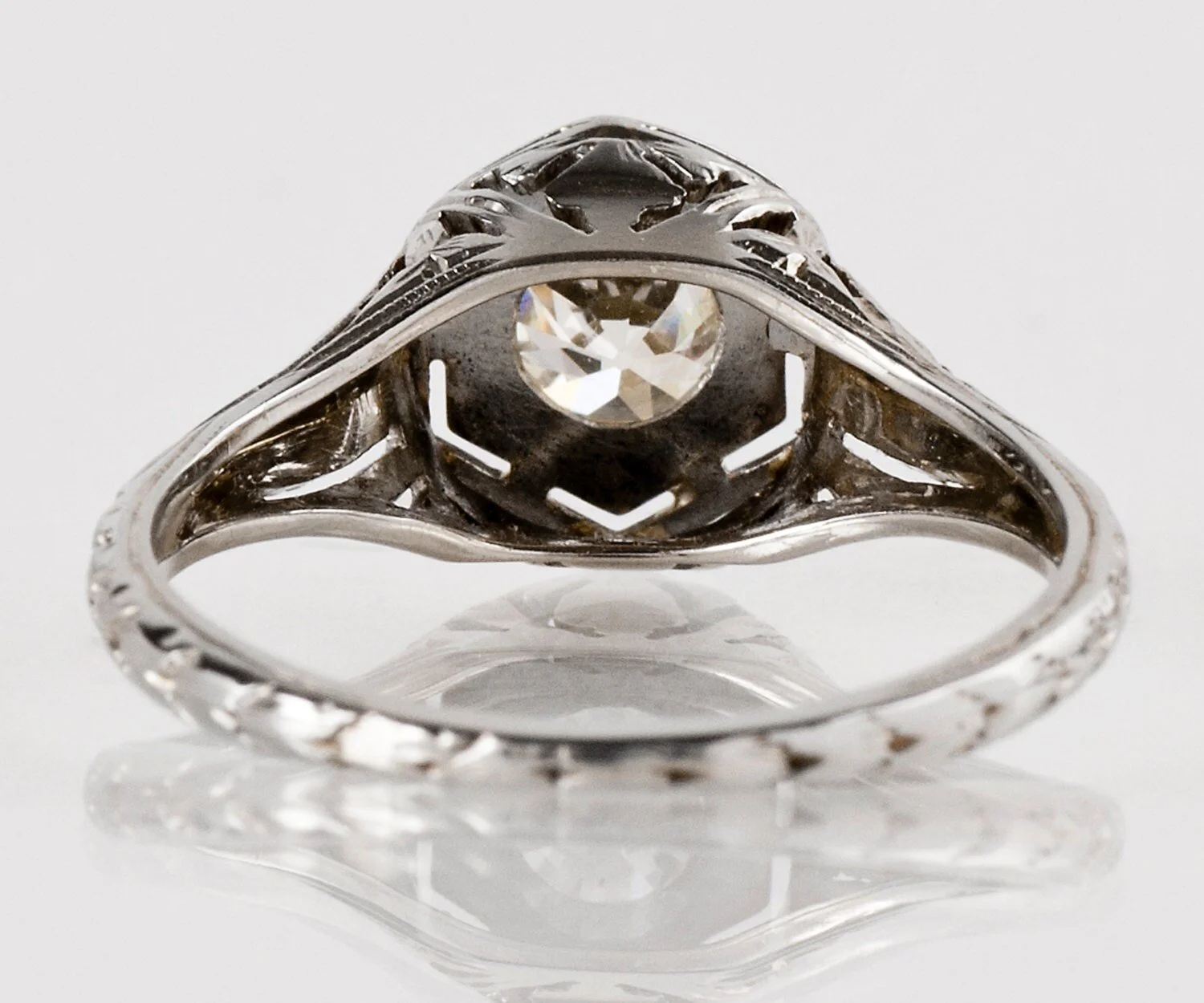 The Belais brothers were renowned for being among the first jewelry designers to use white gold in the United States. This stunning ring is a wonderful example of their attention to detail and fine craftsmanship. A sparkling European cut diamond sits in an exquisite floral setting with truly breathtaking filigree detailing in this magnificent antique treasure. This one-of-a-kind engagement ring will suit an equally special bride-to-be.