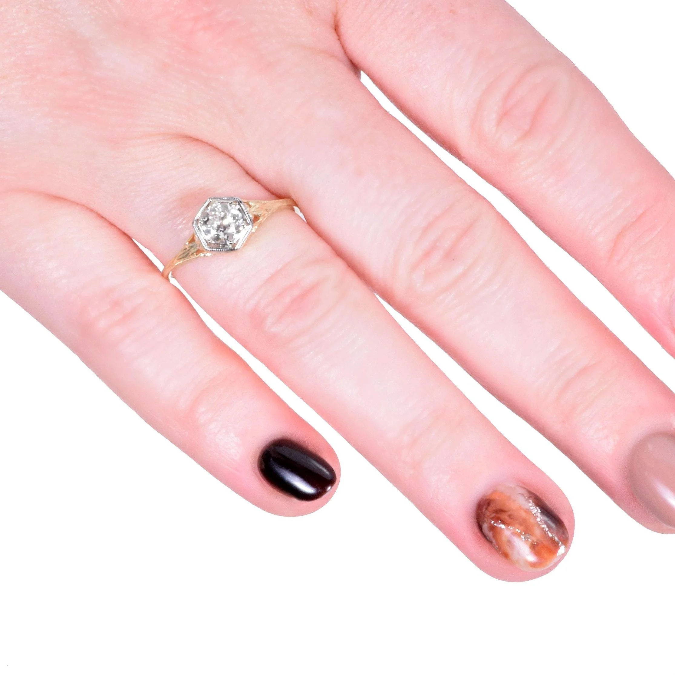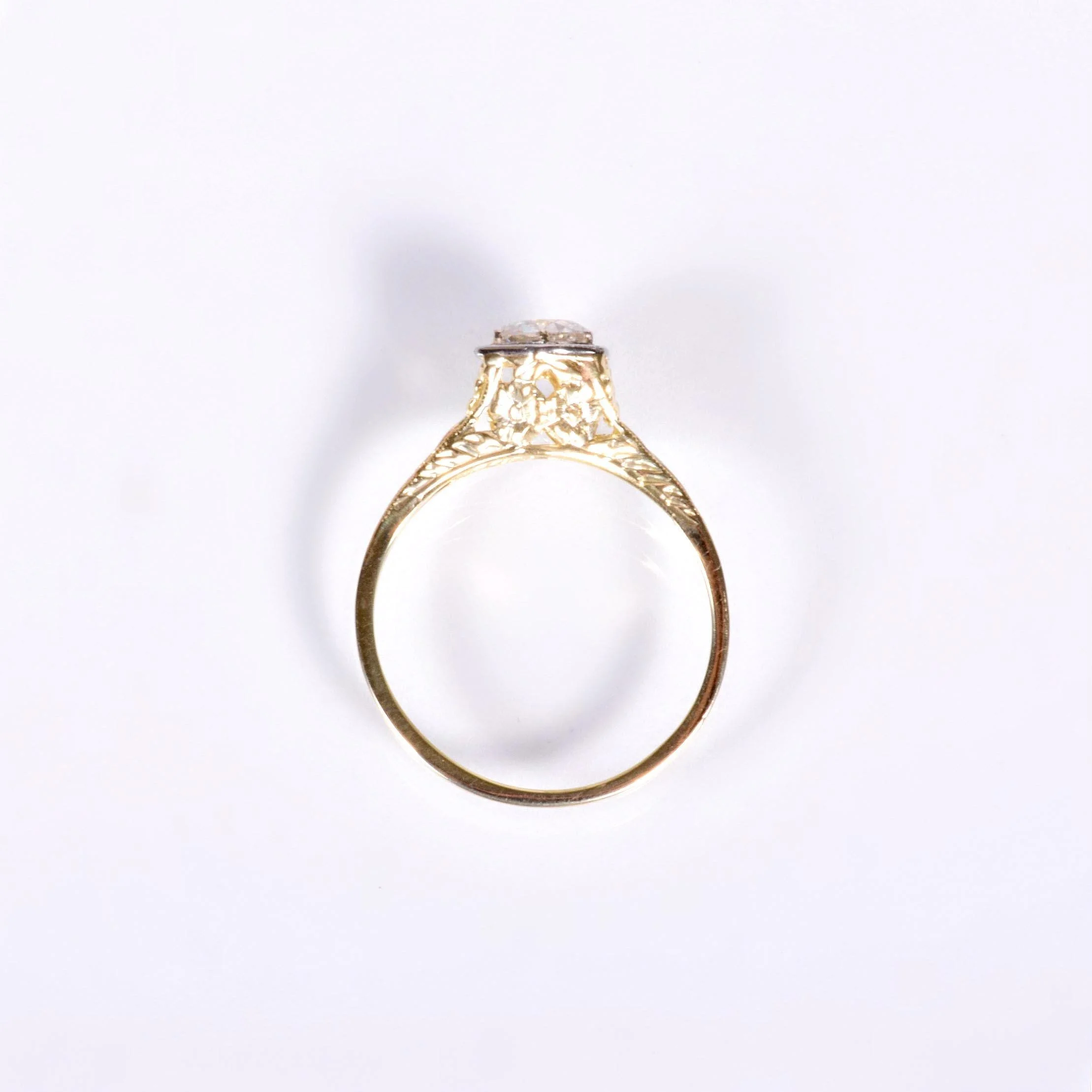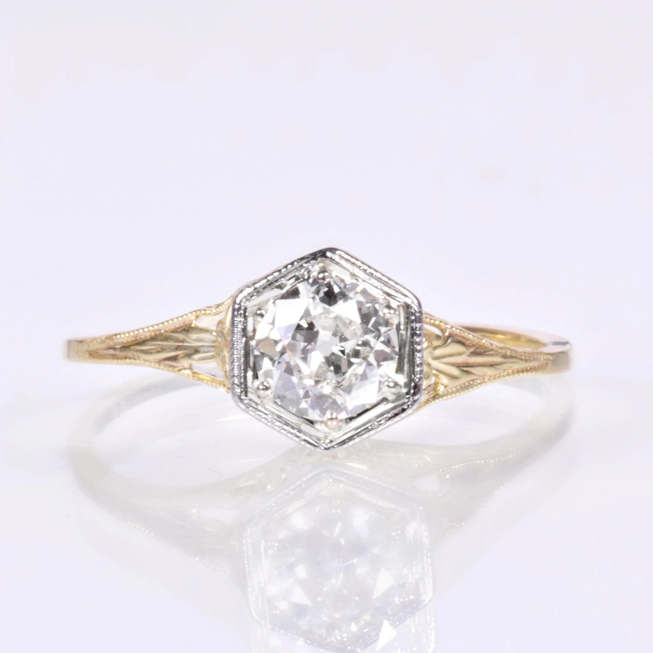 Bright and light is a great way to describe our 1910's 14k diamond engagement ring. Crafted in both yellow and white gold, the white gold portion being the six-sided bezel and prongs holding tight to a knockout European cut diamond! Delicate open pierced work is lacy and captivating, so much so that you may be caught gazing at its dreamy beauty regularly! This antique treasure will pair well with either a modern or antique wedding band.