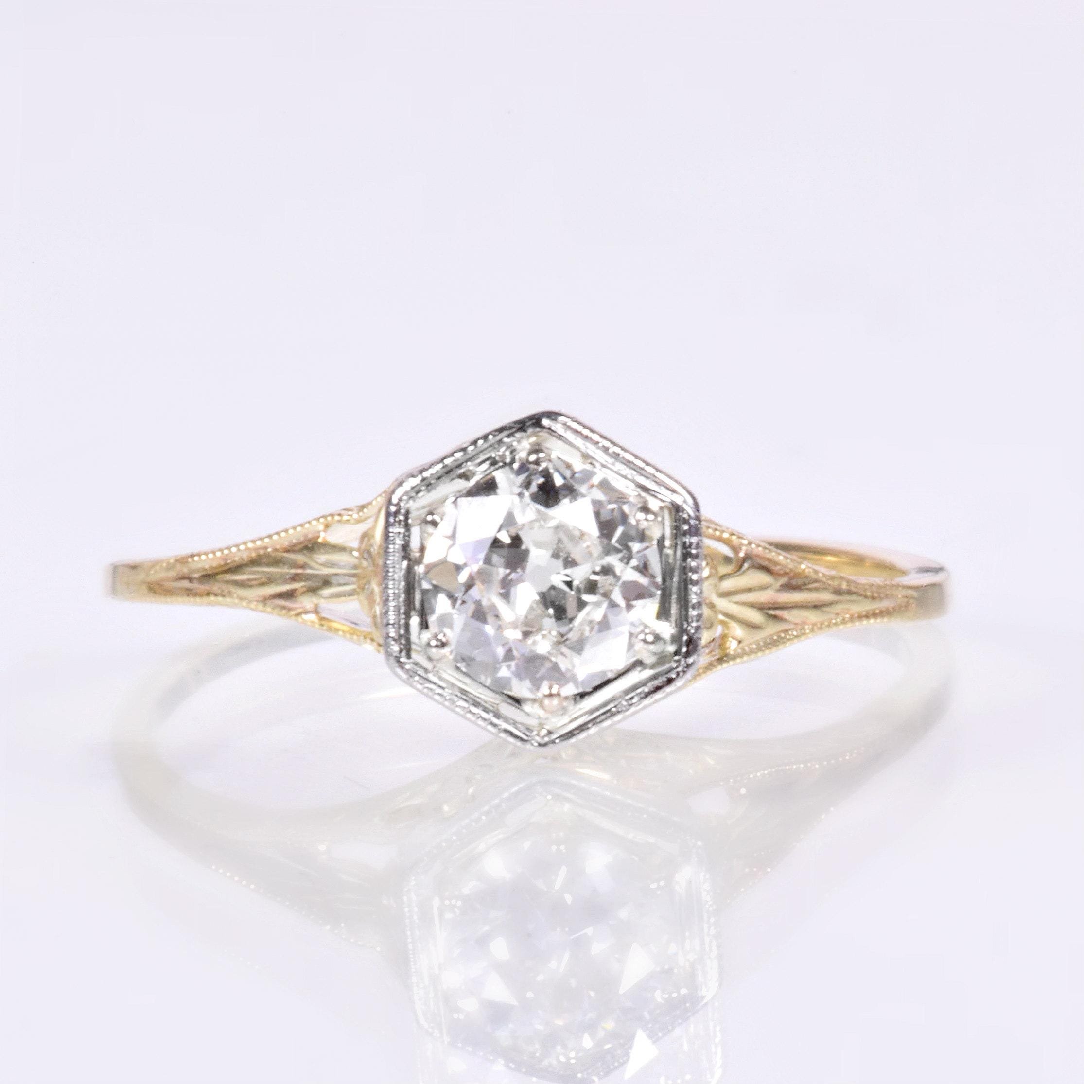 Antique Engagement Ring - Antique 1910's 14k Two-Tone Diamond Engagement Ring Circa 1910's 14k Yellow & White Gold European Cut Diamond =.55ct VVS2/G Ring Size 7.5 (sizable) Ring measures approximately 7.8mm wide at center, back of the band is 1mm wide.