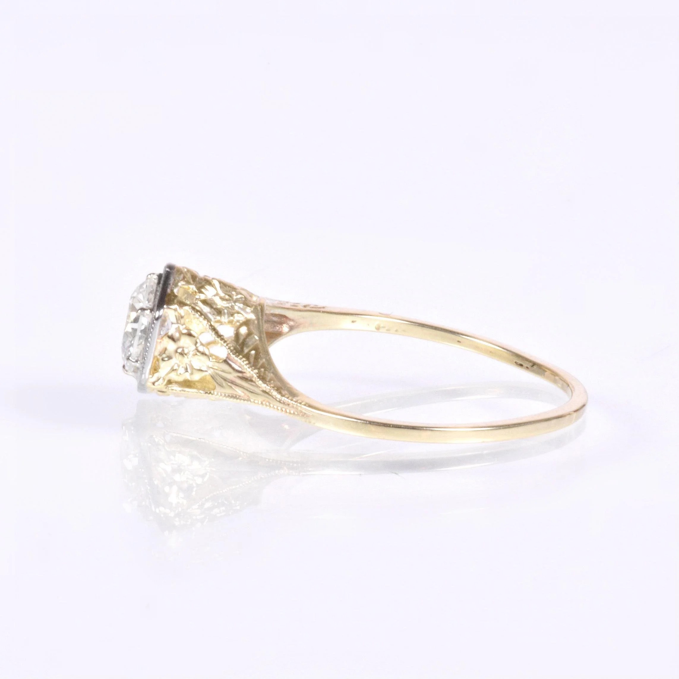 Antique Engagement Ring - Antique 1910's 14k Two-Tone Diamond Engagement Ring Circa 1910's 14k Yellow & White Gold European Cut Diamond =.55ct VVS2/G Ring Size 7.5 (sizable) Ring measures approximately 7.8mm wide at center, back of the band is 1mm wide.