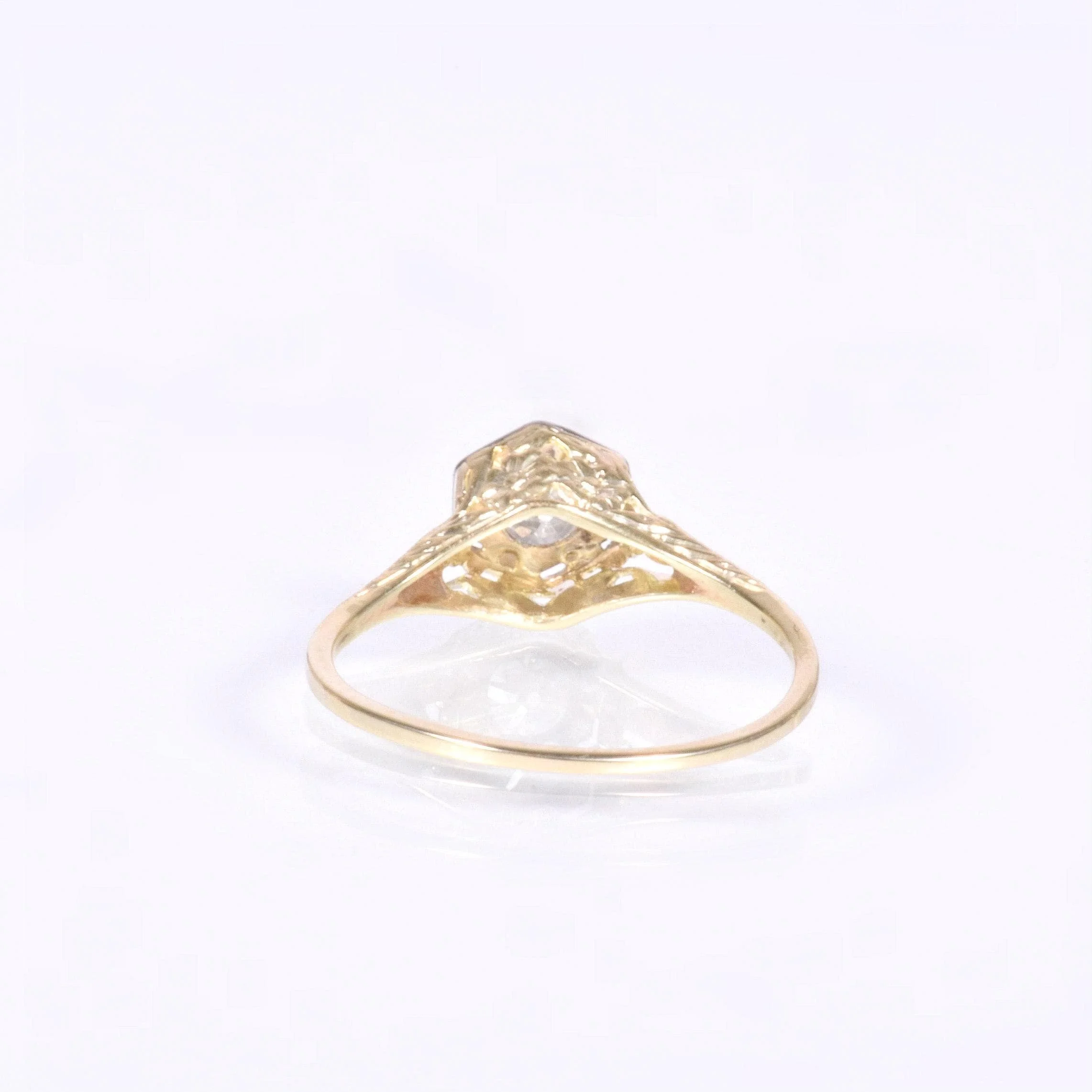 Bright and light is a great way to describe our 1910's 14k diamond engagement ring. Crafted in both yellow and white gold, the white gold portion being the six-sided bezel and prongs holding tight to a knockout European cut diamond! Delicate open pierced work is lacy and captivating, so much so that you may be caught gazing at its dreamy beauty regularly! This antique treasure will pair well with either a modern or antique wedding band.