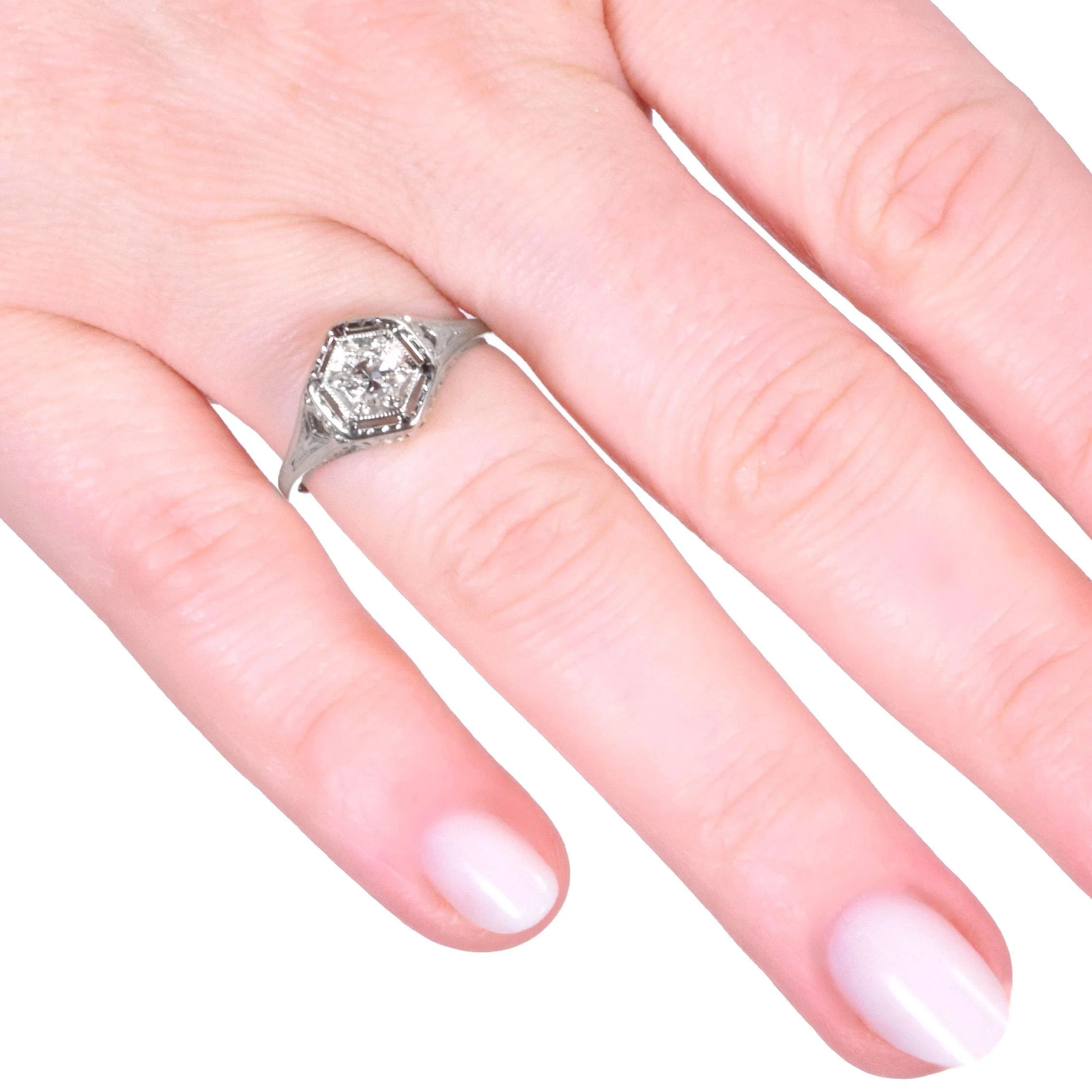 This stunner of an antique diamond engagement ring is more than ready to make its second debut with you! This beauty is from the 1910's, more that 100 years ago and has held her age very well. Crafted in 14k white gold, a lovely icy white European cut diamond sits within a striking hexagonal setting finished in fine milgrain. This treasure can stand on its own or easily be paired with either an antique or modern wedding band.