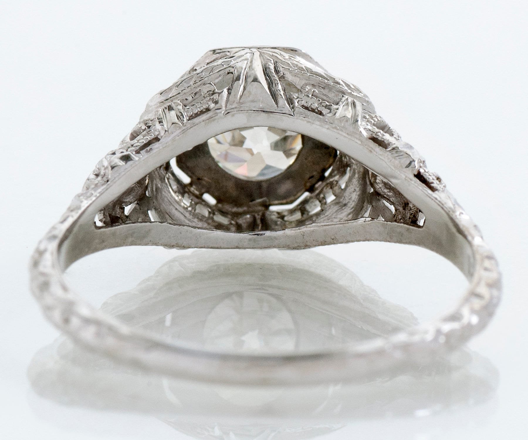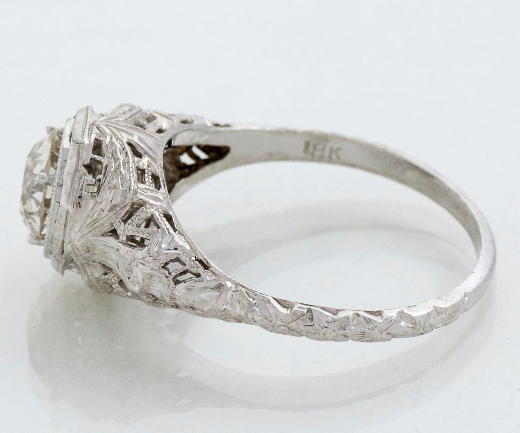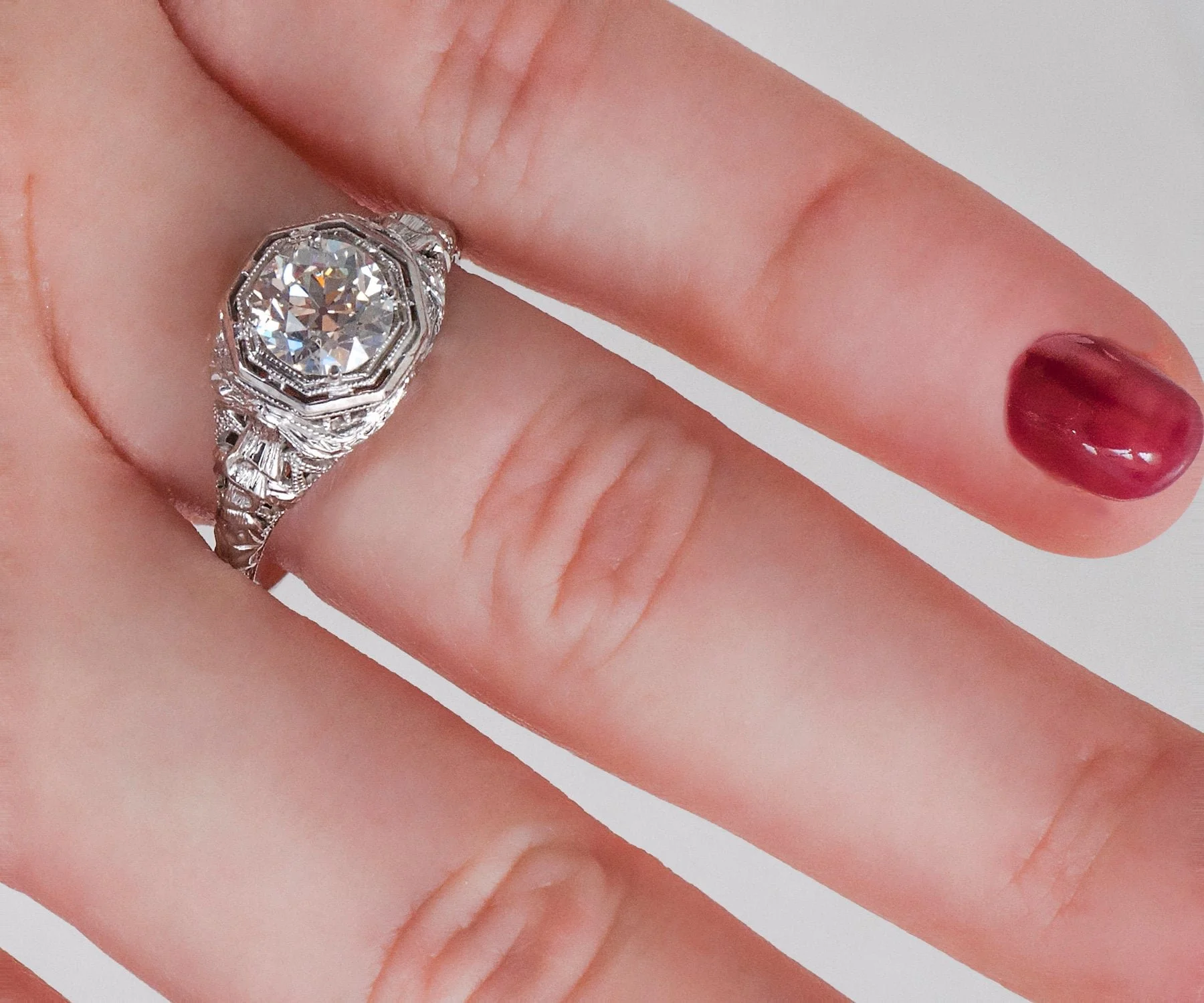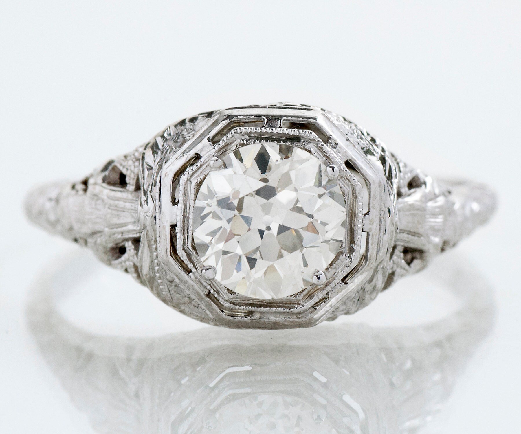 A double bezel surrounds a fine European cut diamond in this octagonal shaped setting, created in 18k white gold. Lovely filigree work is seen from every angle. Coming to us from the very early 1900's, this beauty has already enjoyed a long, happy life and you would never know it by looking at her! Continue this ring's journey through your happily married life and pass down one day to someone special.