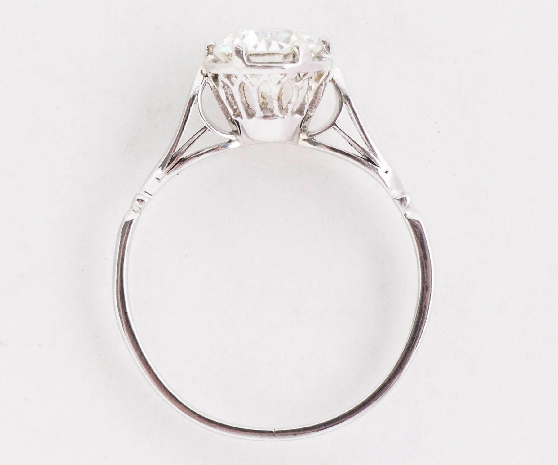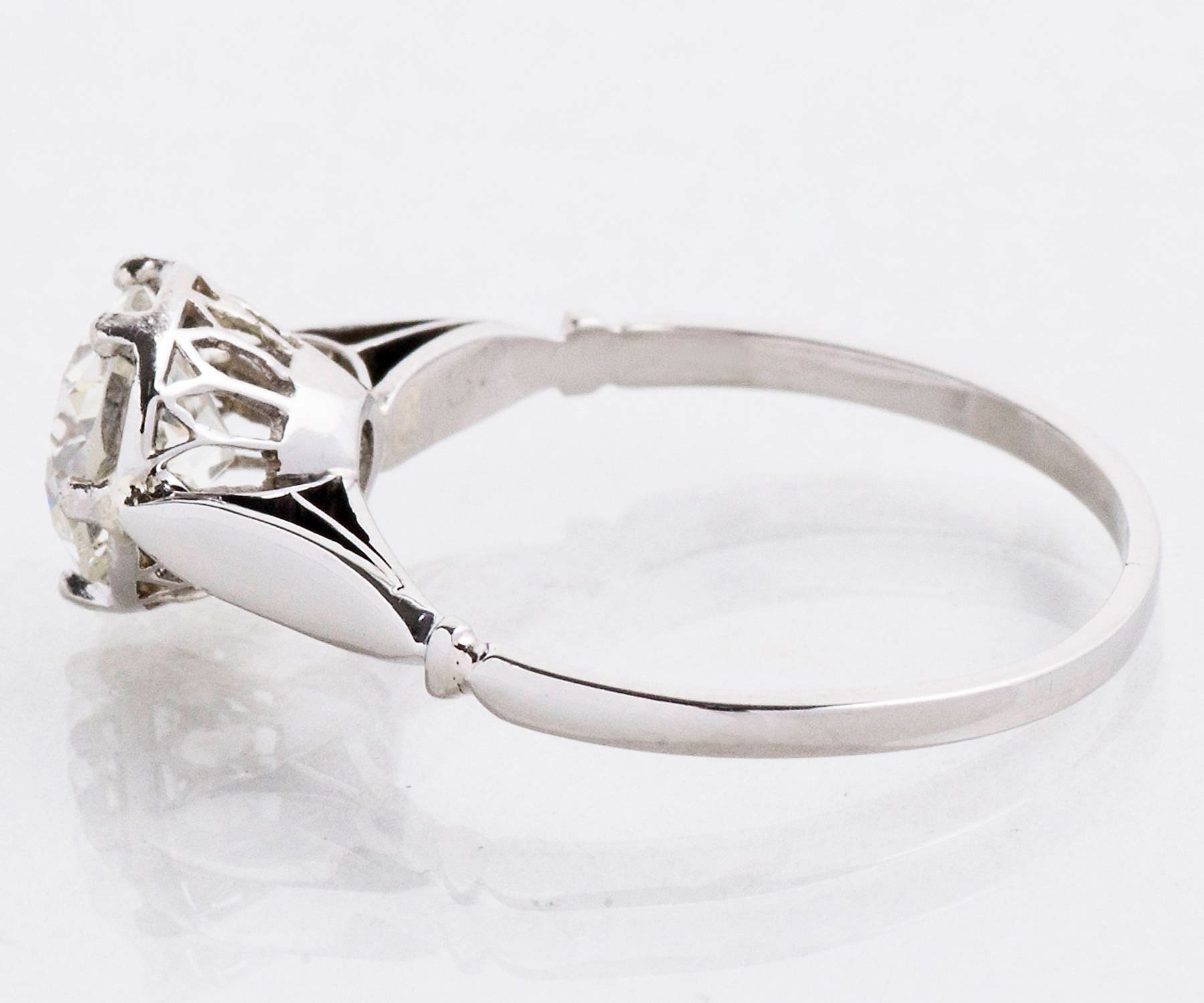 Here we have a very simple, clean and crisp antique diamond engagement ring crafted in bright high polished 18 k white gold. This is the perfect engagement ring for the vintage loving woman who doesn't want too much distraction from the center diamond, but just enough detail to enhance it. A very classy look and it will pair beautifully with so many of the antique wedding bands that we have in our vast collection.