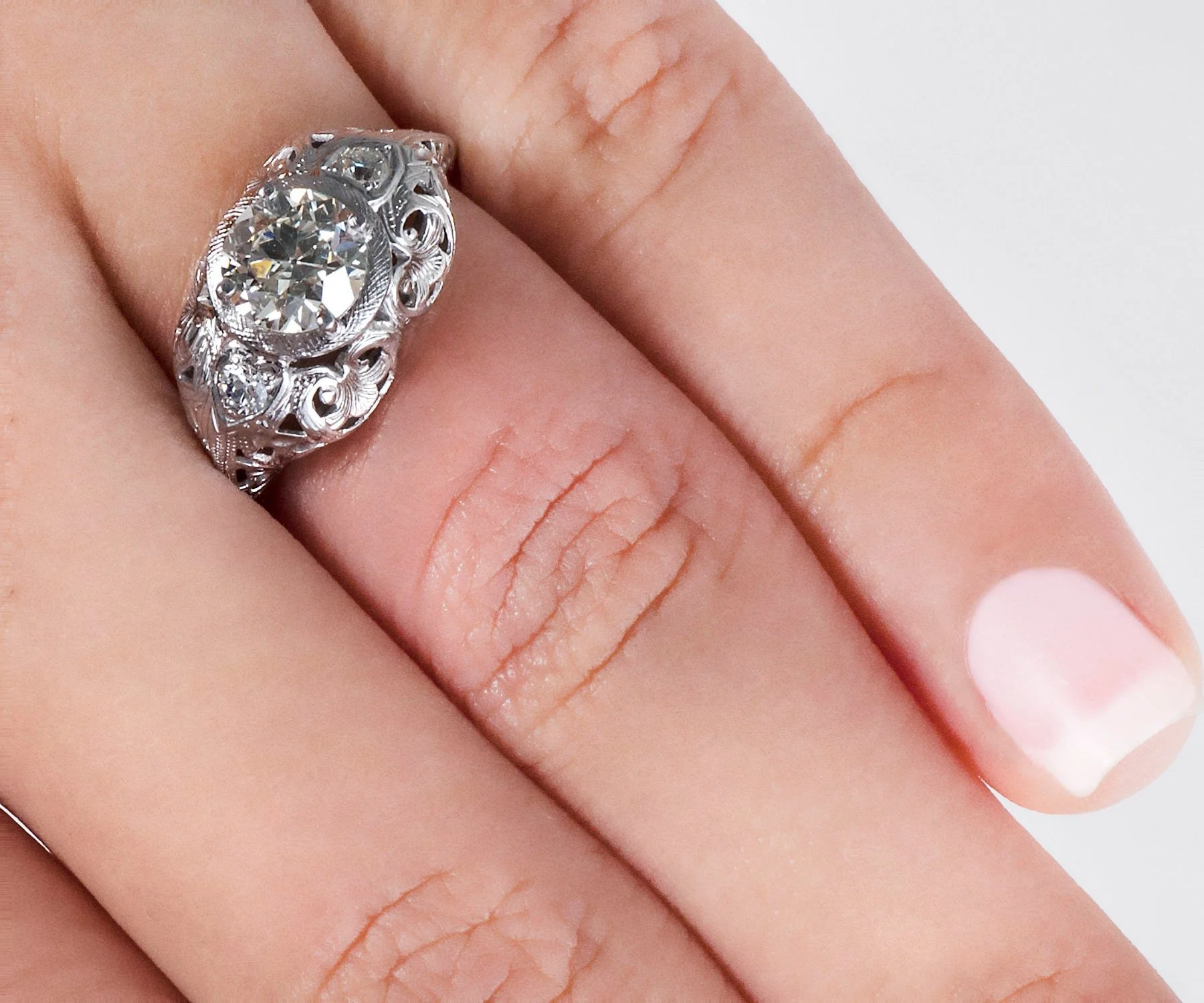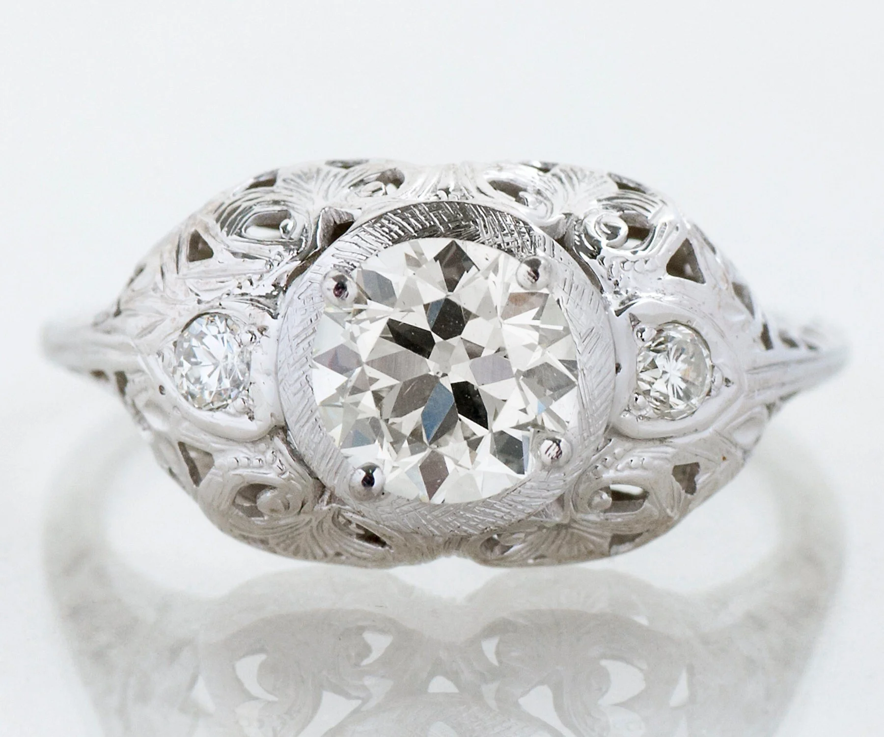 This chunky, 18 k white gold diamond engagement ring is just delightful! No need to wear a wedding band with this one as it is wide enough and stands beautifully on it's own! Breathtakingly stunning from every angle, this antique treasure houses a lovely European cut diamond snugly in the center. Two tiny diamonds adorn each side accenting the center diamond just perfectly. With so many intricate details in this little masterpiece, you will find yourself gazing at it forever!