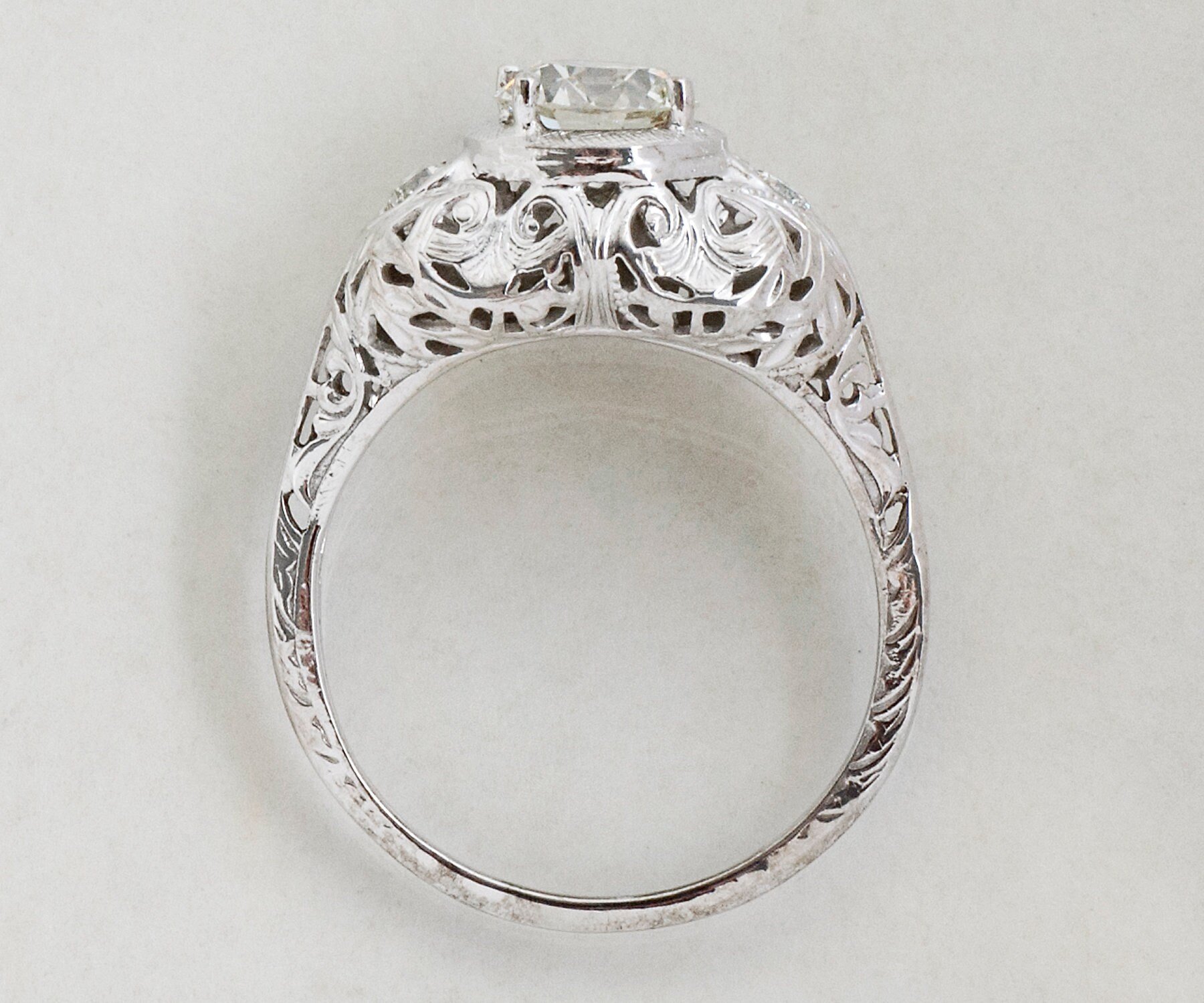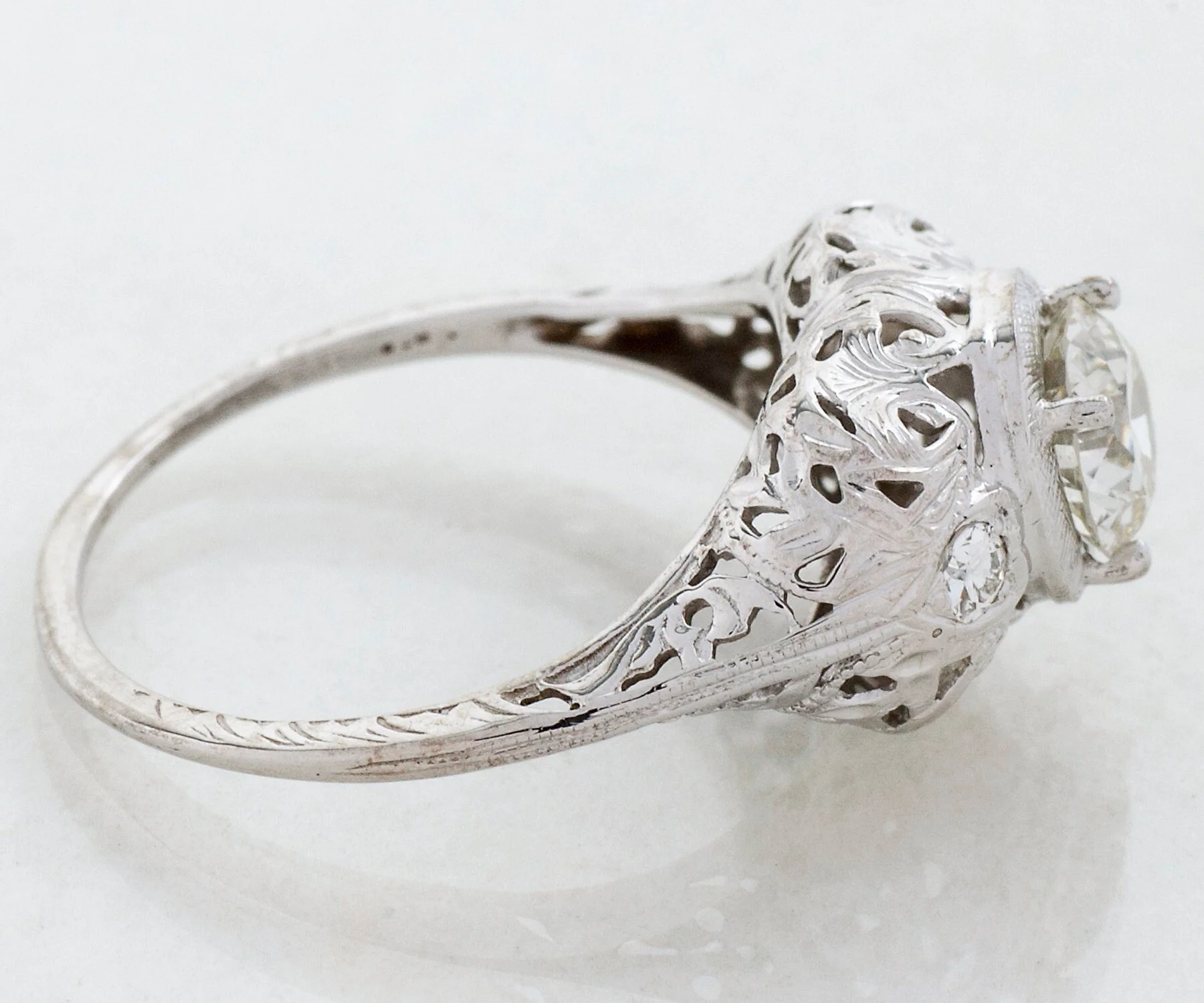 Antique Engagement Ring - Antique 1910's 18k White Gold Diamond Engagement Ring 18k White Gold European Cut Center Diamond =.88ct VS2/I 2 Side Diamonds =.14ct VS-SI/G-H Ring Size 6.25 (ring is sizable) Ring measures approximately 9.7mm at center. Back of band measures .8mm in one direction and approximately 1.4mm in the other direction.
