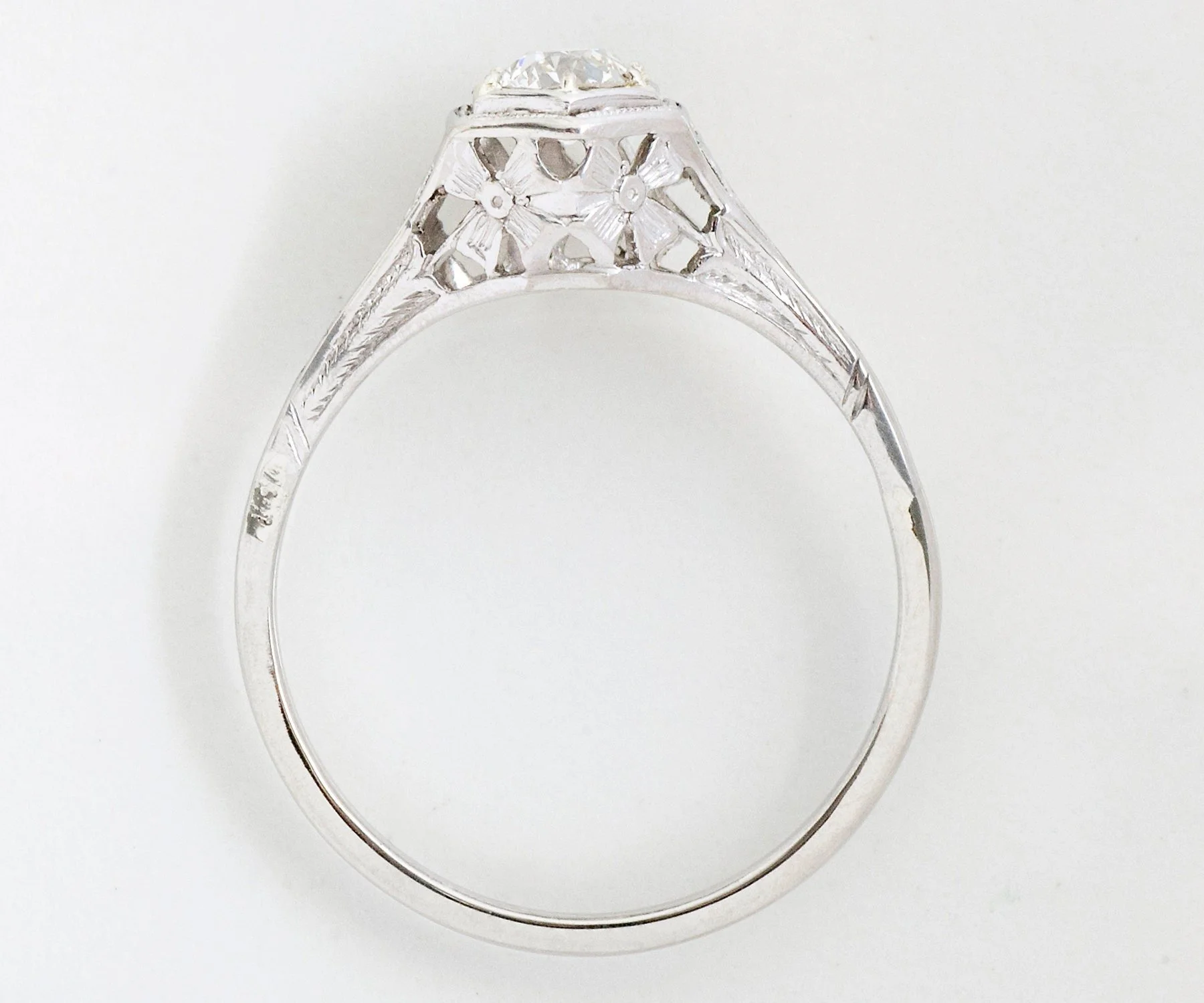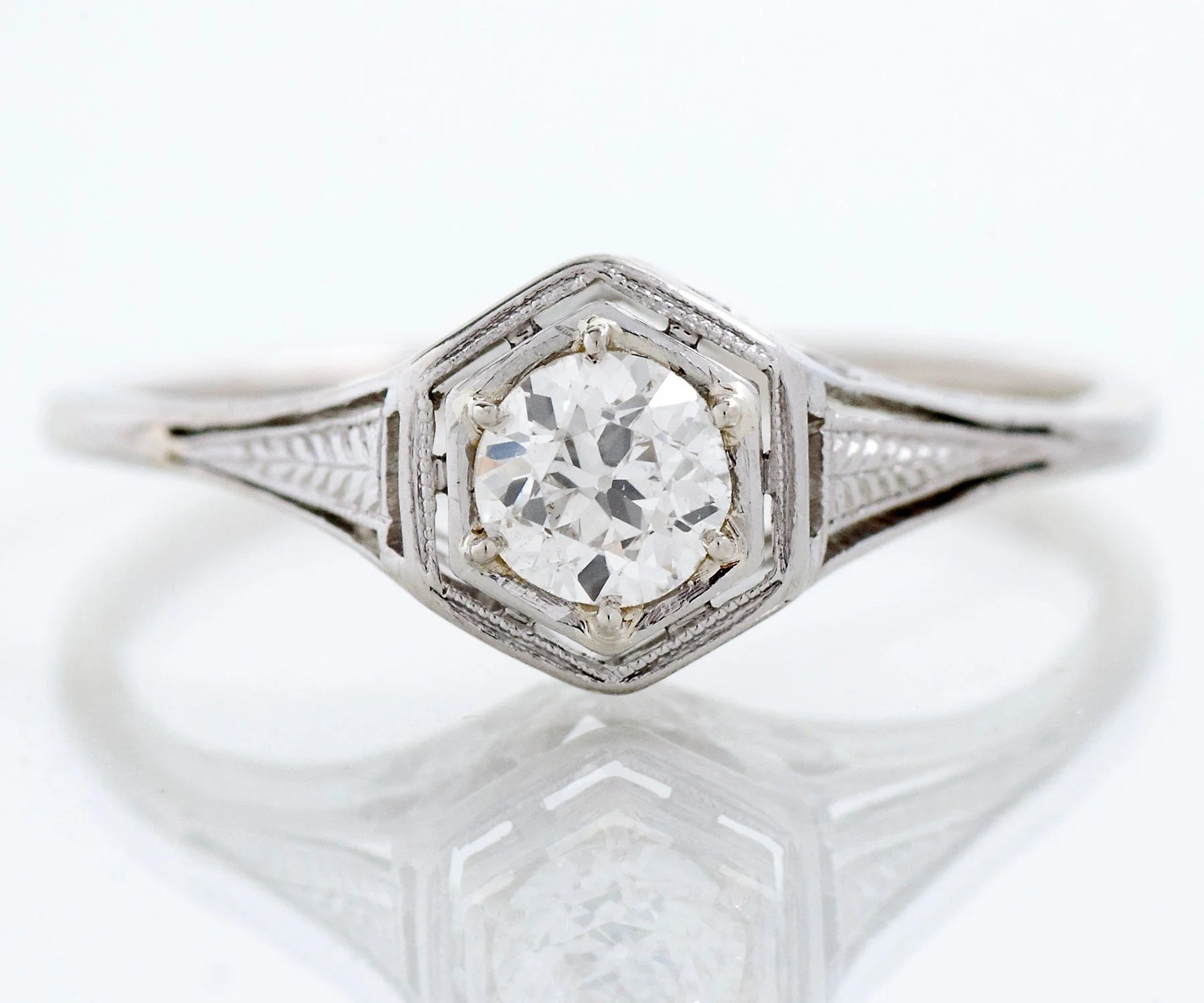 Simply elegant is this antique 18k white gold diamond engagement ring from the very early 1900's. A sweet European cut diamond is featured at the center, set within a pierced basket showing a blossom pattern, very feminine indeed.