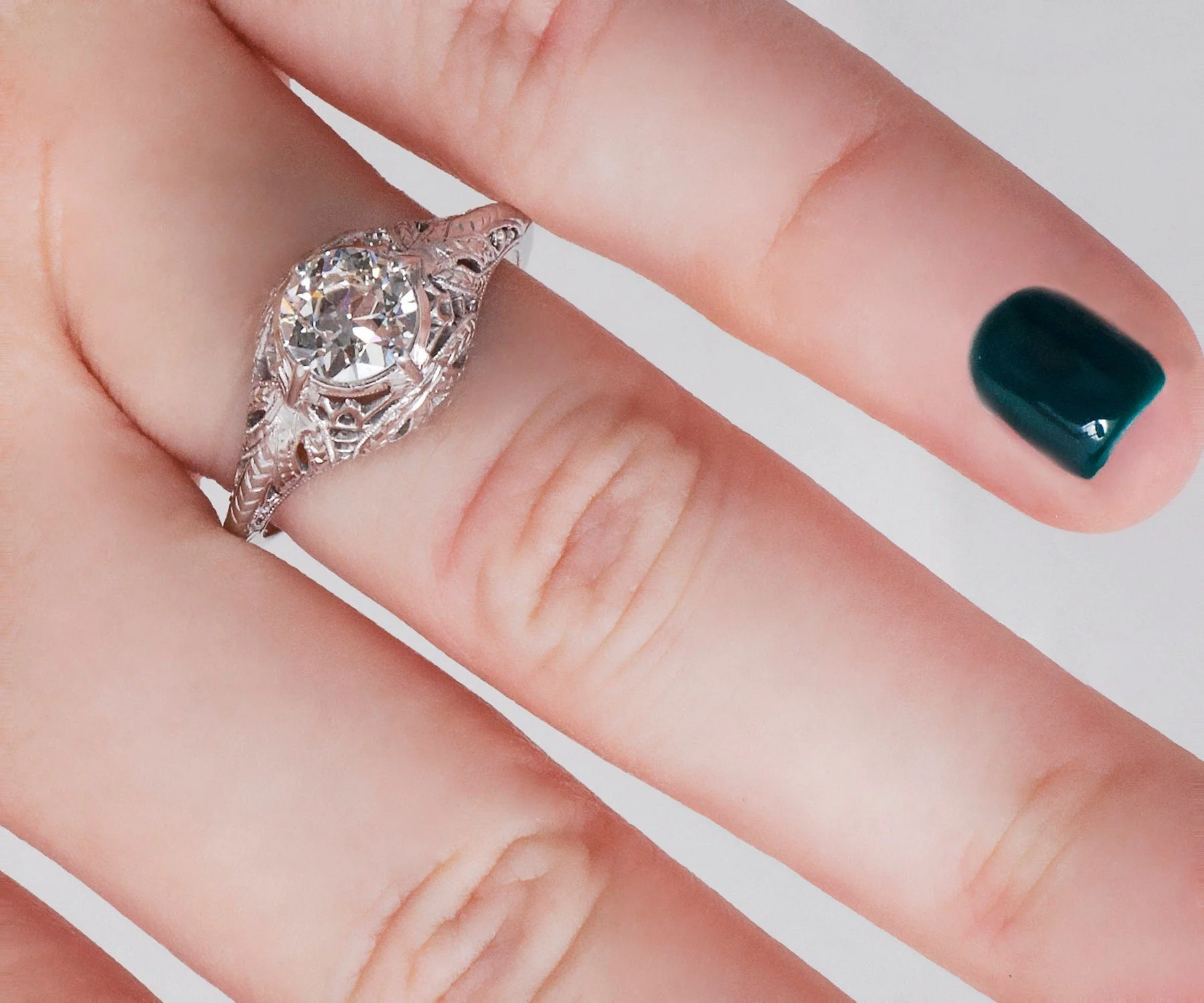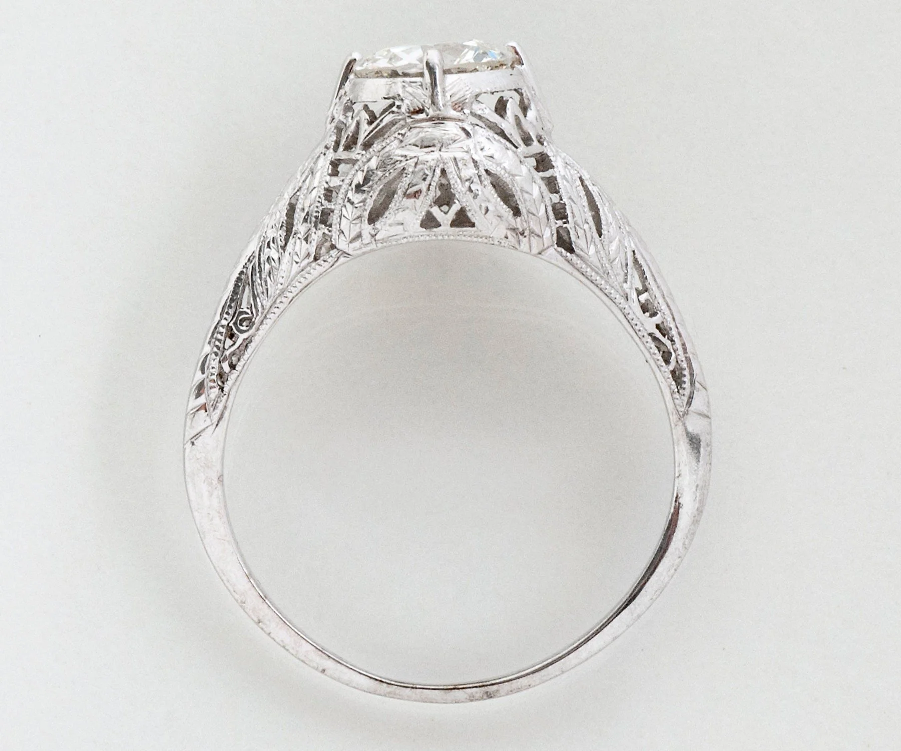 Perfectly lovely is this antique diamond engagement ring from the very early 1900's. A nice size sparkling European cut diamond sits snugly at the center within 4 high polished prongs in this 18 k white gold stunner. Graceful filigree and the coveted wheat pattern play a role here too. The wheat pattern was thought to signify a few things including a bountiful harvest, a connection to the natural world and fertility!