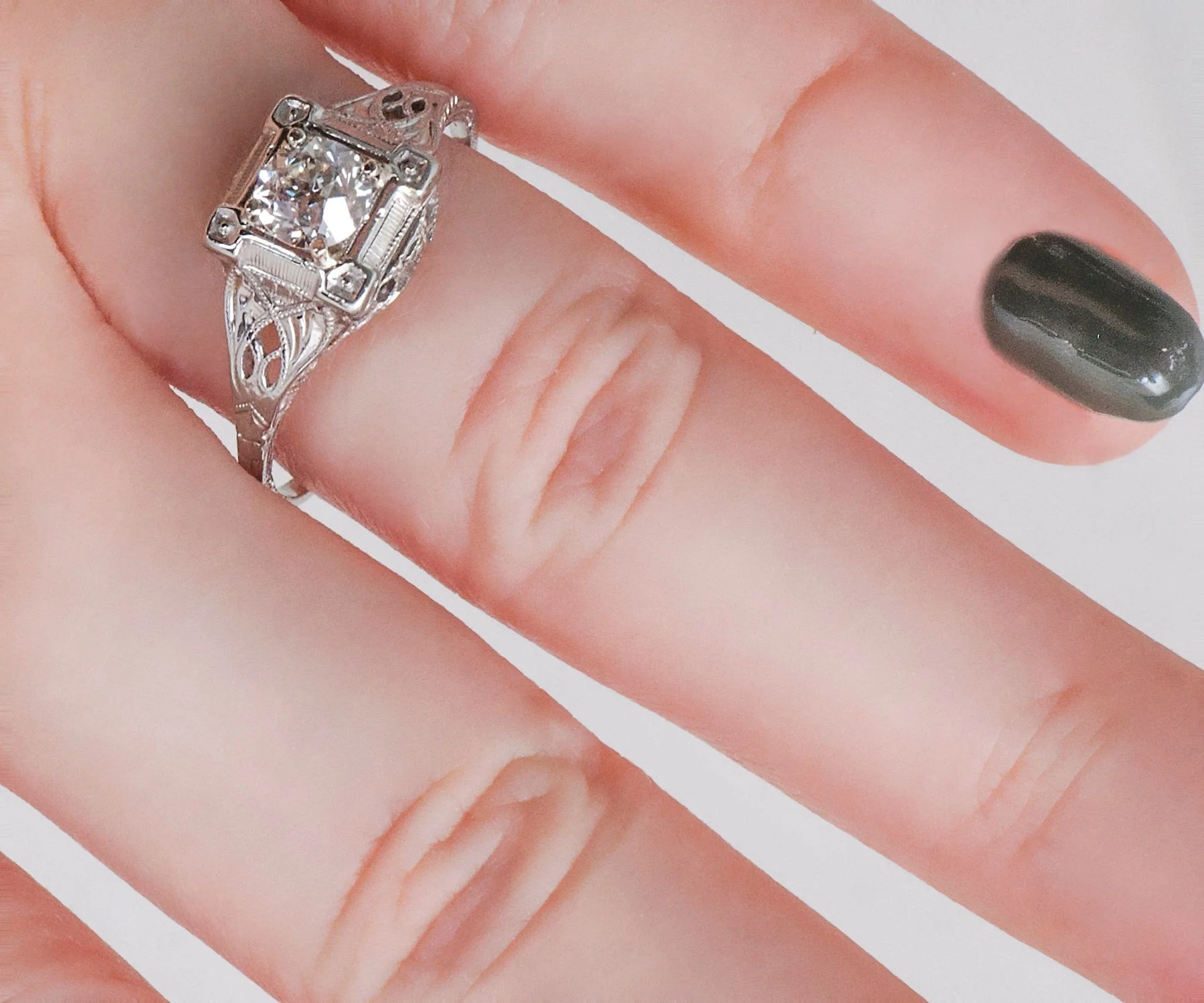 A textured square shaped open framework surrounds an absolutely stunning European cut diamond set in bright and beaming 18k white gold. E color in a European cut diamond is uncommon for sure. This Edwardian beauty is lovely from every angle and will pair perfectly with so many of the antique wedding bands in our collection.