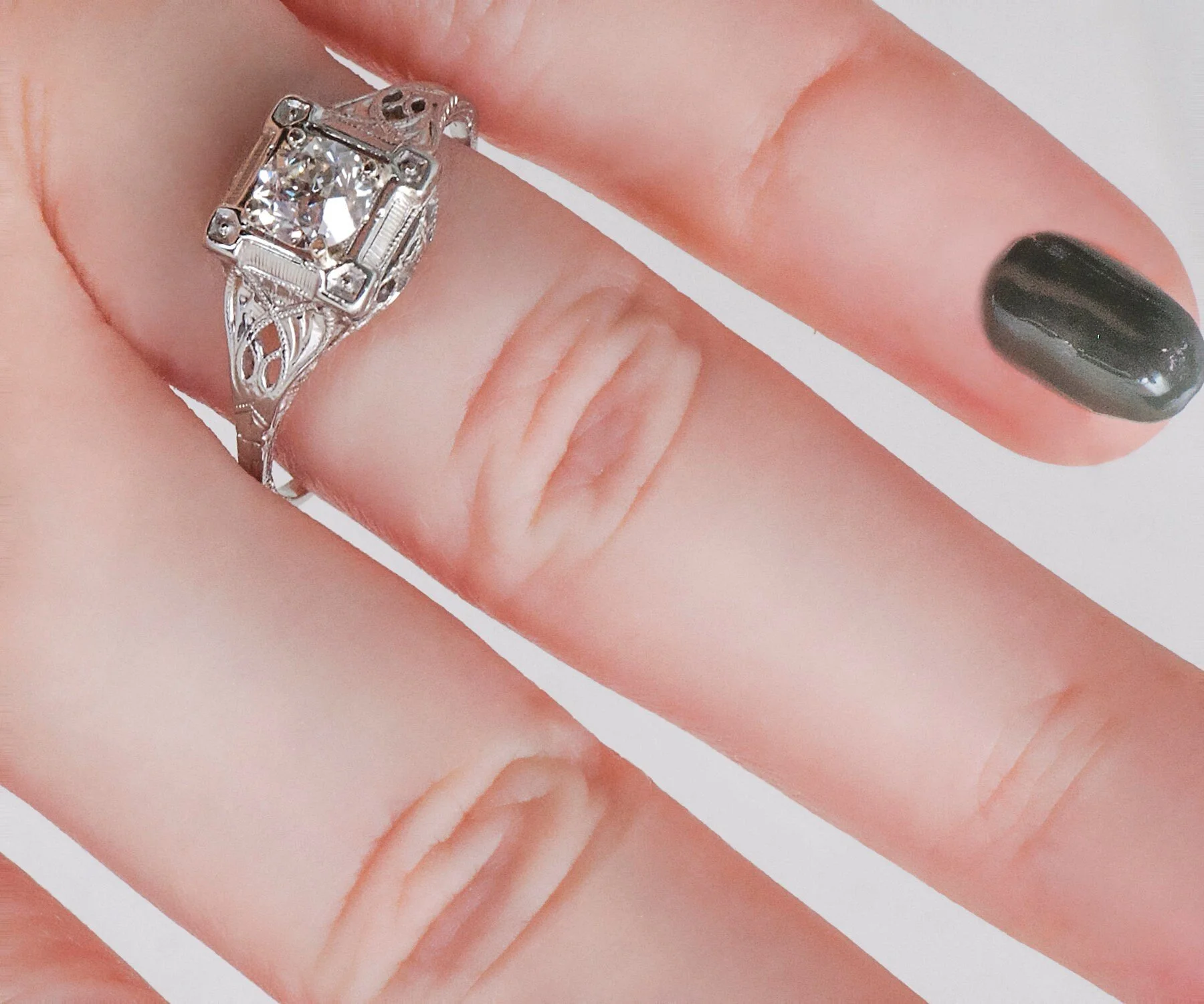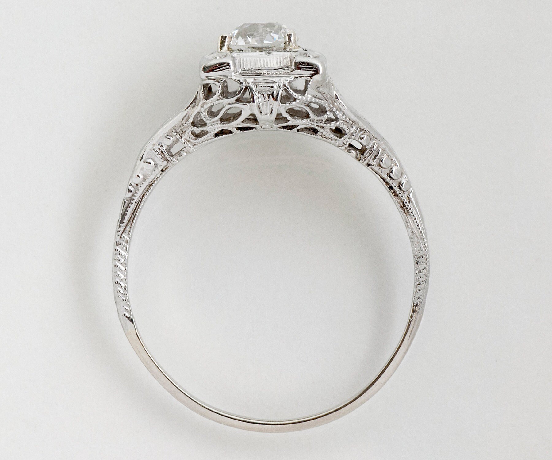 A textured square shaped open framework surrounds an absolutely stunning European cut diamond set in bright and beaming 18k white gold. E color in a European cut diamond is uncommon for sure. This Edwardian beauty is lovely from every angle and will pair perfectly with so many of the antique wedding bands in our collection.