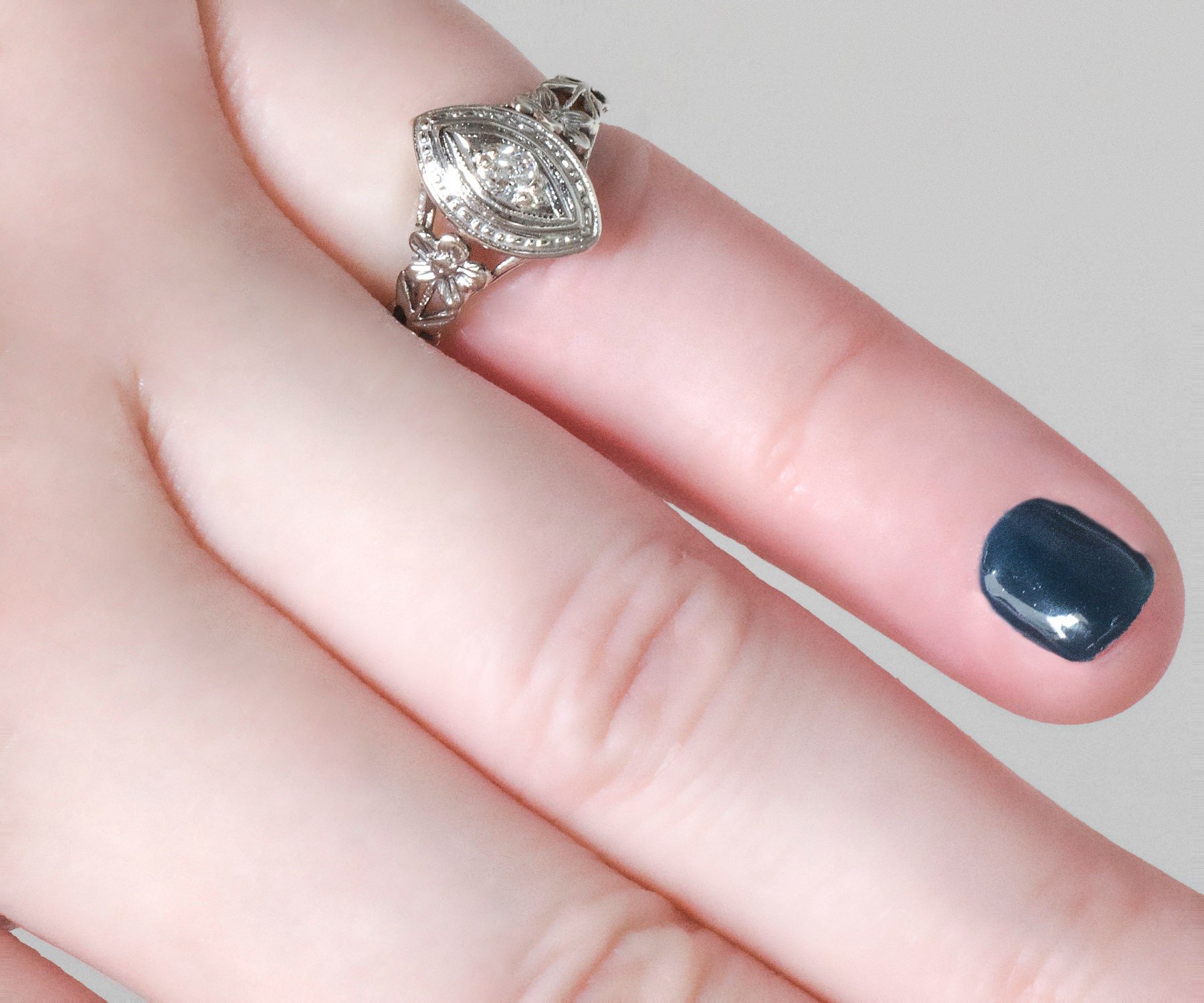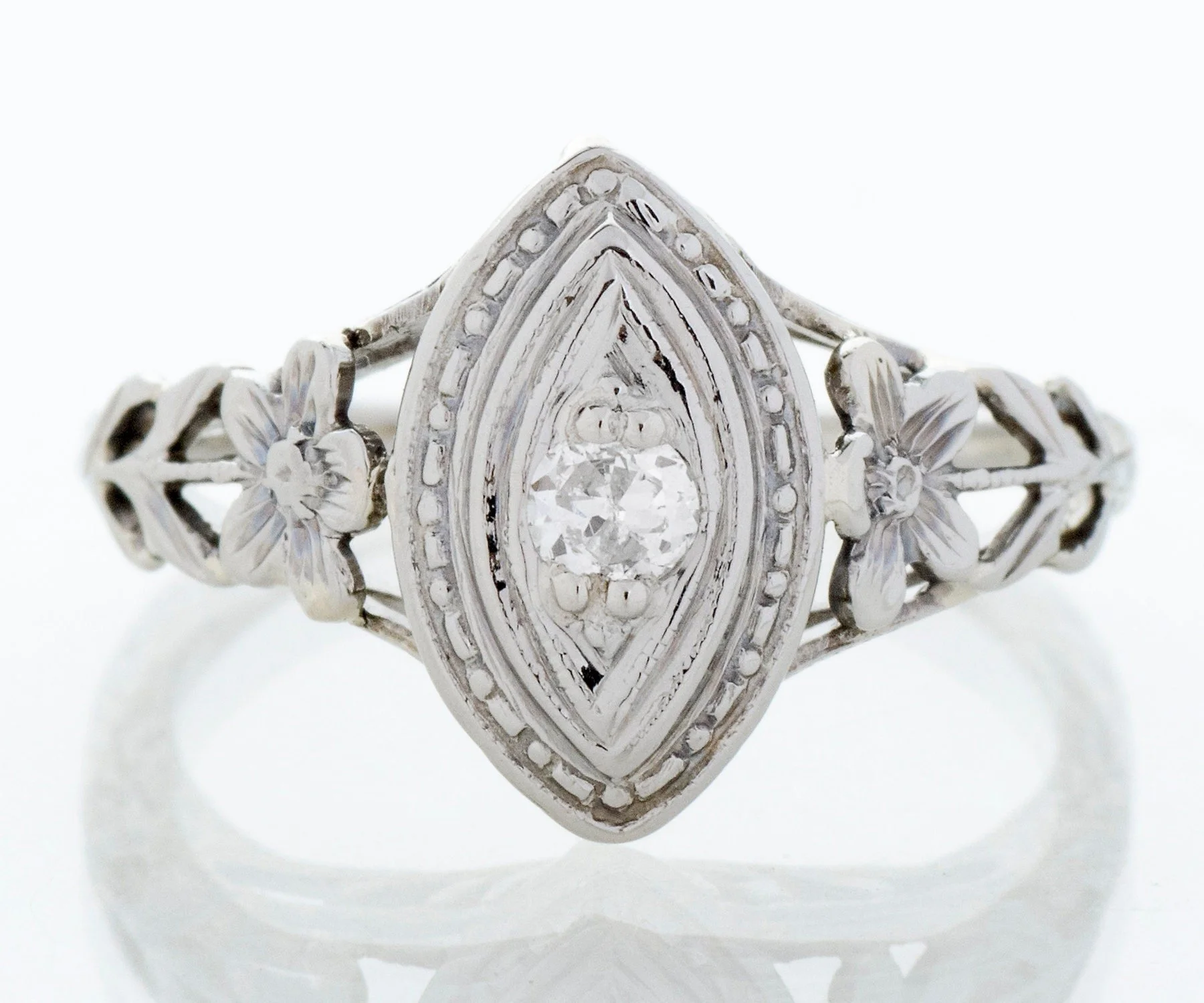 What a 18k white gold sweet ring this is from the early 1900's. A darling little European cut diamond sits snugly within a marquise shaped setting of multiple layers with beautiful floral details on either side along with lots of open work, making this ring appear light and airy. This antique treasure would make a perfect promise ring.
