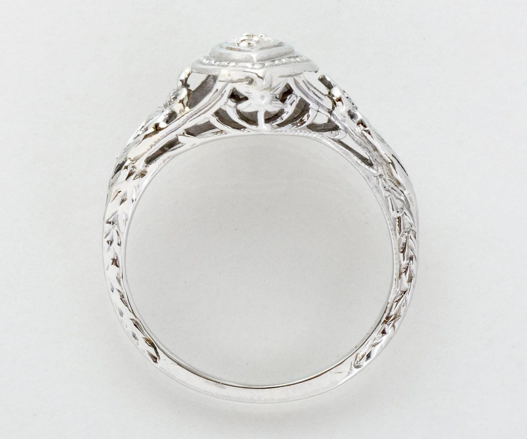 Antique Engagement Ring - Antique 1910's-20's 18k White Gold Diamond Engagement Ring 1910's-20's 18k White Gold European Cut Diamond =.07ct SI/I-J Ring Size 2.75 (sizable) Ring measures approximately 10.8mm at center, back of band is 1.1mm wide.