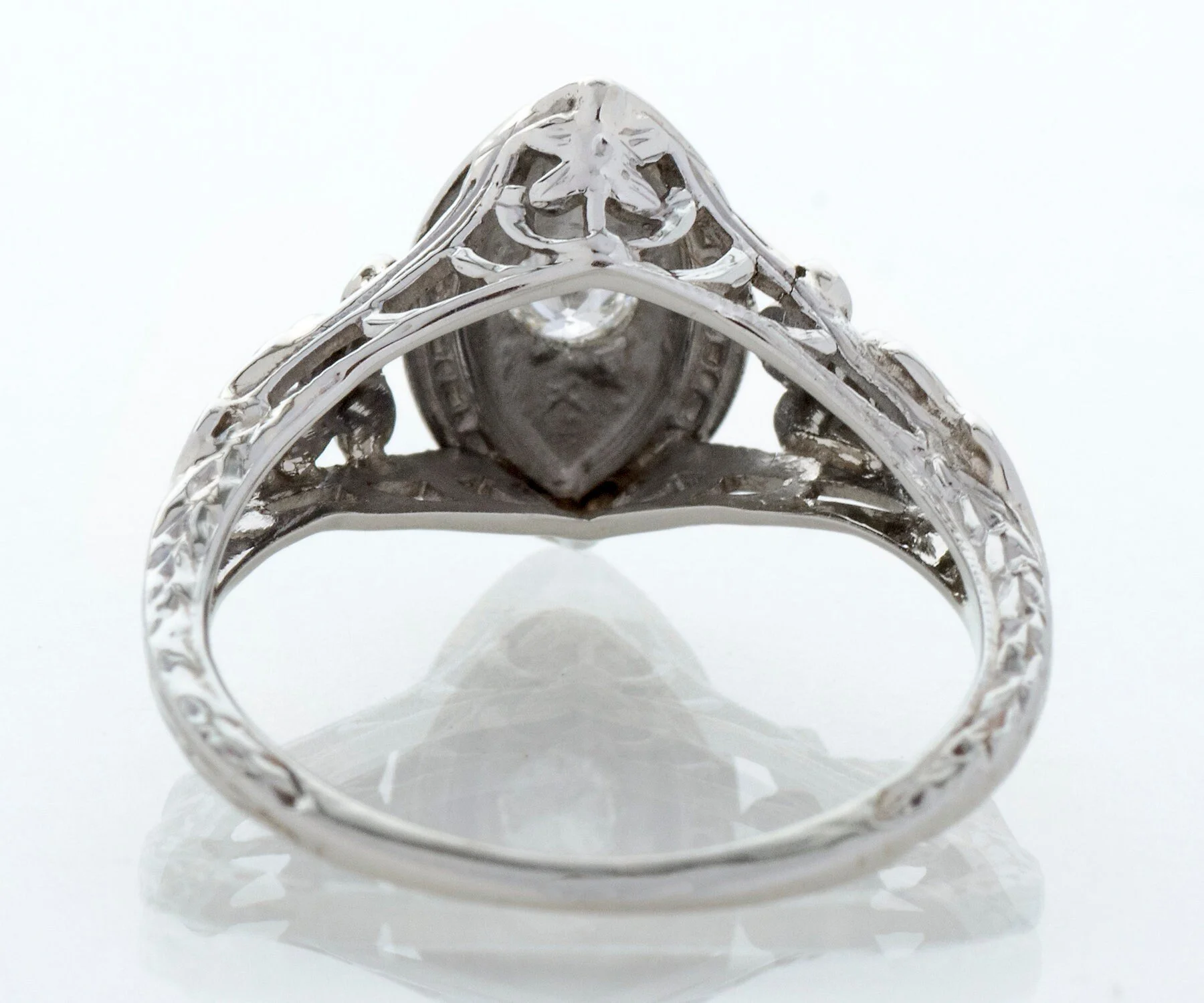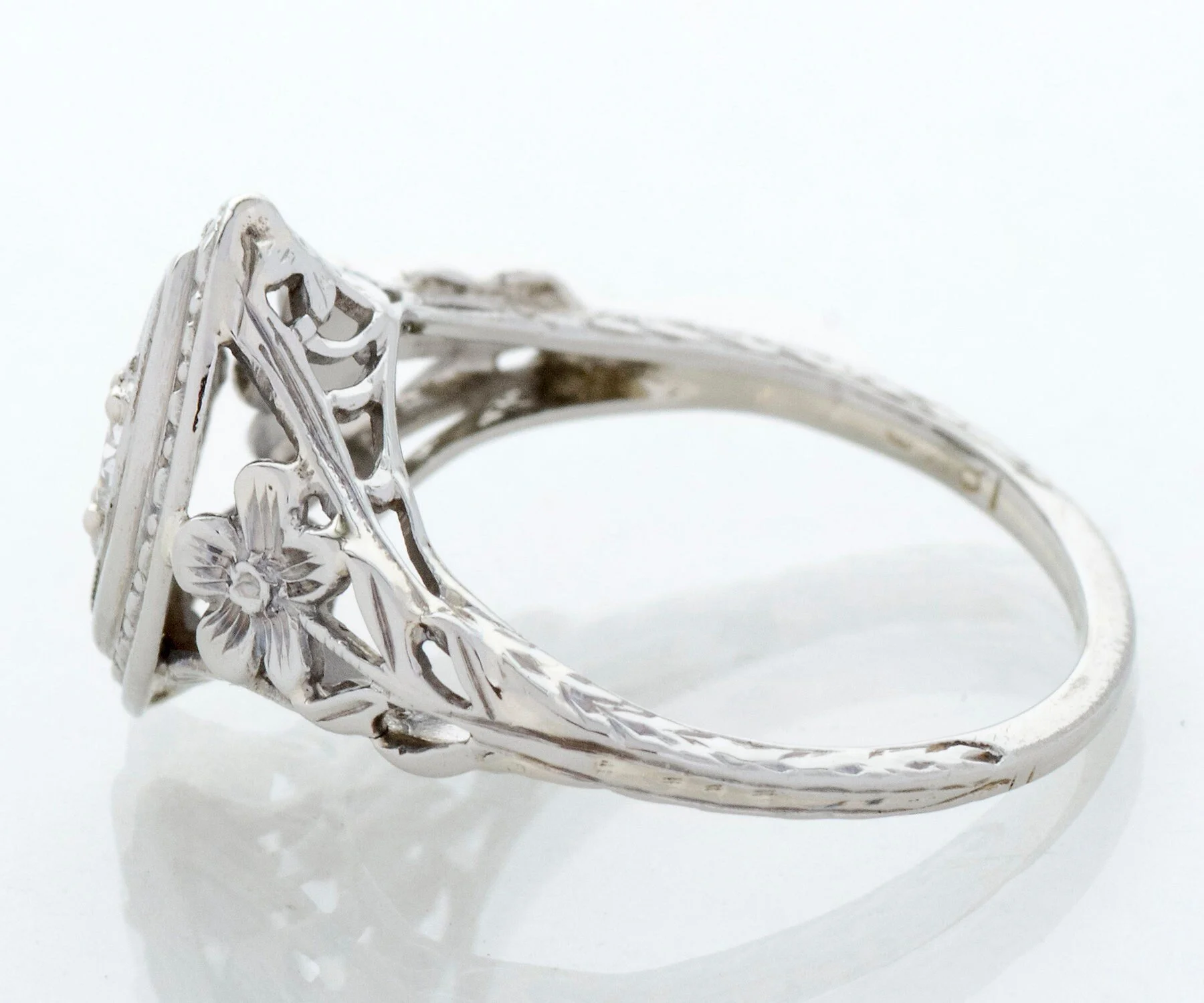 What a 18k white gold sweet ring this is from the early 1900's. A darling little European cut diamond sits snugly within a marquise shaped setting of multiple layers with beautiful floral details on either side along with lots of open work, making this ring appear light and airy. This antique treasure would make a perfect promise ring.