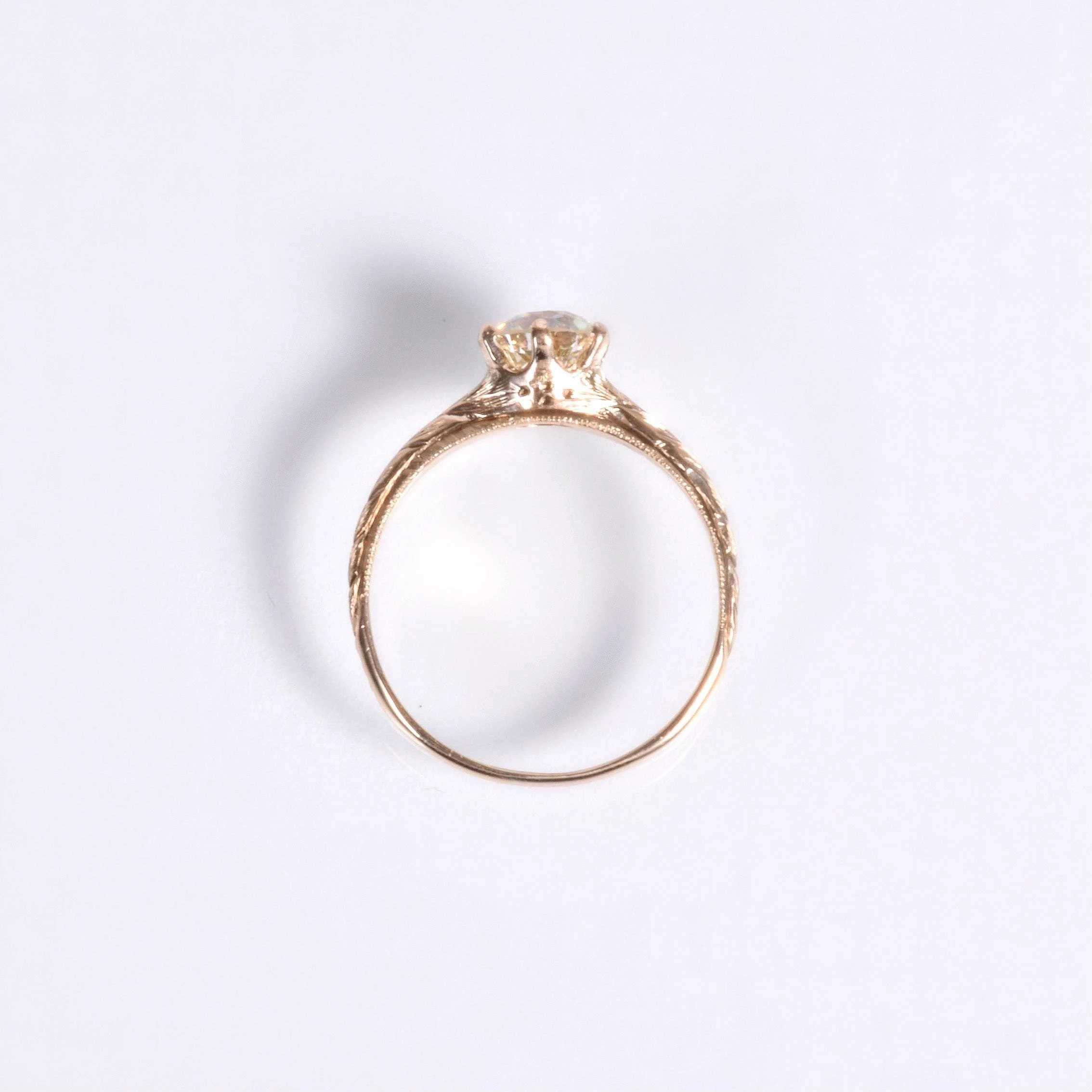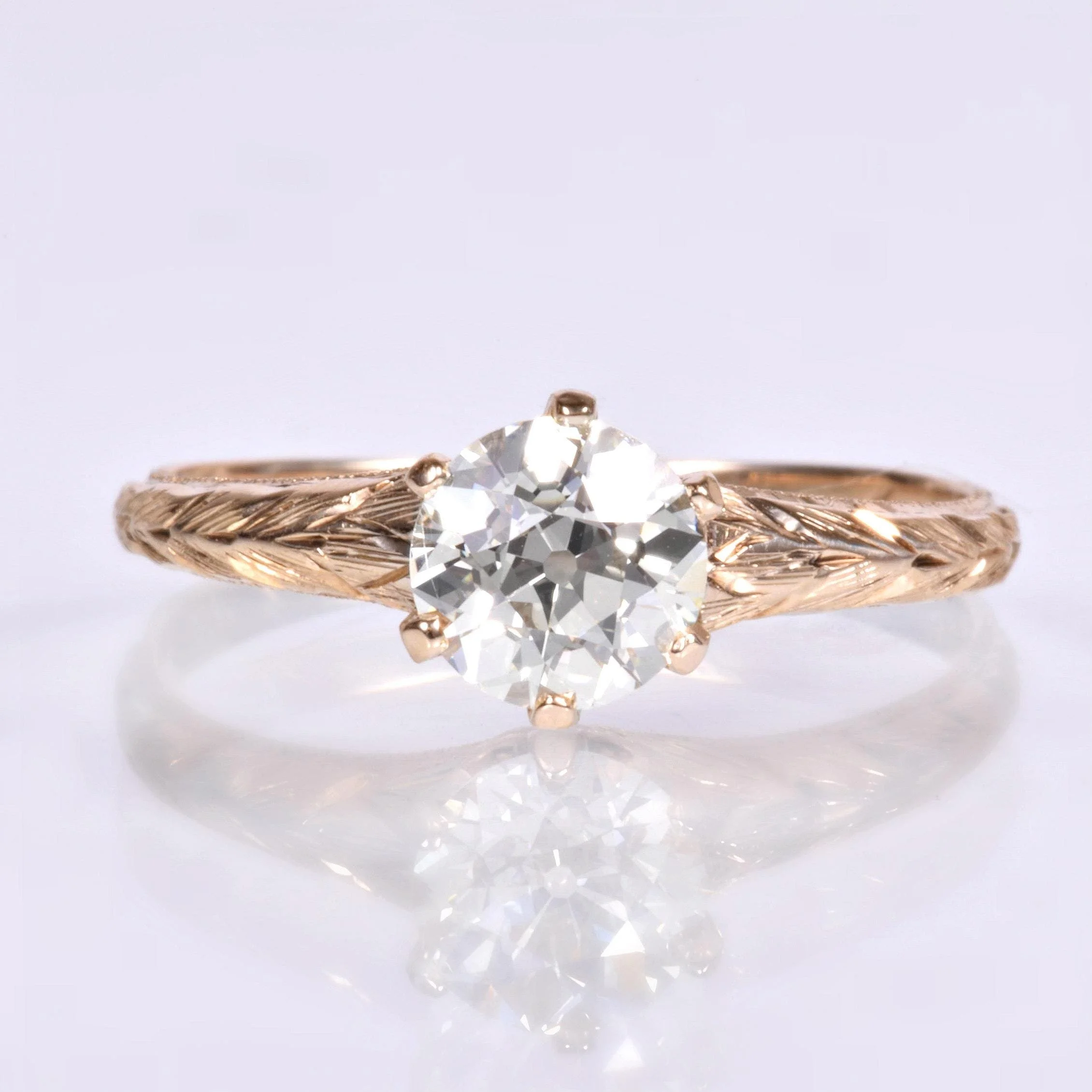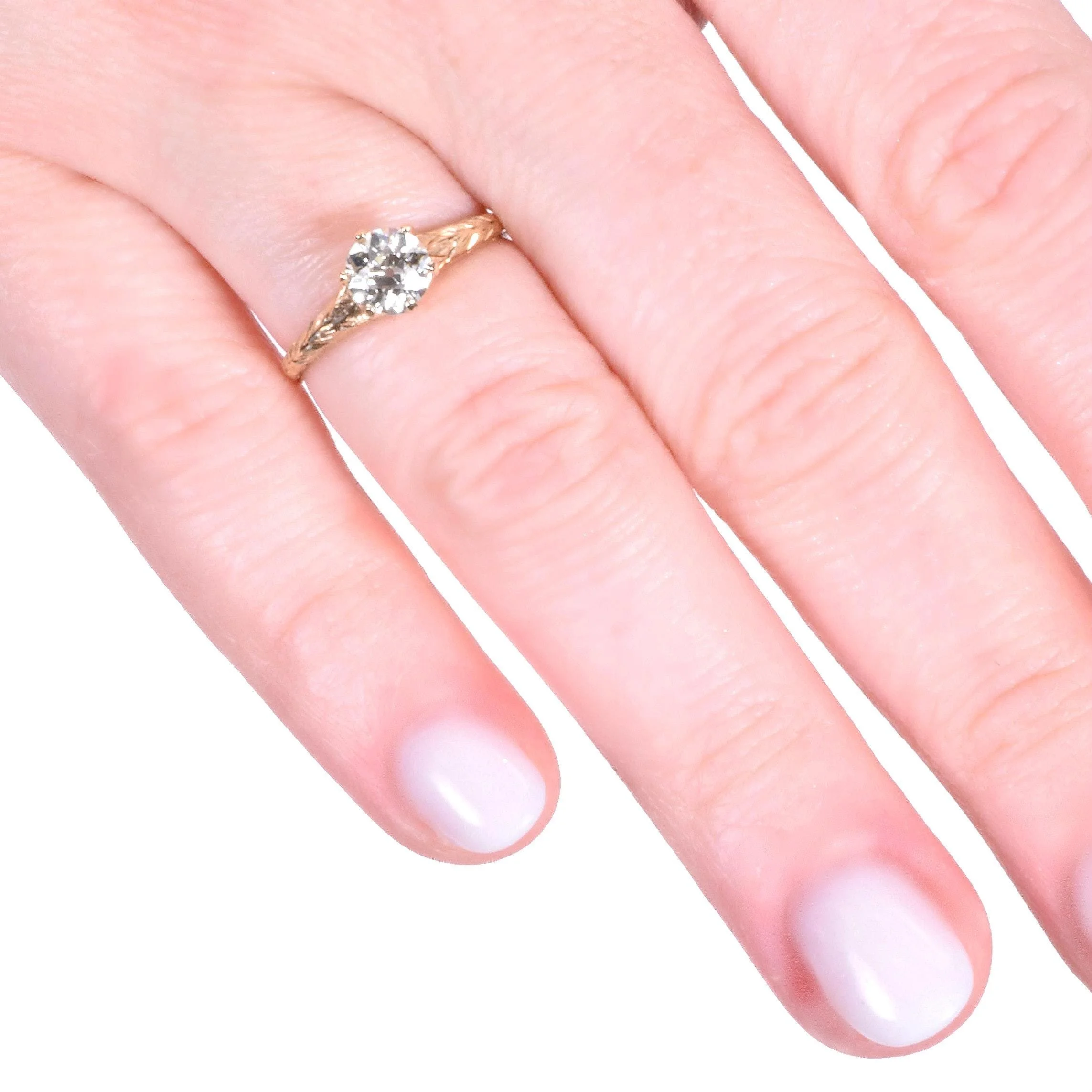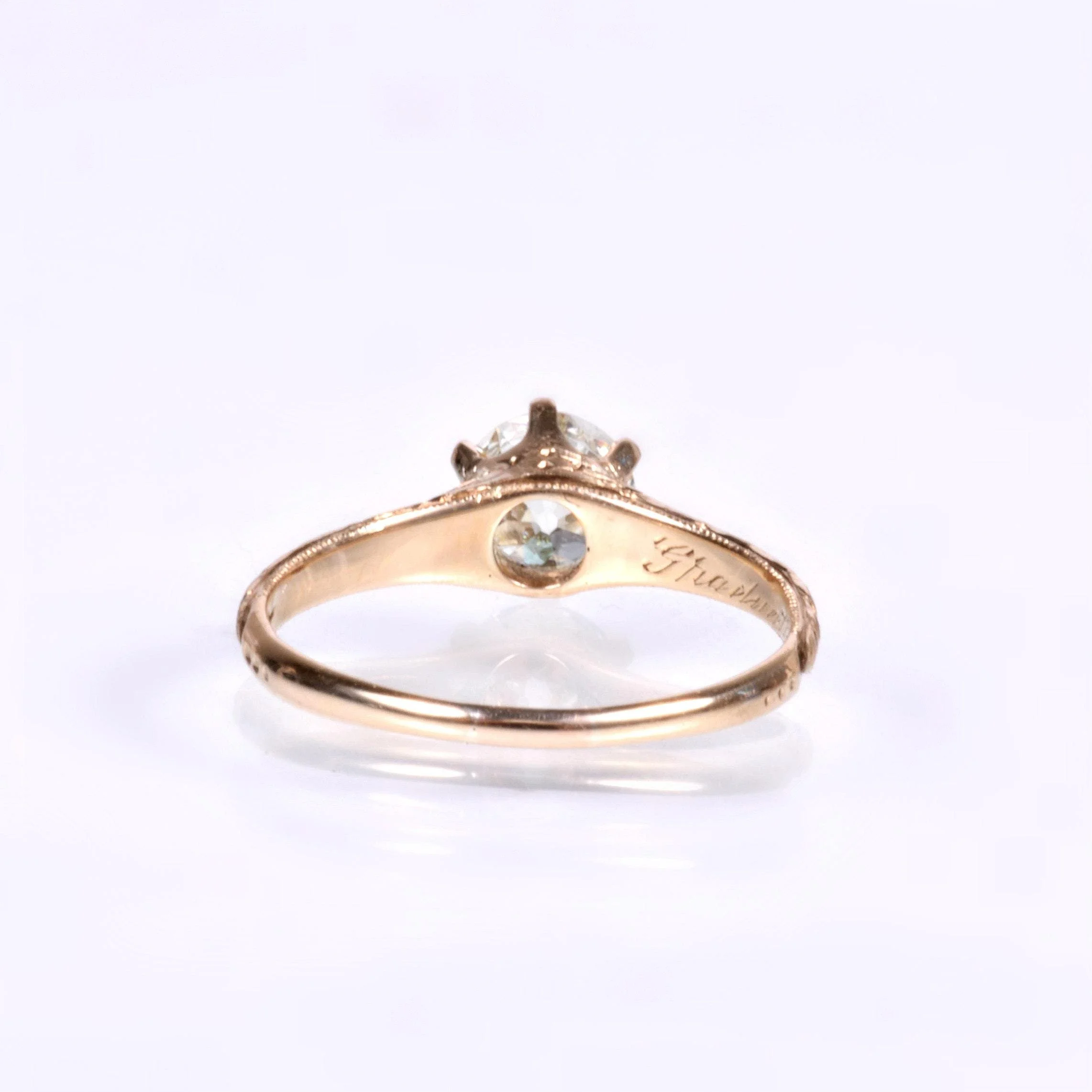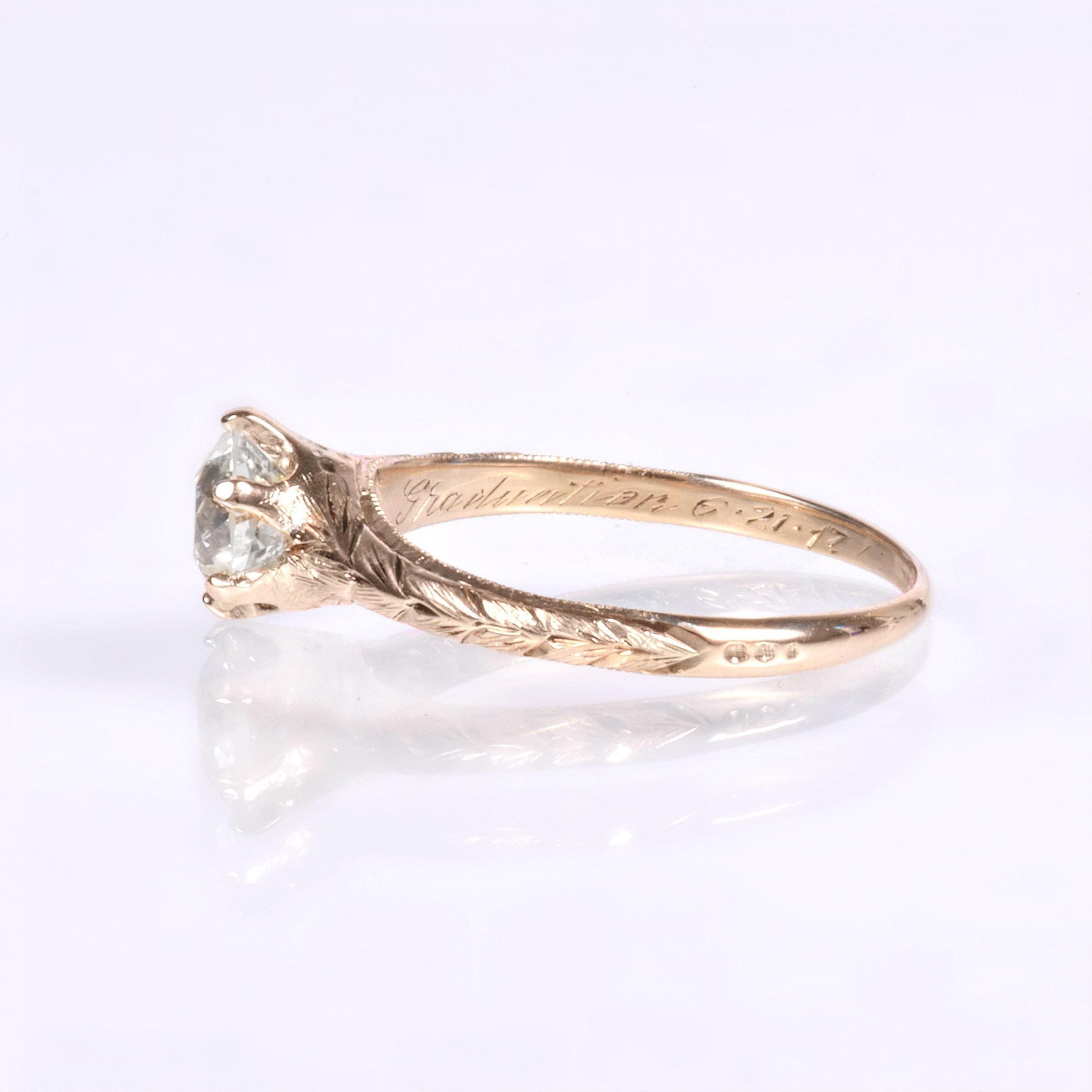 This beautiful and timeless 14k beaming yellow gold solitaire engagement ring has a lovely and very crisp romantic floral engraved motif along the shank. A sparkling antique European cut diamond shines from the center and this aged charmer comes with the original engraving inside the band which we love! Engraved "6-21-17". What a great ring to propose with!