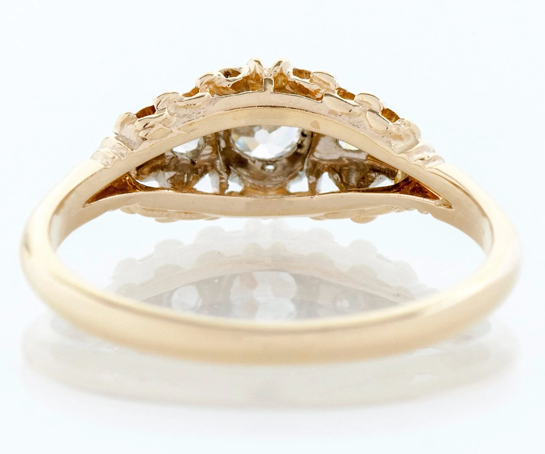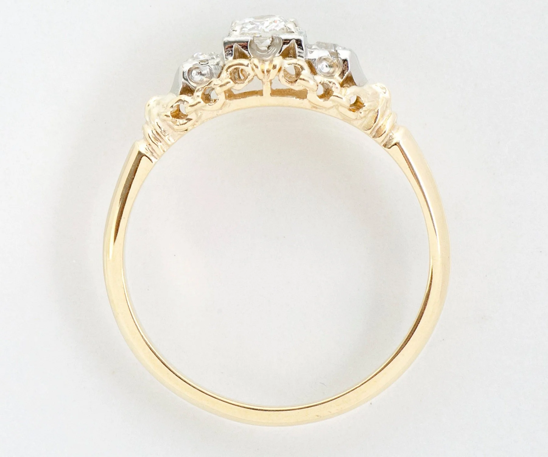 Antique Engagement Ring - Antique 1920's 18k Two-Tone Diamond Engagement Ring 1920's 18k Yellow & White Gold European Cut Center Diamond =.20ct VS2/H 2 European Cut Side Diamonds =.12ct VS2-SI1/J Ring Size 6.25 (ring is sizable) Ring measures approximately 6.93mm at center, back of band is 1.8mm wide.