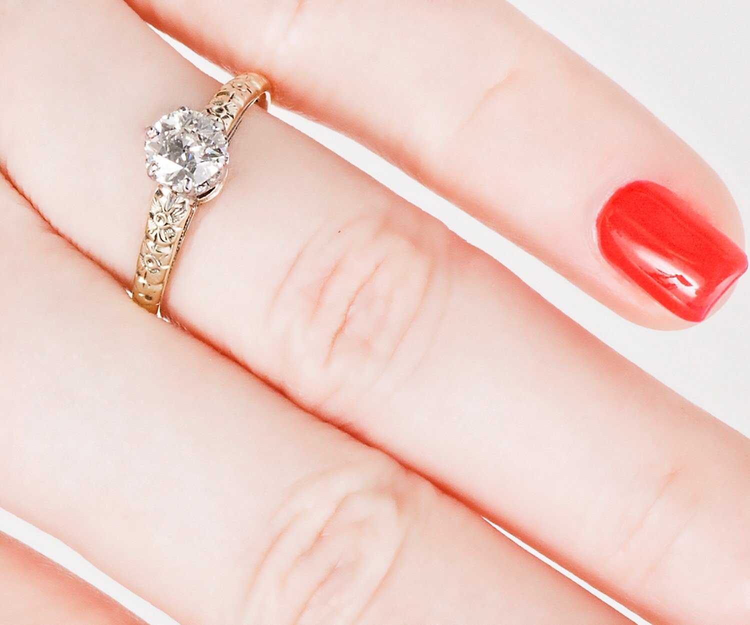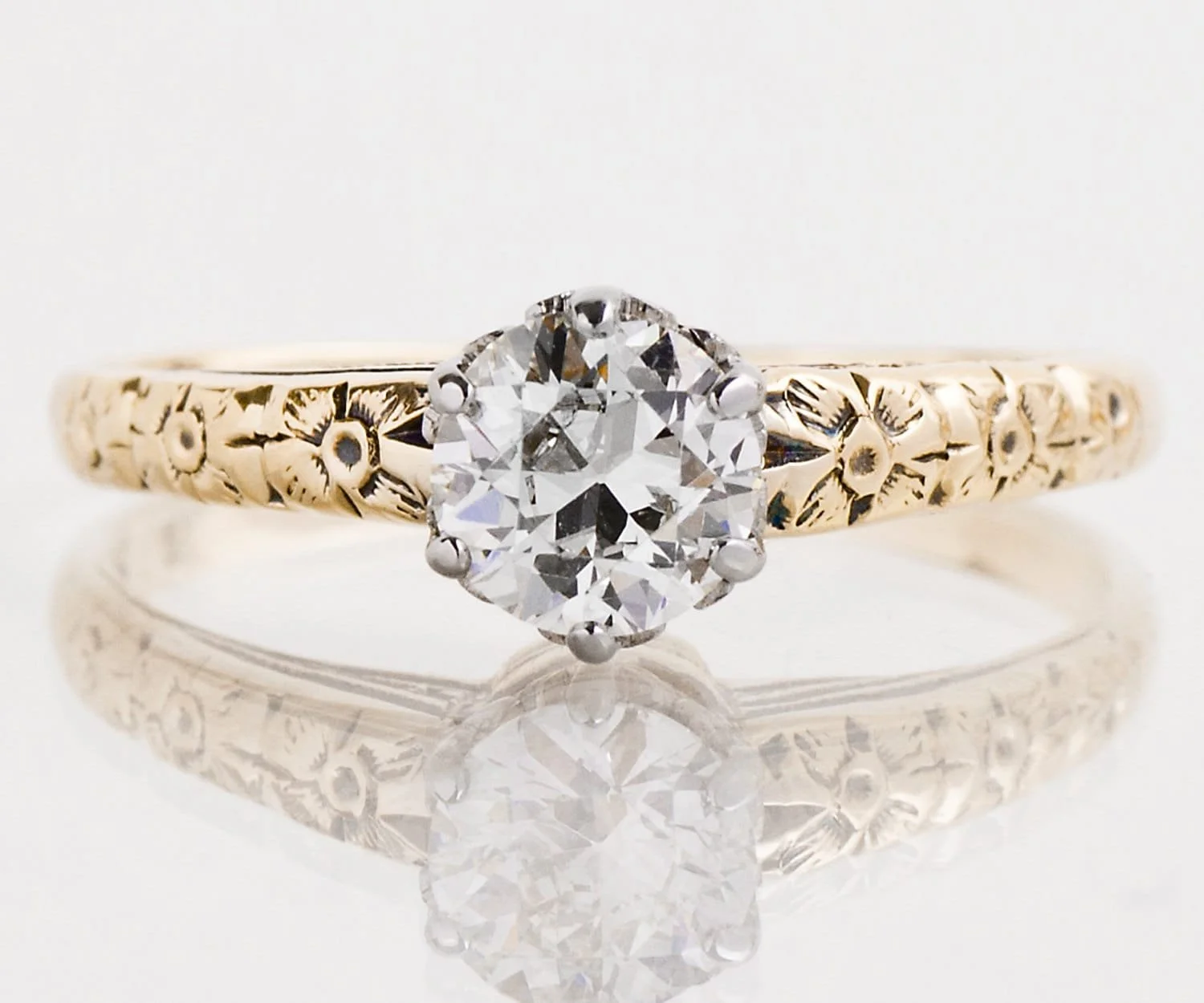 So very romantic...this one makes us ooh and ahh! An old European cut diamond just over one half carat and set within six prongs glistens brightly while showcased with perfection by a gorgeous floral motif.