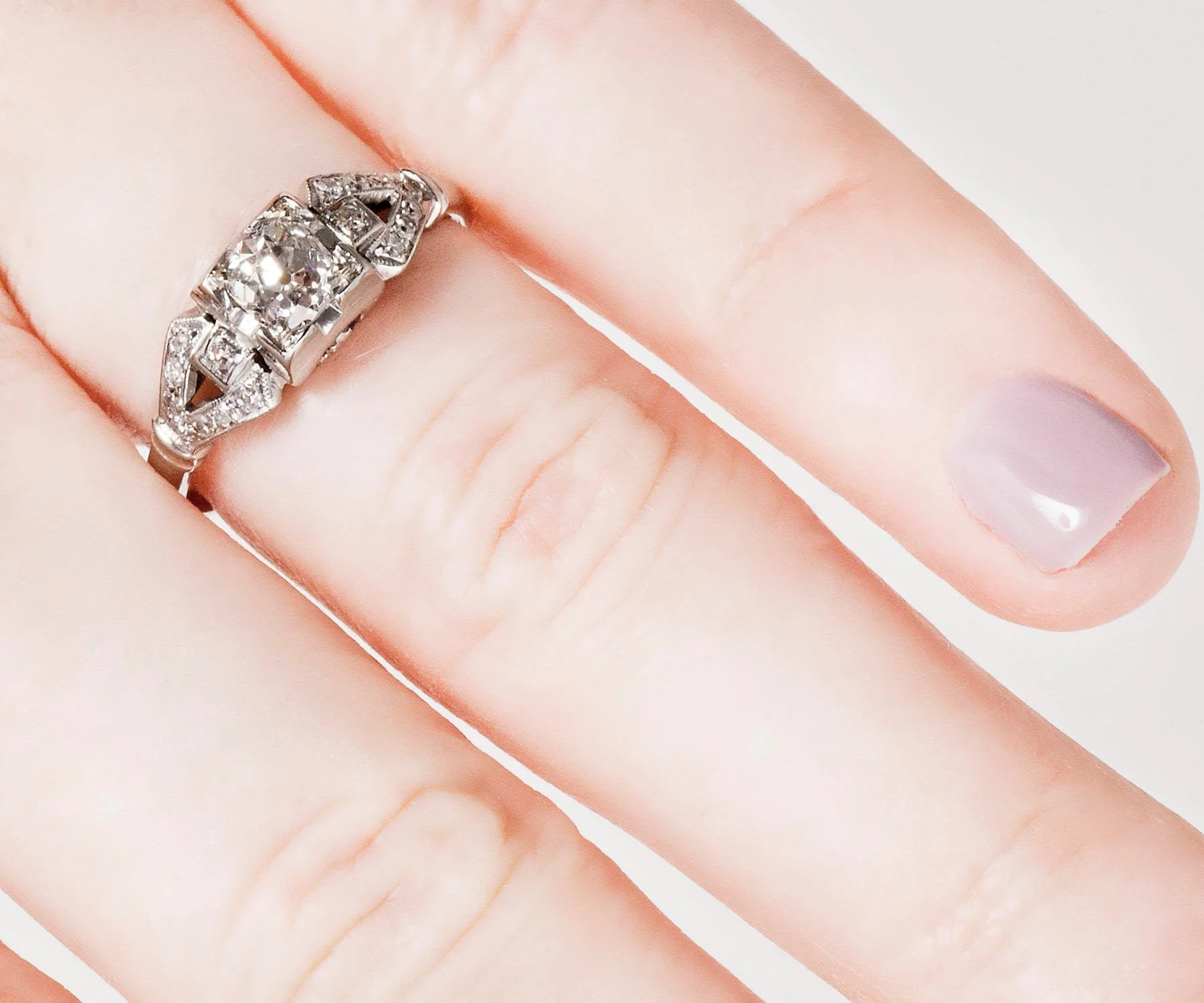 This is a lovely antique diamond engagement ring from the Art Deco 1920's era. With a sparkling old European cut diamond front and center, set in a square setting, complimented by a buckle design diamond shank. What a unique and one of a kind design!