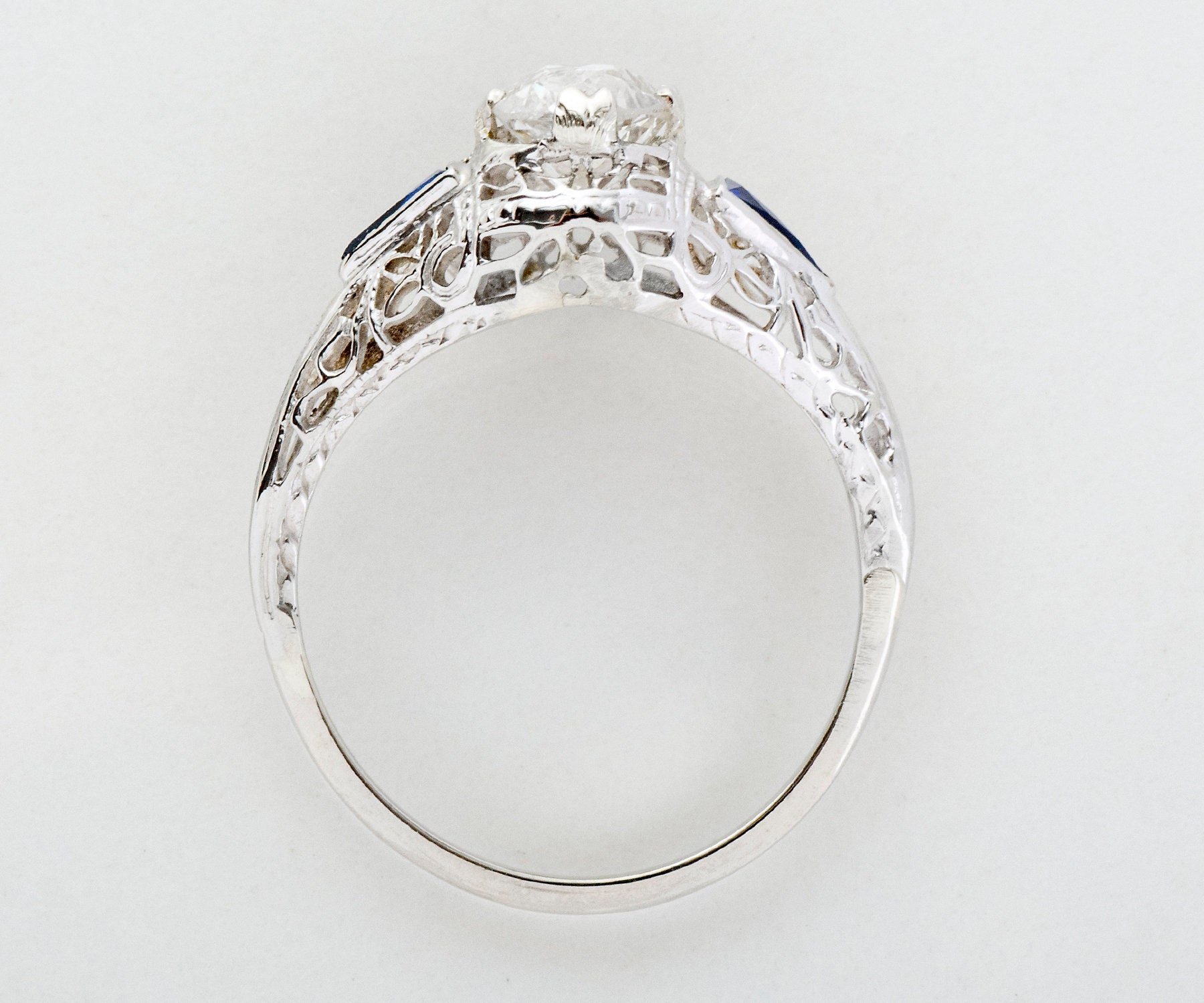Antique Engagement Ring - Antique 1920's 18k White Gold Diamond Engagement Ring 1920's 18k White Gold European Cut Diamond =.68ct VS2/I (GIA Cert) 2 Triangle Blue Sapphires Ring Size 5.5 (sizable) Ring measures approximately 7.9mm at center, back of band is 1.1mm wide.