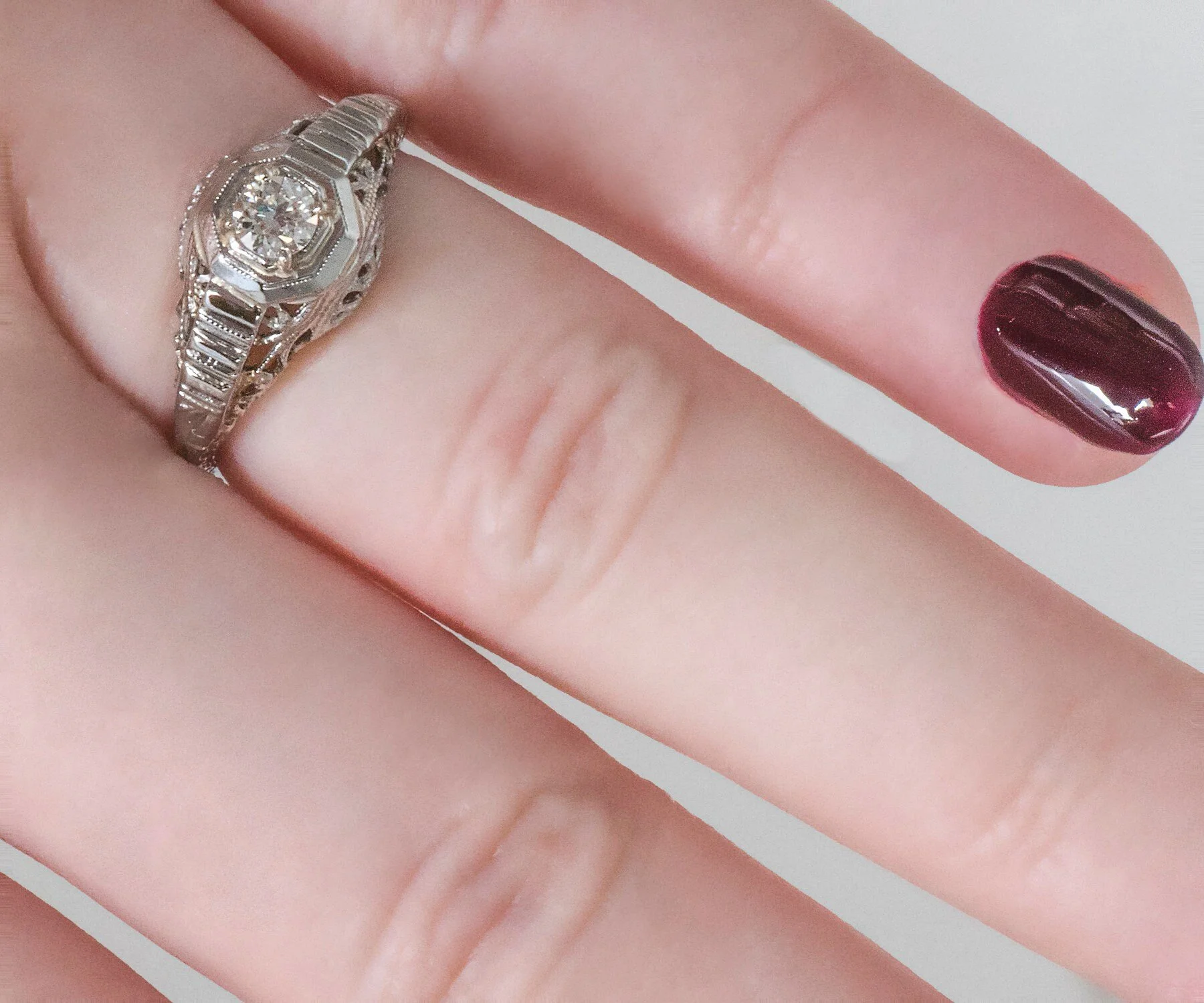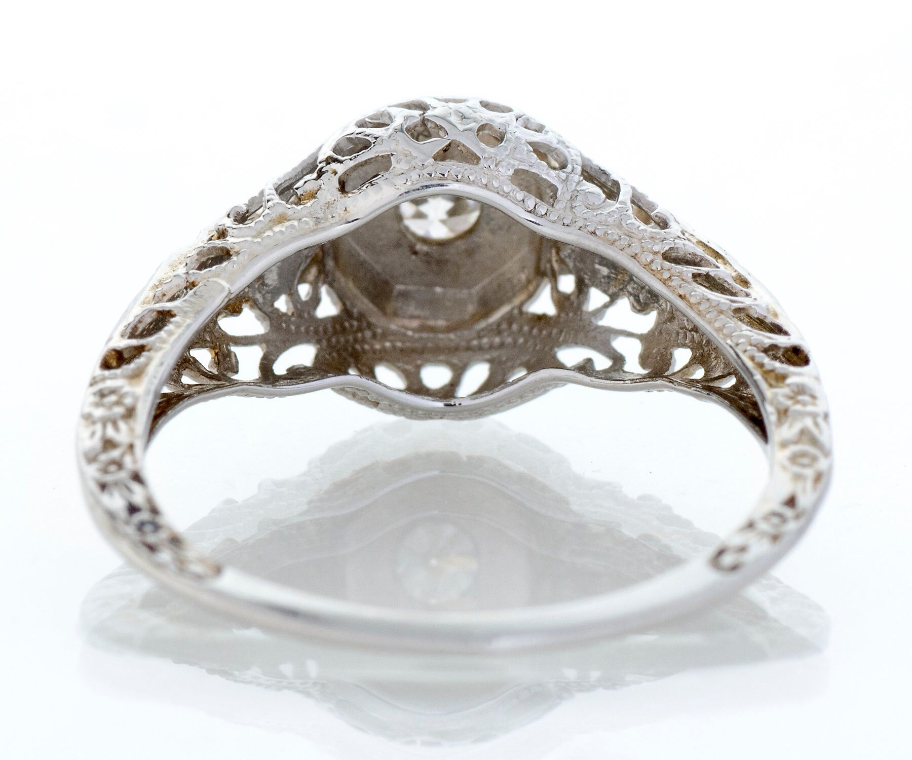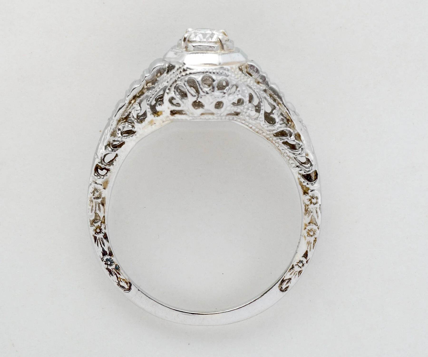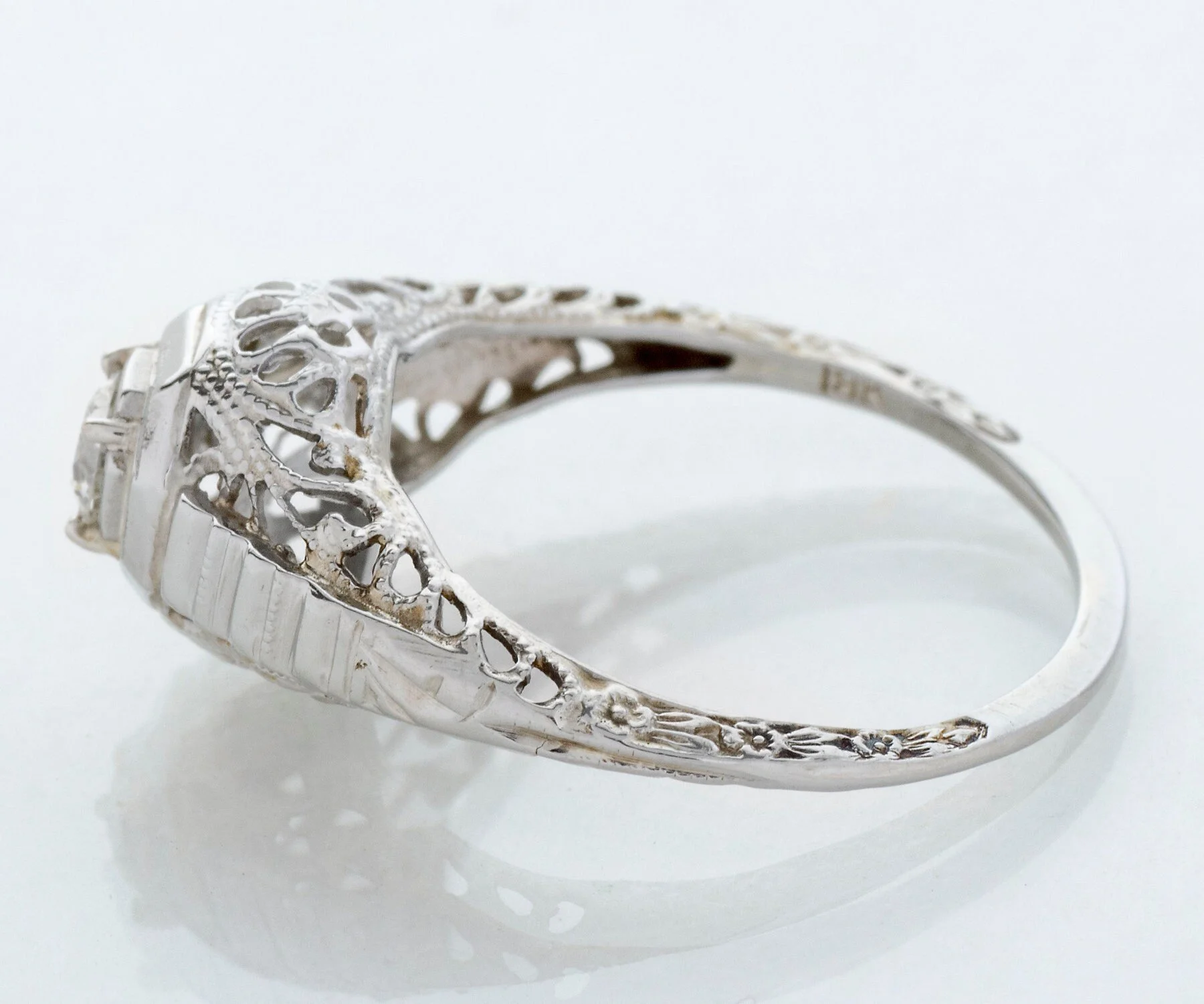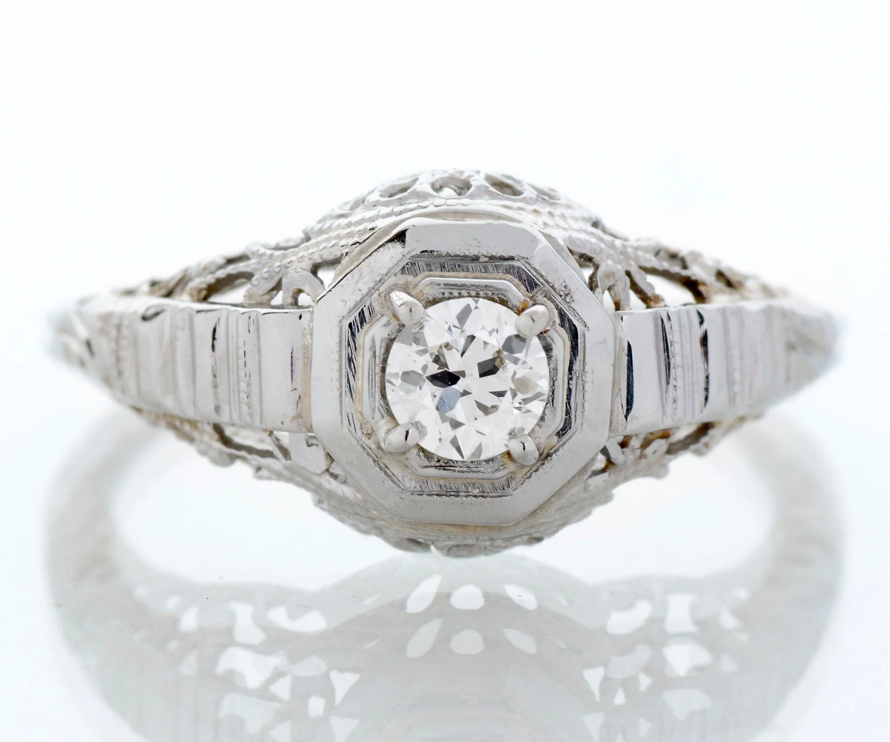 Antique Engagement Ring - Antique 1920's 18k White Gold Diamond Engagement Ring Early 1920's 18k White Gold European Cut Diamond =.18ct VS2/G Ring Size 5 3/8 (sizable) Ring measures approximately 9mm at center. Back of band measures .8mm in one direction and 1.4mm in the other.