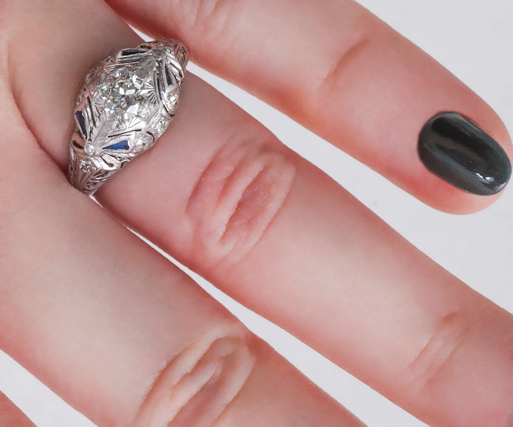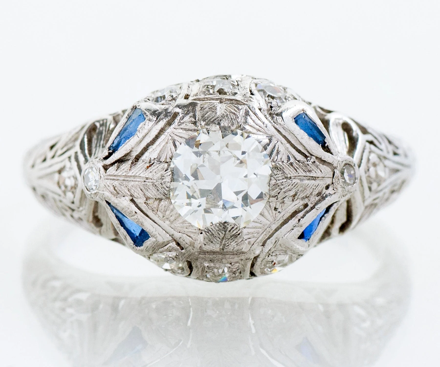 If you love blue and would love to have this color incorporated into your beloved engagement ring, take a good look at this antique beauty. In bright 18k white gold, this chunky little treasure holds an outstanding European cut diamond at its center with four synthetic blue sapphires accenting the sides. Just the right amount for a pop of a color you love! This heavily detailed ring includes filigree, ribbon detail and further diamond adornments that will catch everyone's eye and a wedding band need not be worn with it, although we do have a very nice collection of antique wedding bands that would pair beautifully!