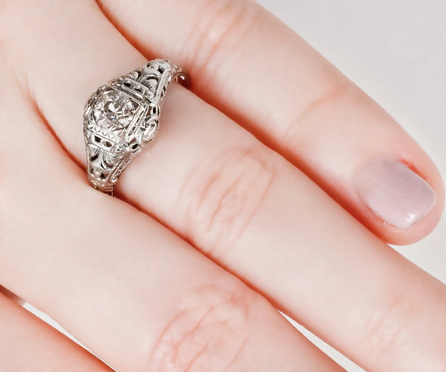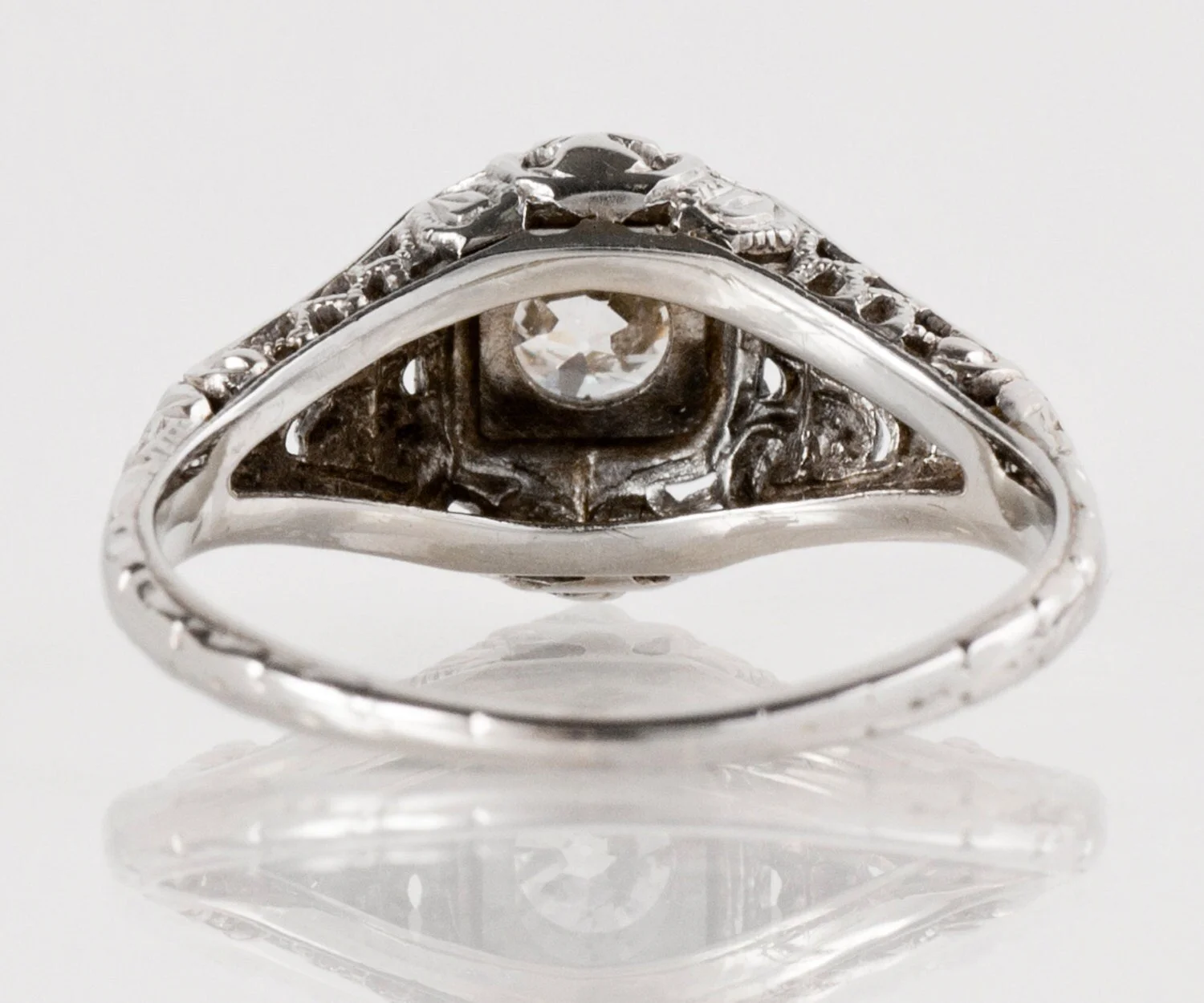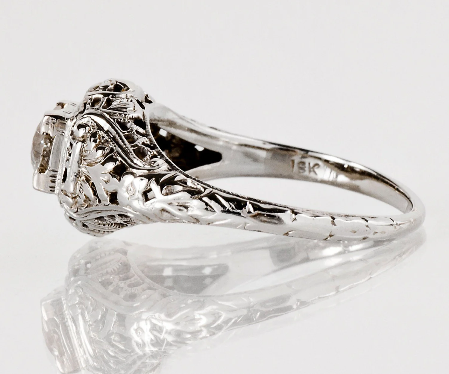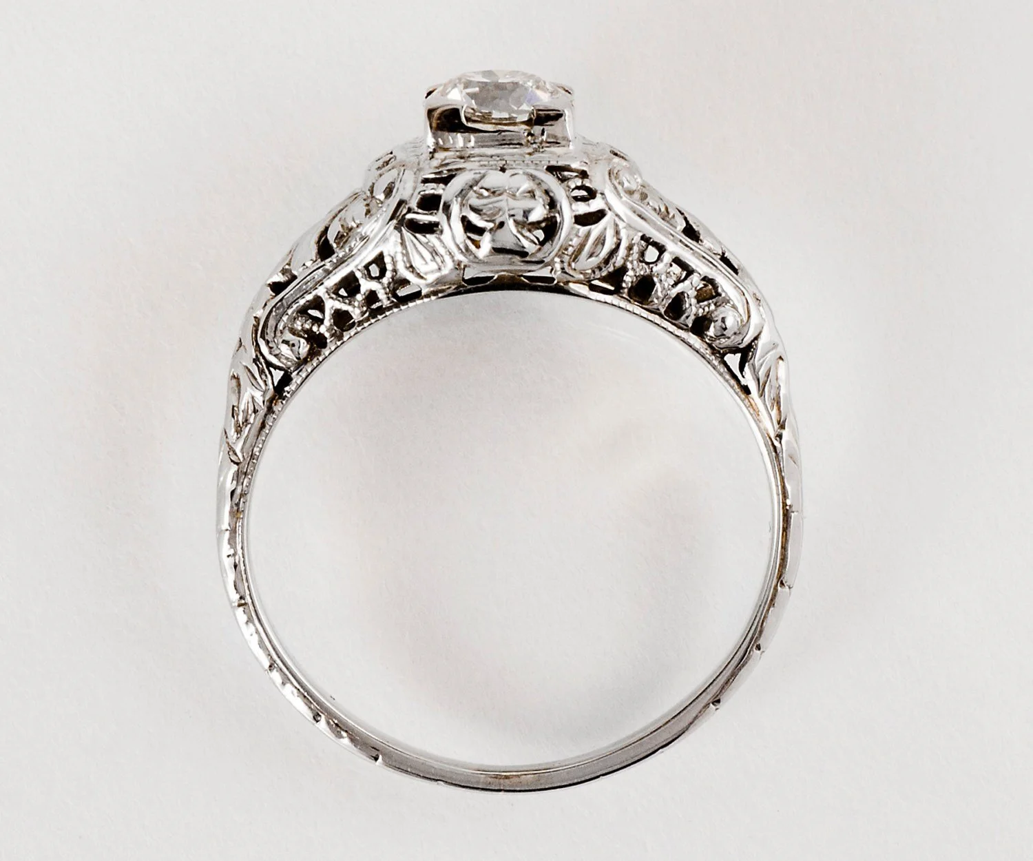 Glamorous and striking, this 1920s treasure is a true statement piece. A luminous .50ct European cut diamond sparkles brilliantly in an intricate white gold setting that enhances its dazzling charm. The gallery and shank of this magnificent ring feature graceful filigree and etch detailing in a floral motif that is absolutely breathtaking. This ravishing ring will suit an equally captivating bride-to-be.