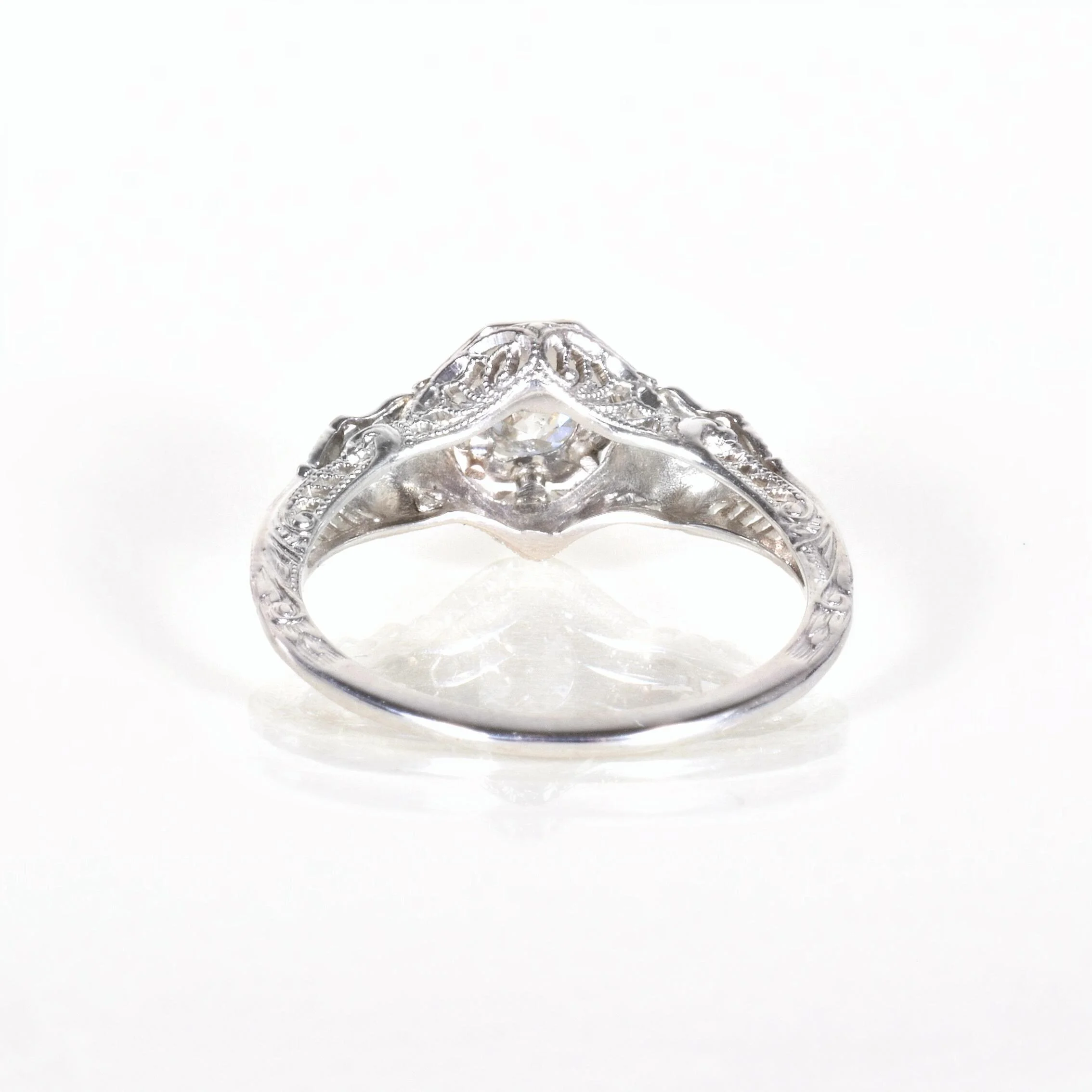 Antique Engagement Ring - Antique 1920's 18k White Gold JR Woods Diamond Ring Circa 1920's 18k White Gold JR Woods (manufacturer) European Cut Diamond =.43ct SI2/G Ring Size 5.75 (sizable) Ring measures approximately 8.5mm wide at center, back of band is 1.1mm wide.