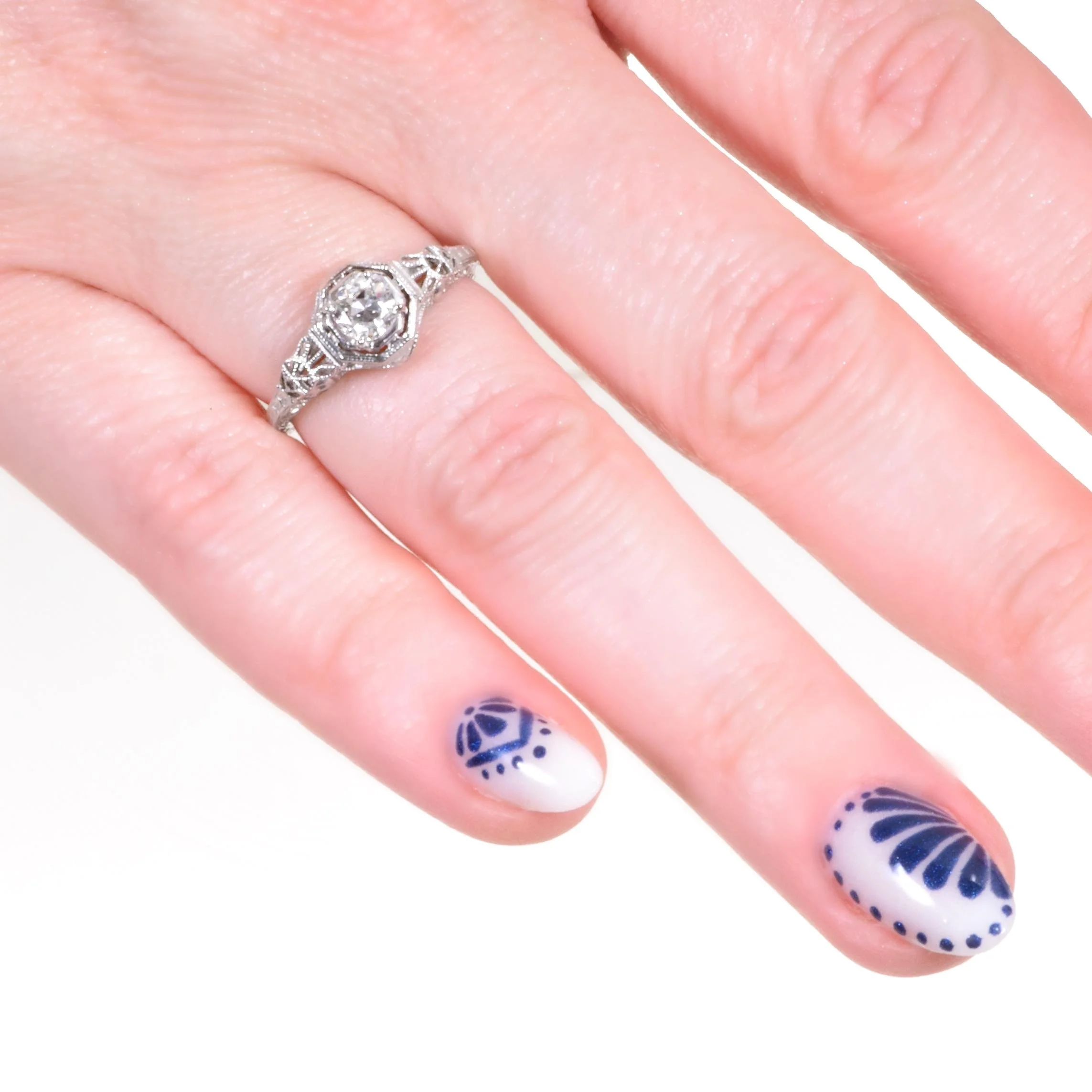 The J. R. Woods jewelry making company began creating bridal jewelry in the 1850's in Brooklyn, NY. This engagement ring from the 1920's is lovely in 18k white gold. This treasure shows off fabulous cut outs as well as an eye-catching octagonal setting displaying a stunning European cut diamond. Make it yours!