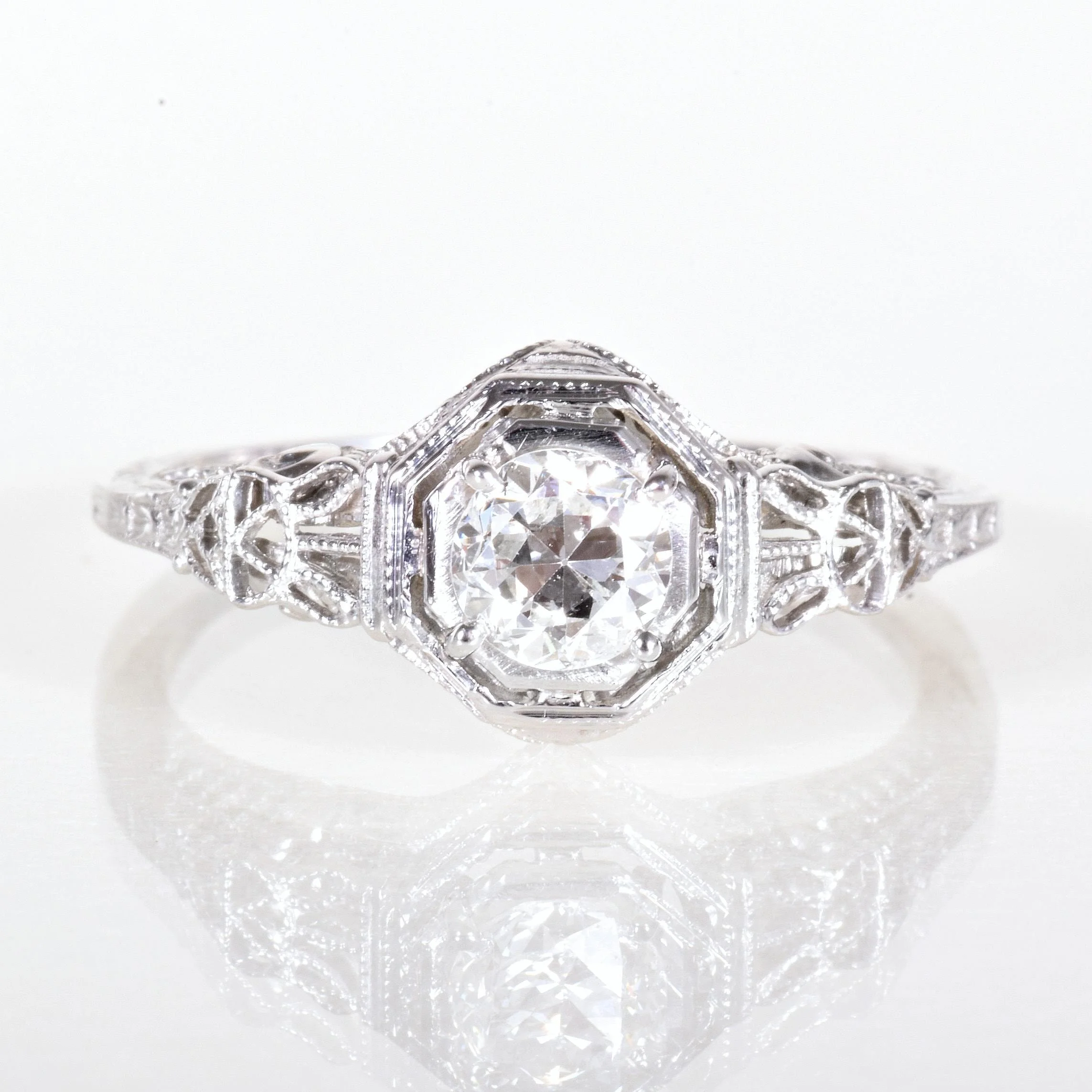 The J. R. Woods jewelry making company began creating bridal jewelry in the 1850's in Brooklyn, NY. This engagement ring from the 1920's is lovely in 18k white gold. This treasure shows off fabulous cut outs as well as an eye-catching octagonal setting displaying a stunning European cut diamond. Make it yours!