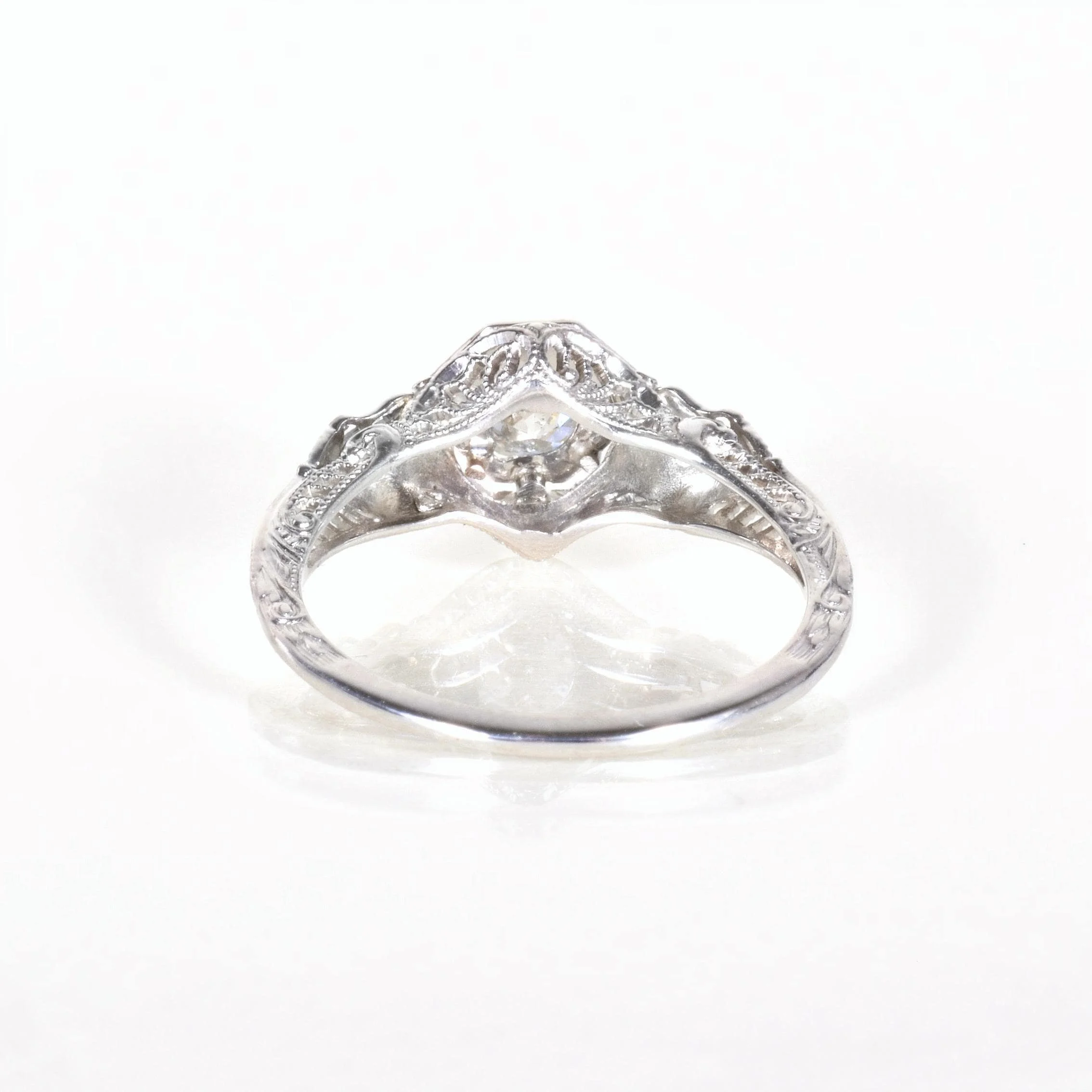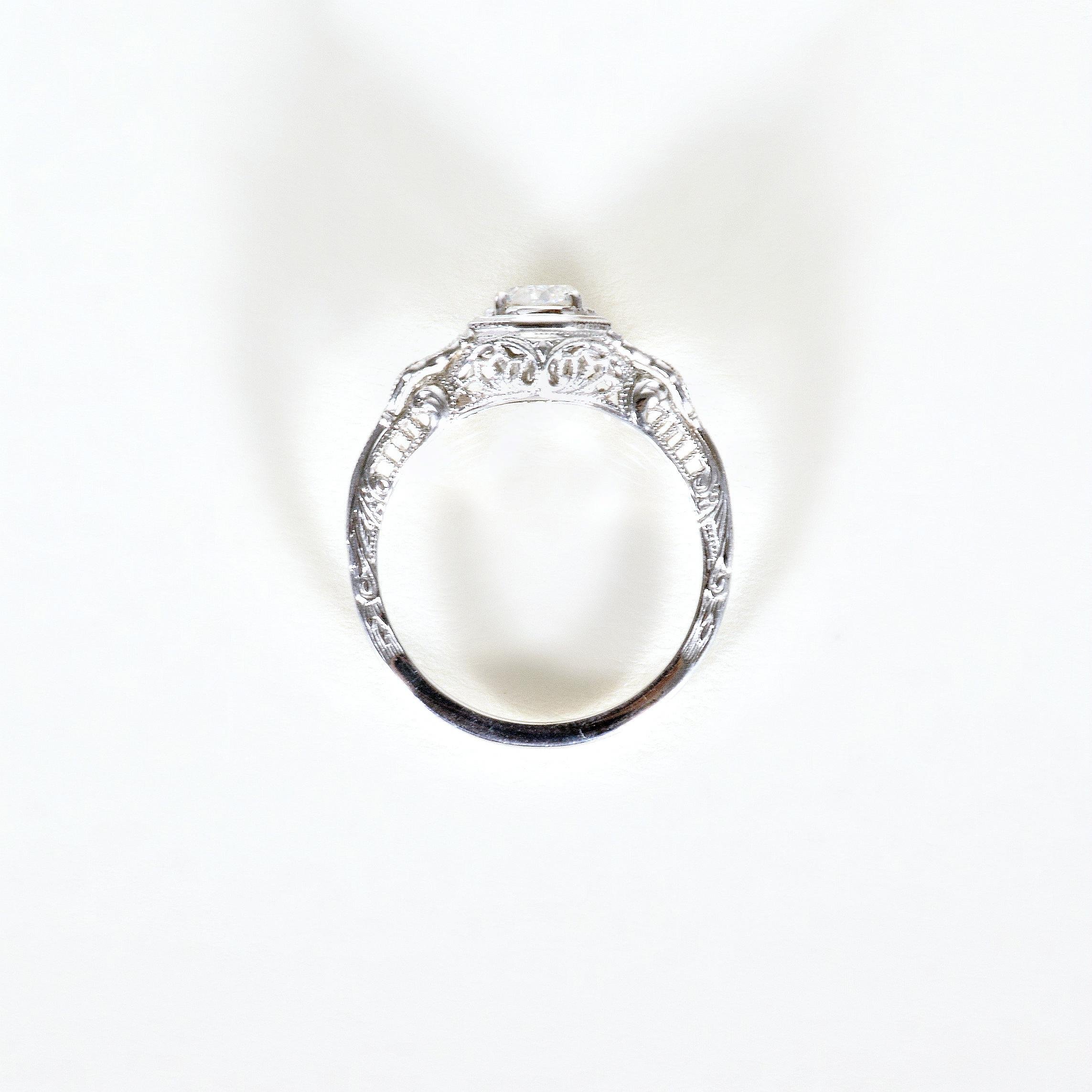 Antique Engagement Ring - Antique 1920's 18k White Gold JR Woods Diamond Ring Circa 1920's 18k White Gold JR Woods (manufacturer) European Cut Diamond =.43ct SI2/G Ring Size 5.75 (sizable) Ring measures approximately 8.5mm wide at center, back of band is 1.1mm wide.