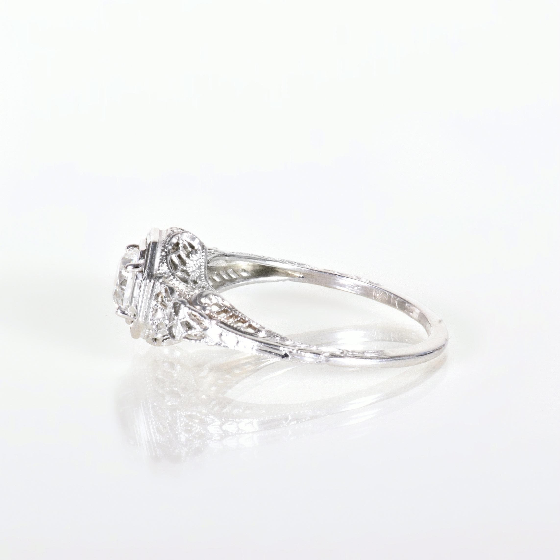 The J. R. Woods jewelry making company began creating bridal jewelry in the 1850's in Brooklyn, NY. This engagement ring from the 1920's is lovely in 18k white gold. This treasure shows off fabulous cut outs as well as an eye-catching octagonal setting displaying a stunning European cut diamond. Make it yours!