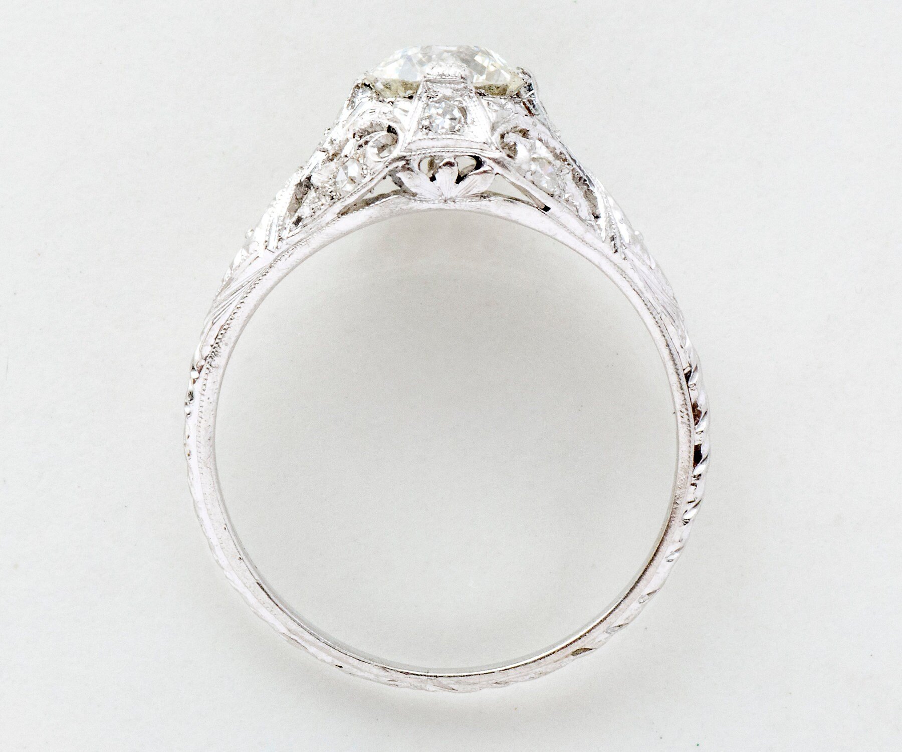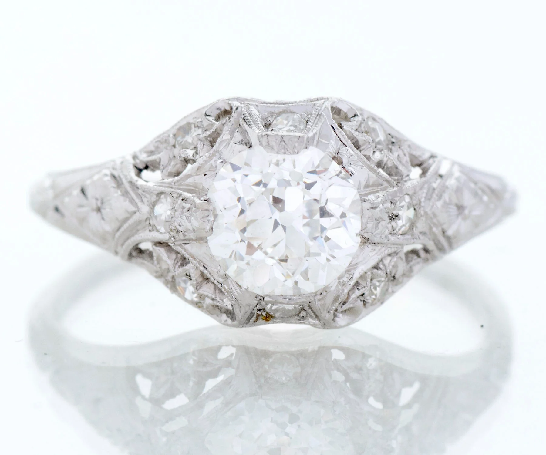 Antique Engagement Ring - Antique 1920's Platinum Diamond Engagement Ring 1920's Platinum European Cut Center Diamond =.87ct VS2/G 8 Single Cut Side Diamonds =.10ct VS/G-H Ring Size 7 (sizable) Ring measures approximately 9.1mm at center, back of band is 1.4mm wide.
