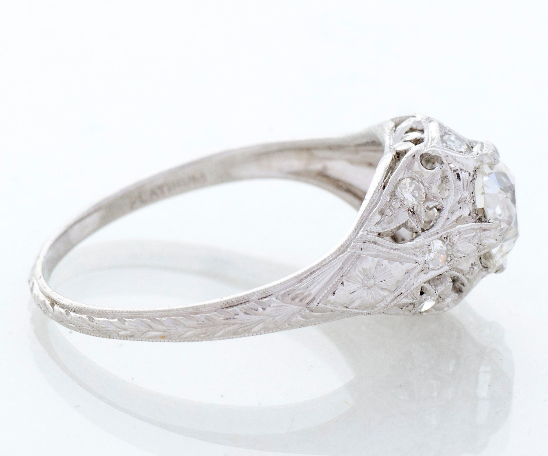 An outstanding European cut diamond sits pretty in the center of our simply stunning and decorative platinum setting from the 1920's. Eight tiny shimmering diamonds further enhance this charming antique. This ring is filled with amazing, crisp details as can be seen easily in our photos. The wheat pattern is included on the shank of the ring. The wheat pattern was thought to signify a few things including a bountiful harvest, a connection to the natural world and fertility!