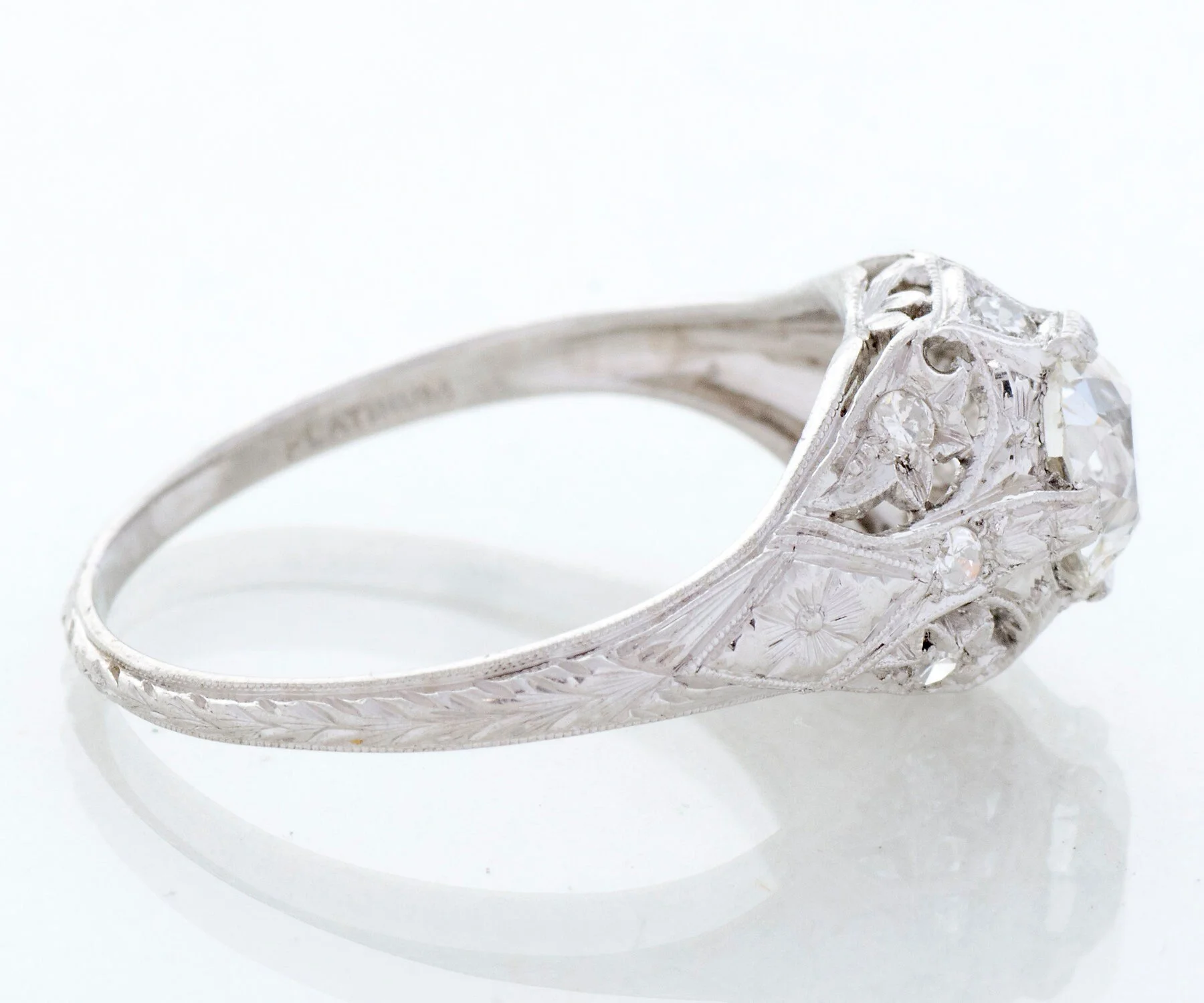 Antique Engagement Ring - Antique 1920's Platinum Diamond Engagement Ring 1920's Platinum European Cut Center Diamond =.87ct VS2/G 8 Single Cut Side Diamonds =.10ct VS/G-H Ring Size 7 (sizable) Ring measures approximately 9.1mm at center, back of band is 1.4mm wide.