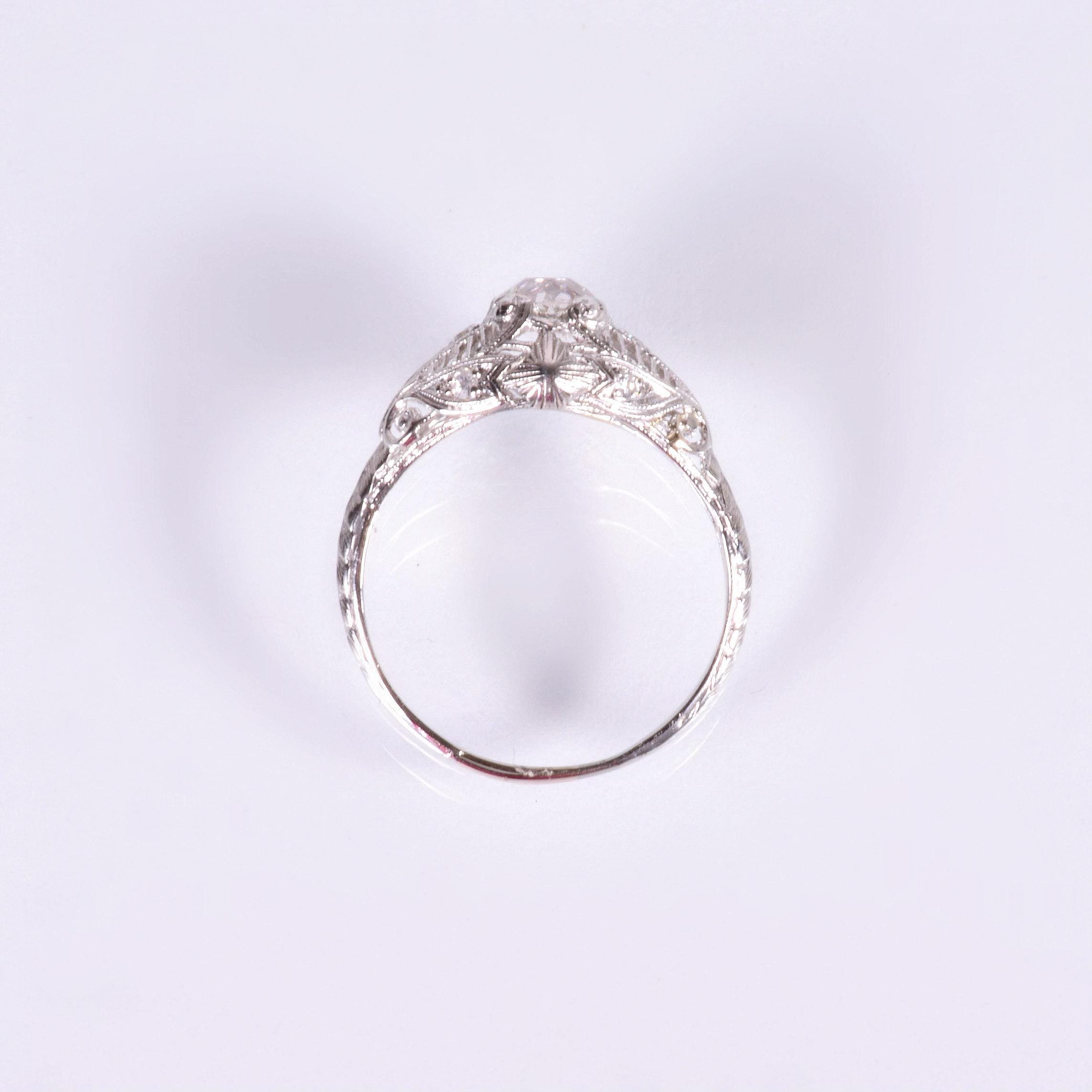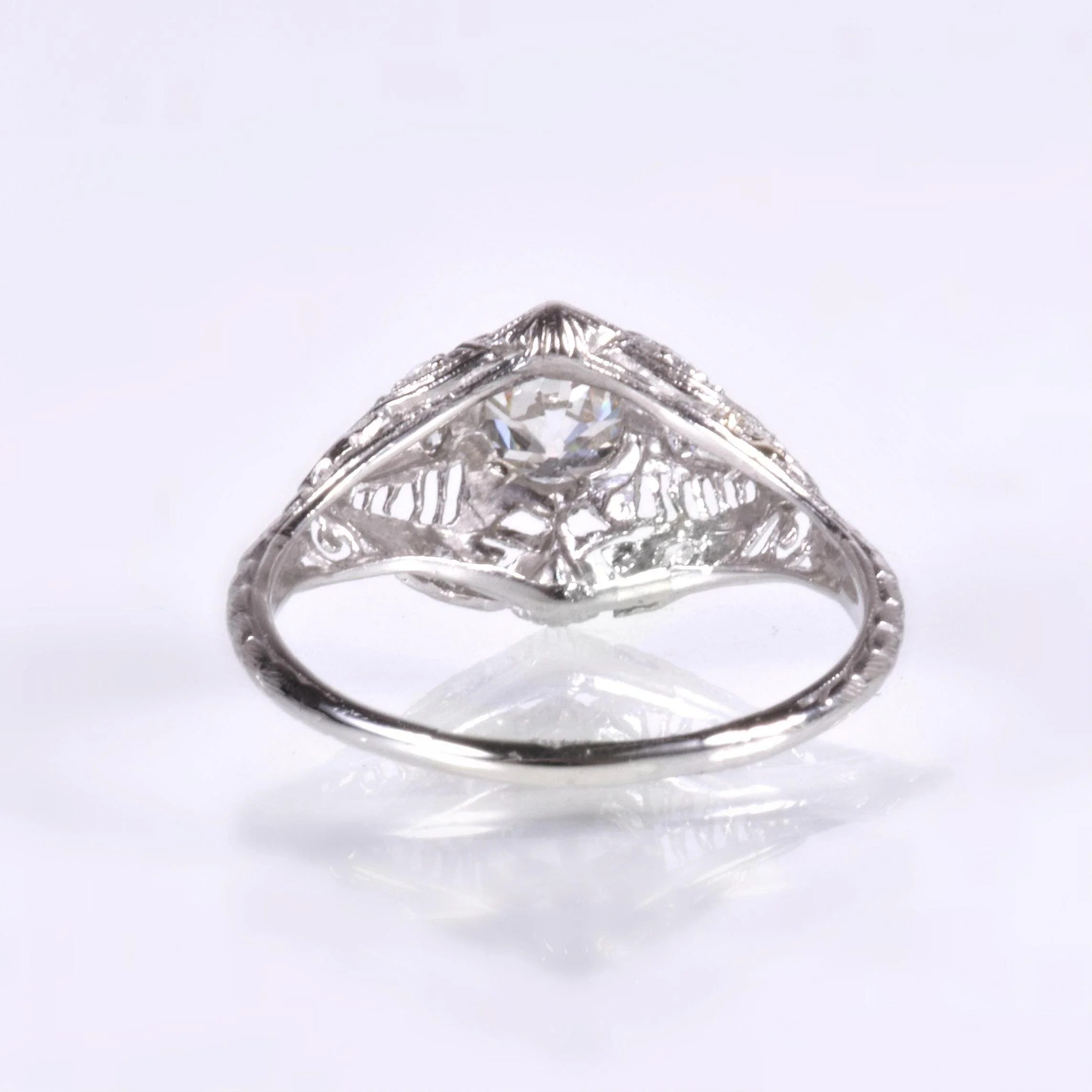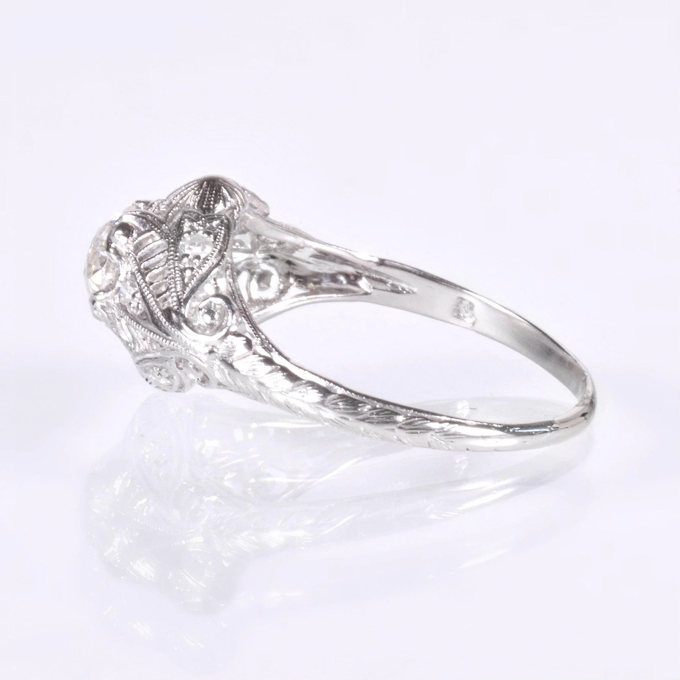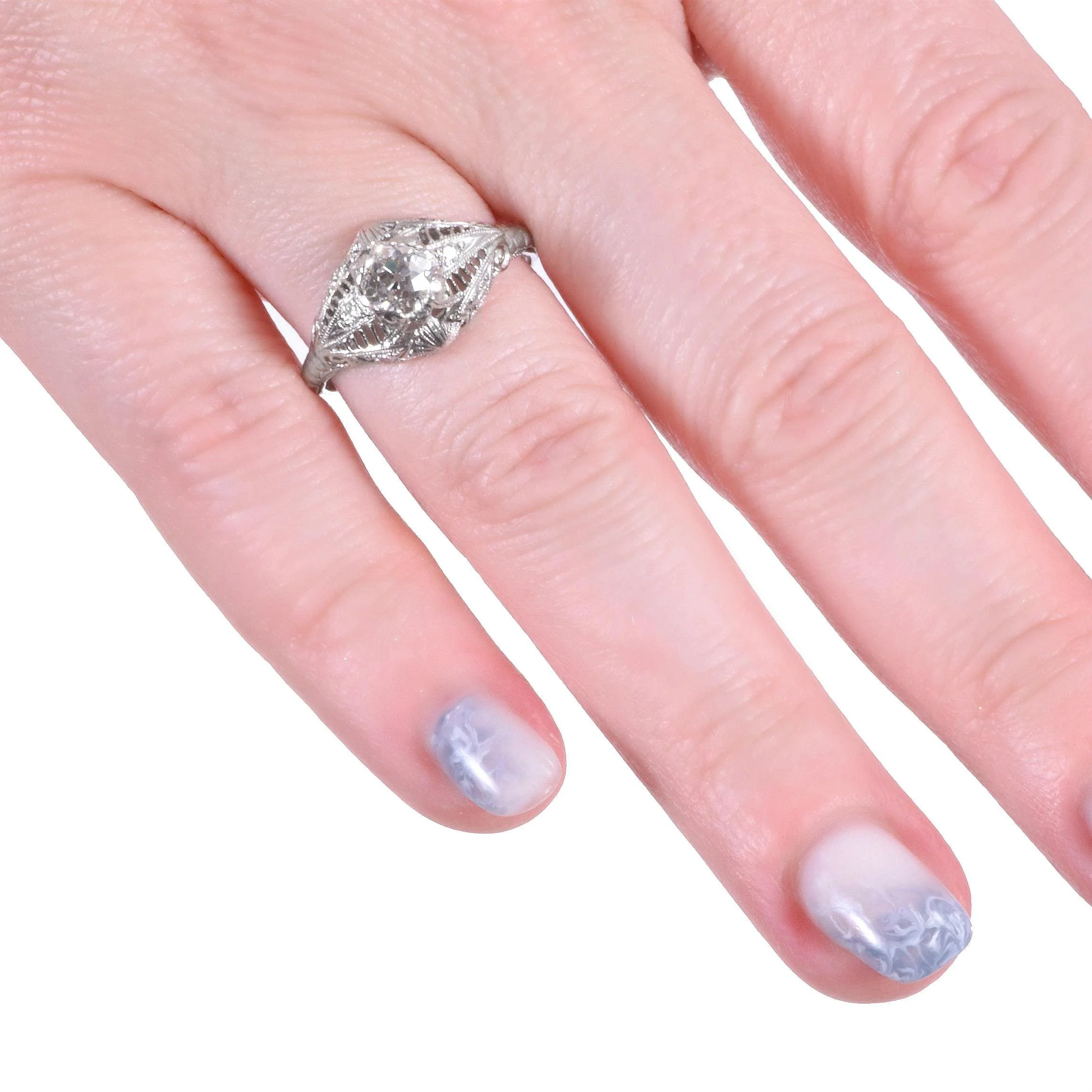 Dimensionally dome shaped and highly detailed is this 1920's treasure of a diamond engagement ring! In the midst of all the glory is a .69 carat European cut diamond that we have GIA certification on. Enhancing the lovely platinum setting are tiny European cut diamonds adding the perfect amount of extra glow. The wirer work in this ring is very obvious and outstanding. Both this characteristic, the fine engraving of leafy and scrolling designs and fine milgrain draw your eyes in and puts a smile on your face!
