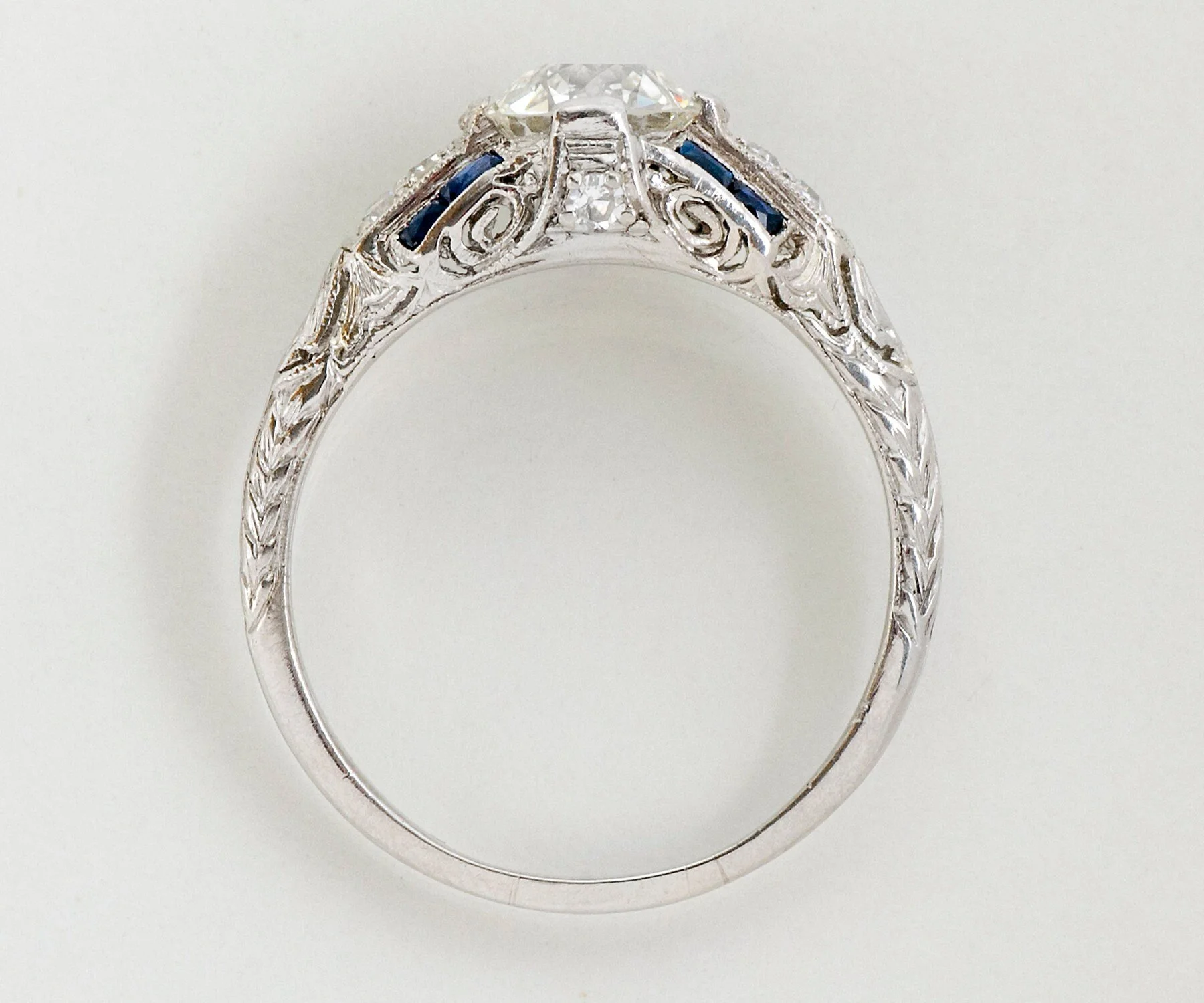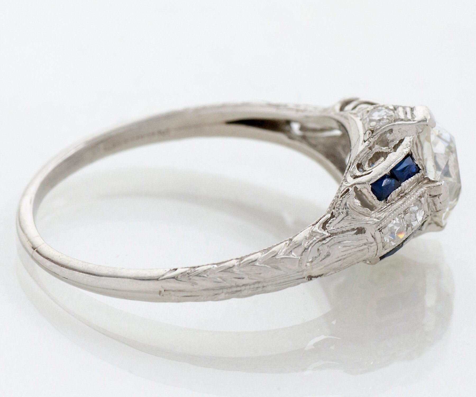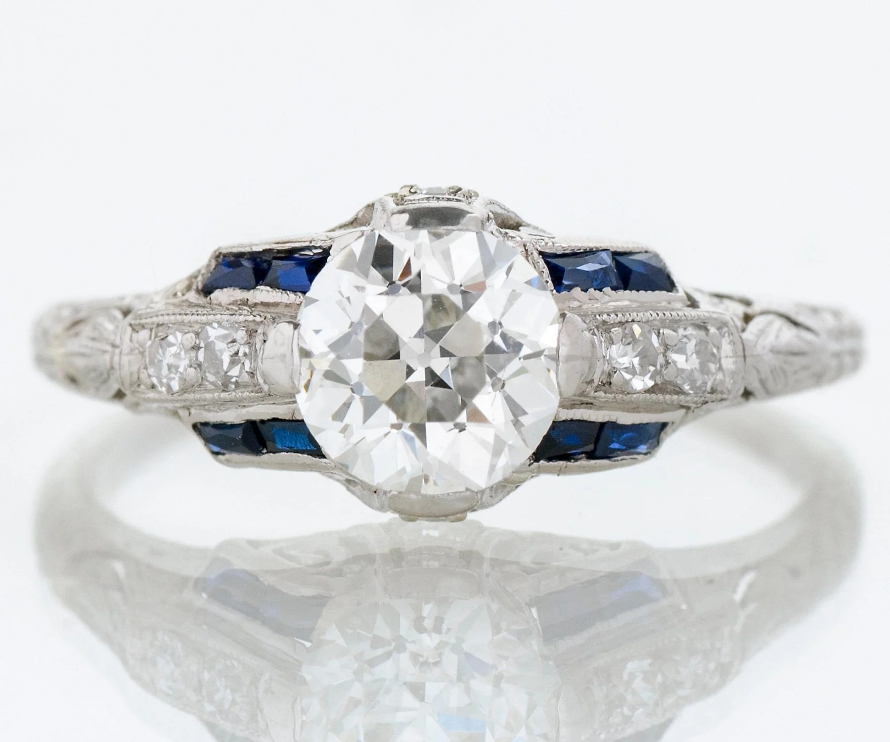 Antique Engagement Ring - Antique 1920's Platinum Diamond & French Cut Blue Sapphire Engagement Ring 1920's Platinum European Cut Center Diamond =1.31ct VVS2/I 6 Side Diamonds =.12ct 8 French Cut Blue Sapphires =.15ct Ring Size 8 3/8 (ring is sizable) Ring measures approximately 8.4mm at center, back of band is 1.4mm wide.