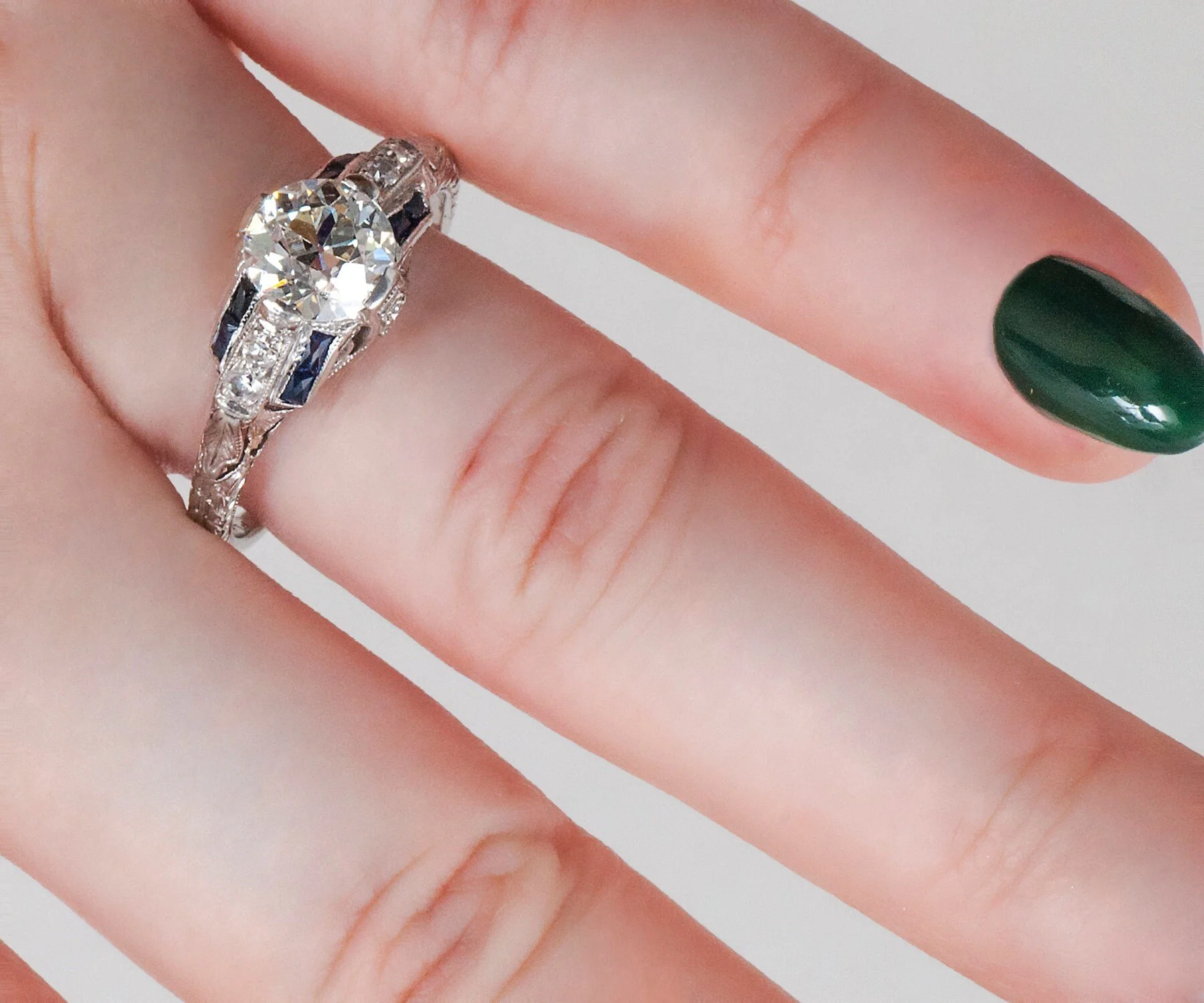 Although the middle European cut diamond at 1.31 carats is the center of attention here, the French cut blue sapphires on either side sure do shine as well! If you are a sapphire or blue girl, this may be the perfect antique engagement ring for you to wear and adore. Sparkling side diamonds accent this beauty of a ring as well, all set in a strong platinum. Loving this one in our shop.