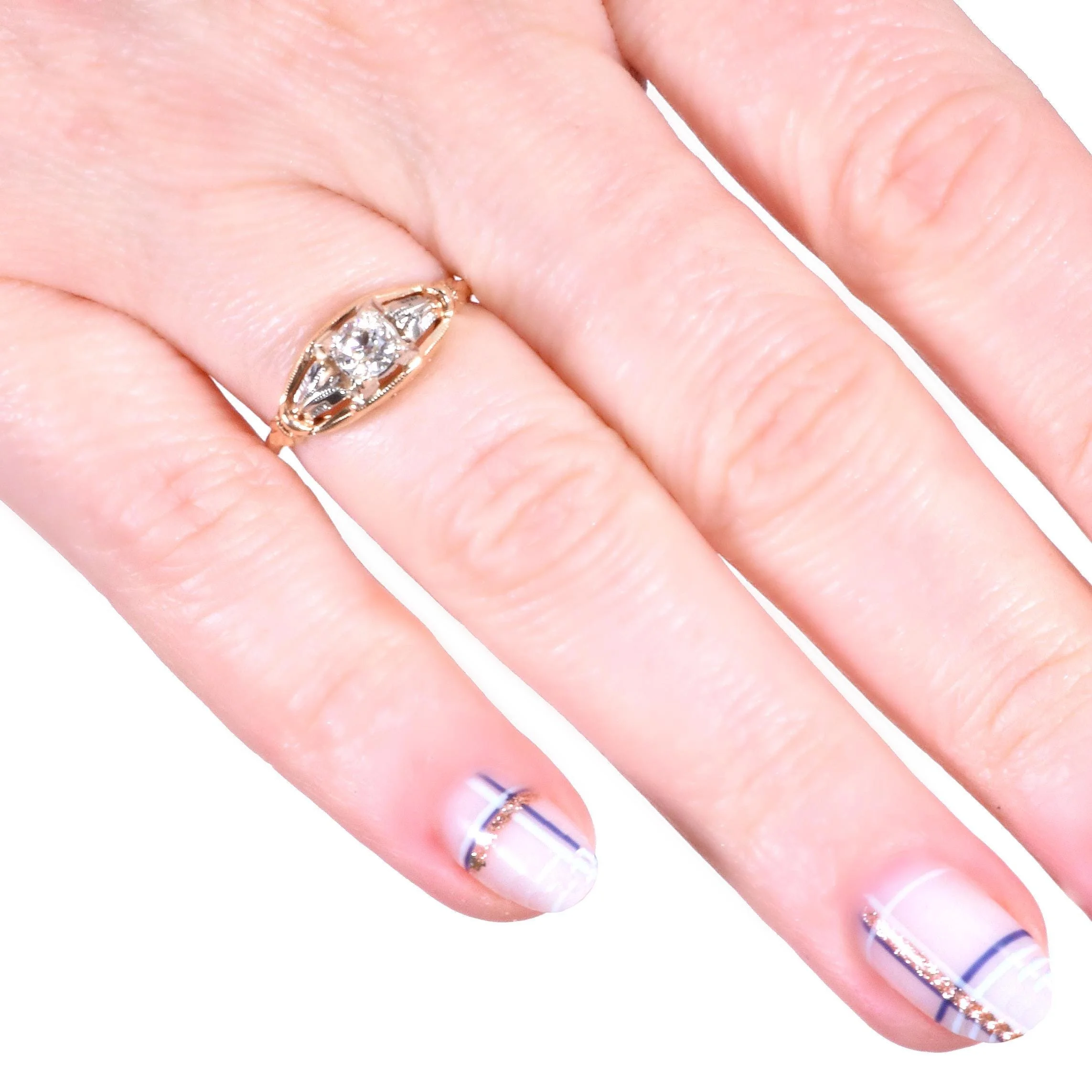 This luscious little antique beauty is more than ready to make its second debut in life with you! Charming is the perfect adjective to describe this beaming yellow and white gold diamond engagement ring from the 1930's. A lovely European cut diamond of just over a quarter carat shines brightly within our unique and airy setting. Pair this beauty with a band of any gold color, be it modern or antique.